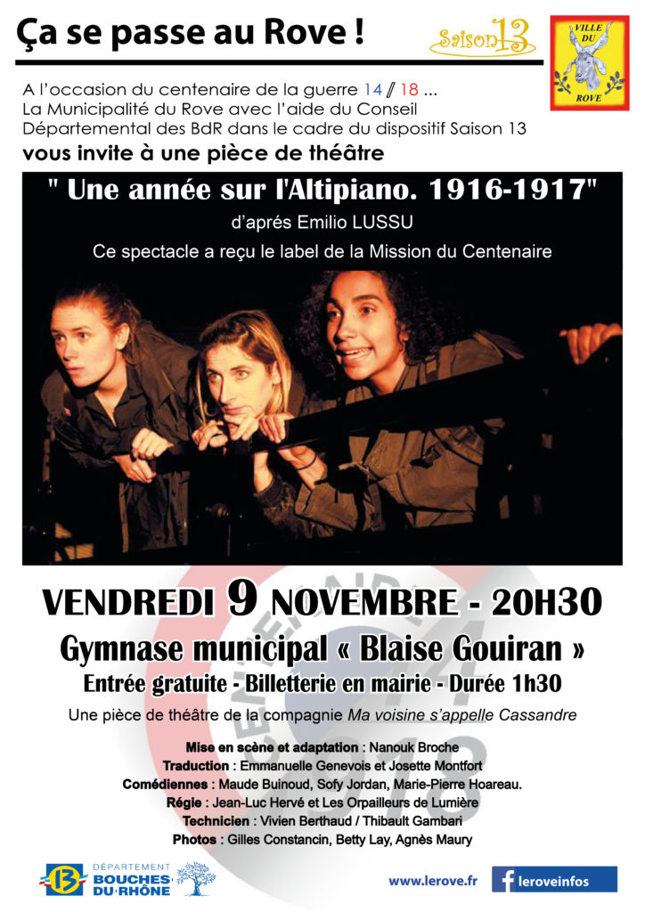 A l’occasion du centenaire de la guerre 14/18, la municipalité du Rove en partenariat avec le département des Bouches-du-Rhône, dans le cadre du dispositif Saison 13, propose une pièce de théâtre