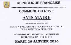 Suite à une journée de grève nationale de la fonction publique, le personnel municipal informe qu'il sera en grève Mardi 26 janvier 2016 En conséquence: Le restaurant scolaire La garderie du matin et du soir Le périscolaire ne fonctionneront pas Les services: Restaurant administratif et des retraités Administratif Service technique Bibliothèque Police municipale seront fermés au public. Toutes les activités ...