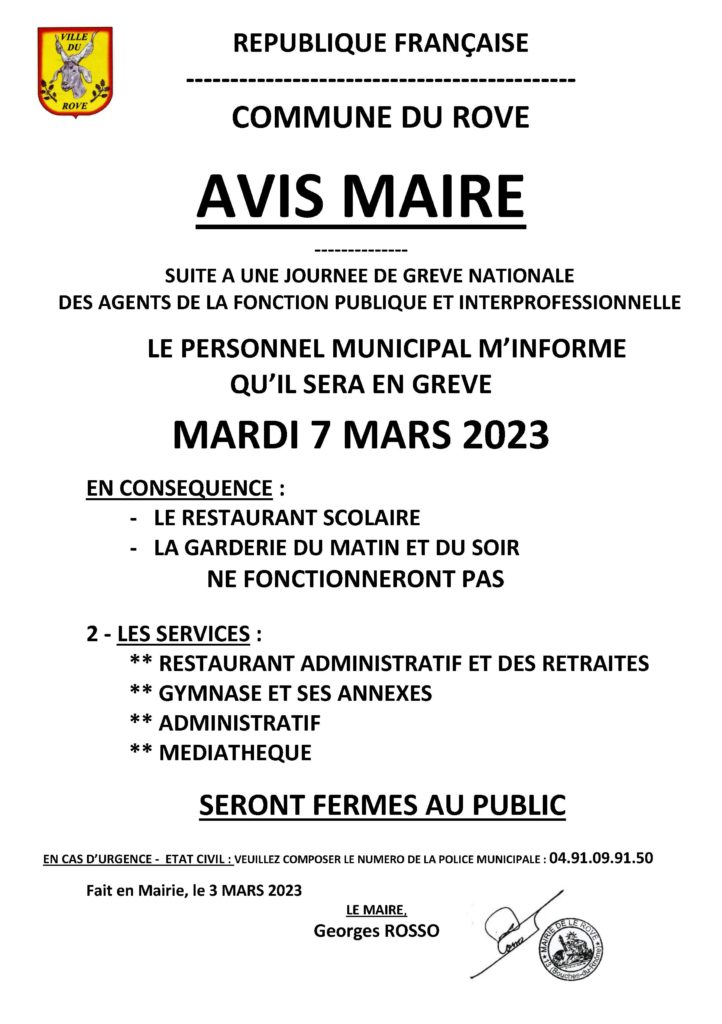Suite à une journée de grève nationale des agents de la fonction publique et interprofessionnelle, le personnel municipal sera en grève le MARDI 7 MARS 2023.