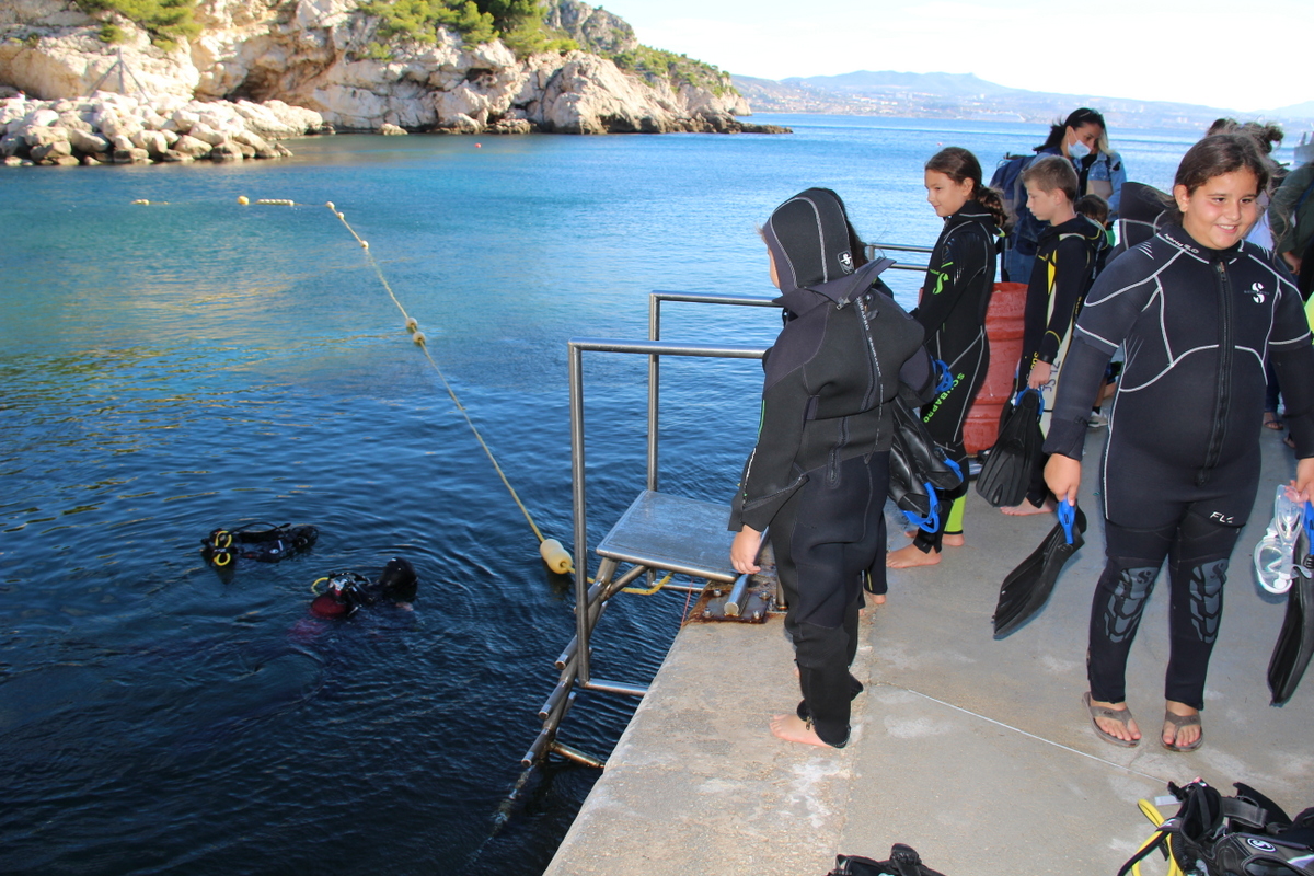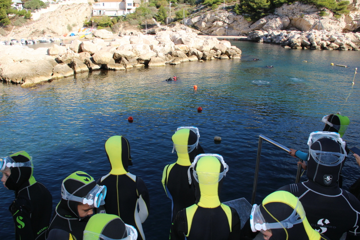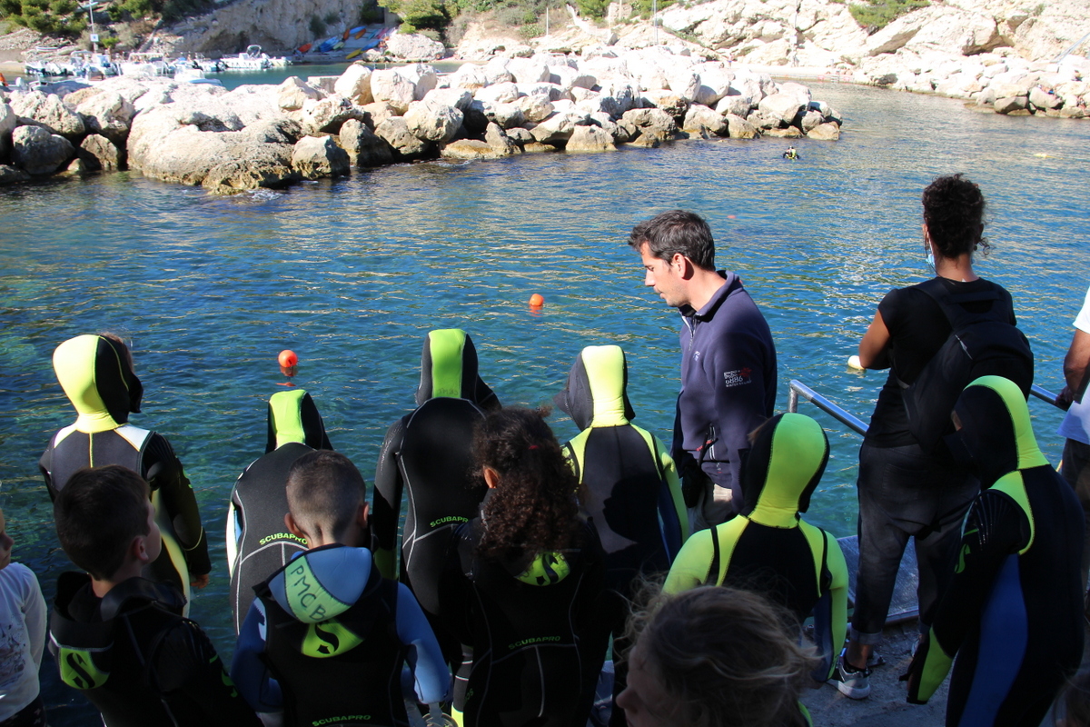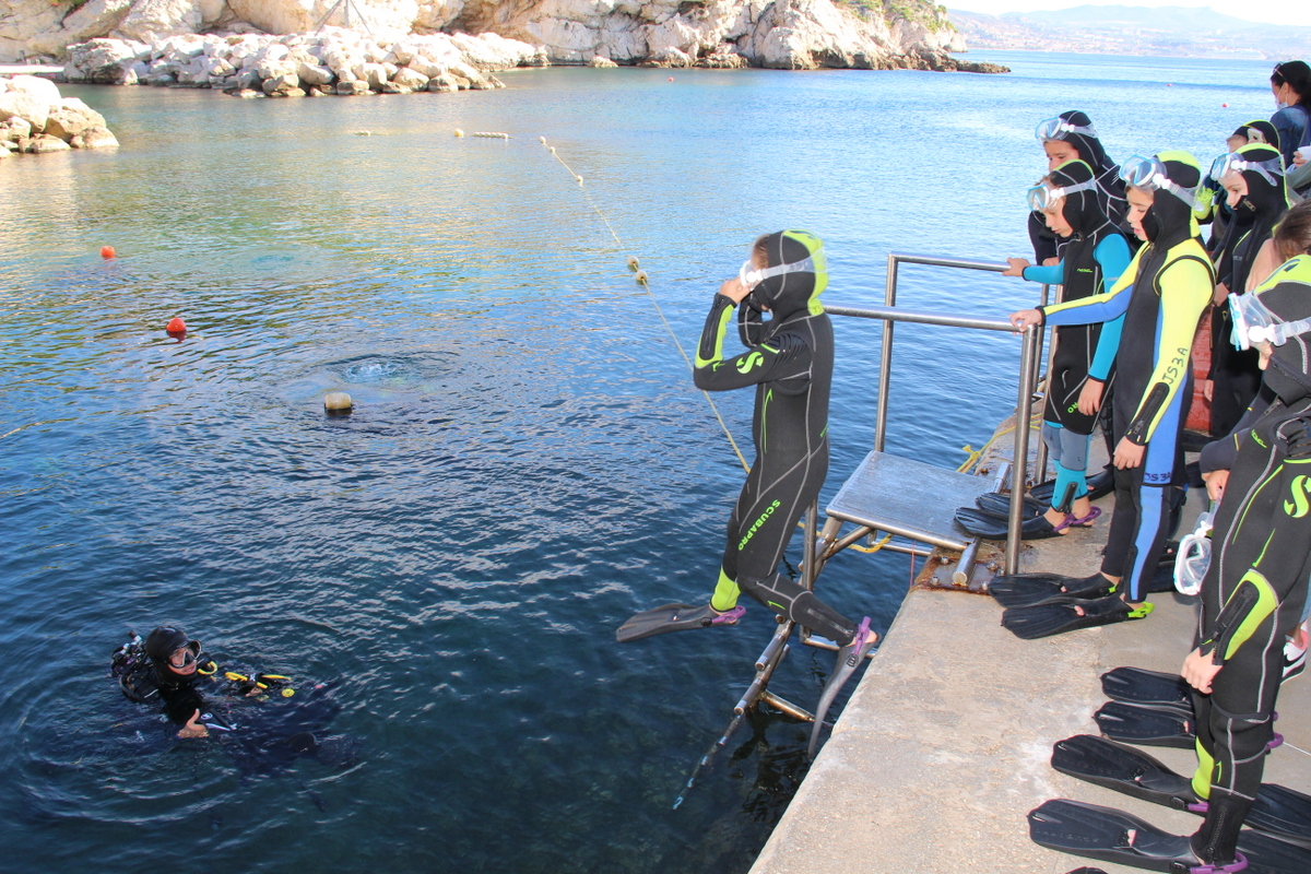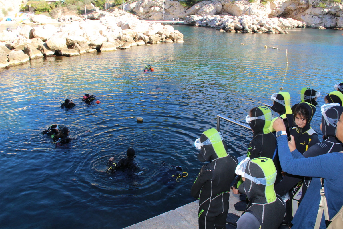 Mercredi 29 septembre, 36 élèves (29 cm1 de mme Gianazzi + 7 cm1 de M. Guevara) ont effectué leur baptême de plongée sur le quai du centre UCPA de Niolon, dans le cadre des classes de mer financées par la municipalité du Rove et organisées en partenariat avec le parc marin de la côte bleue.