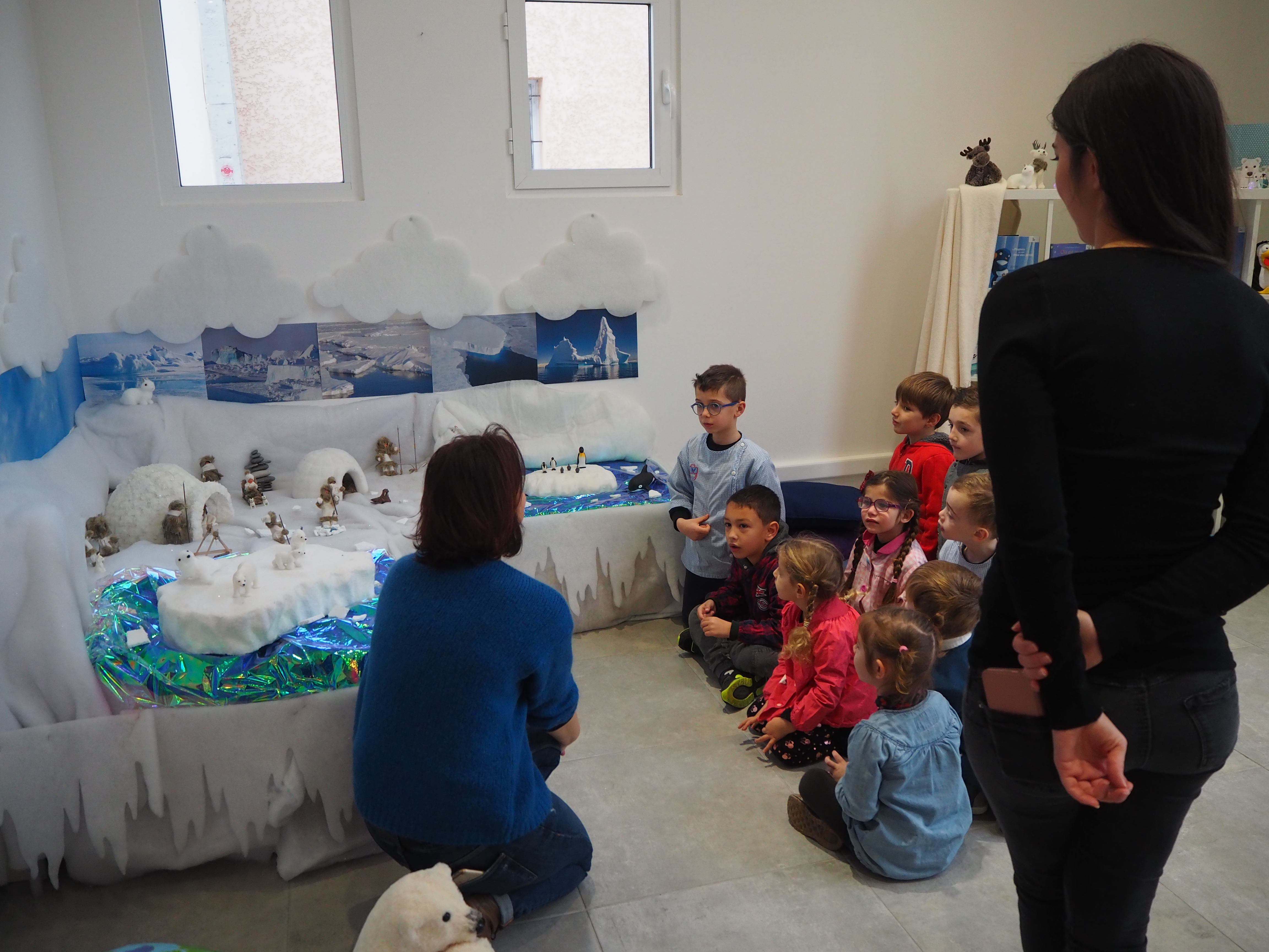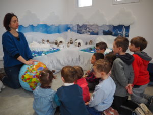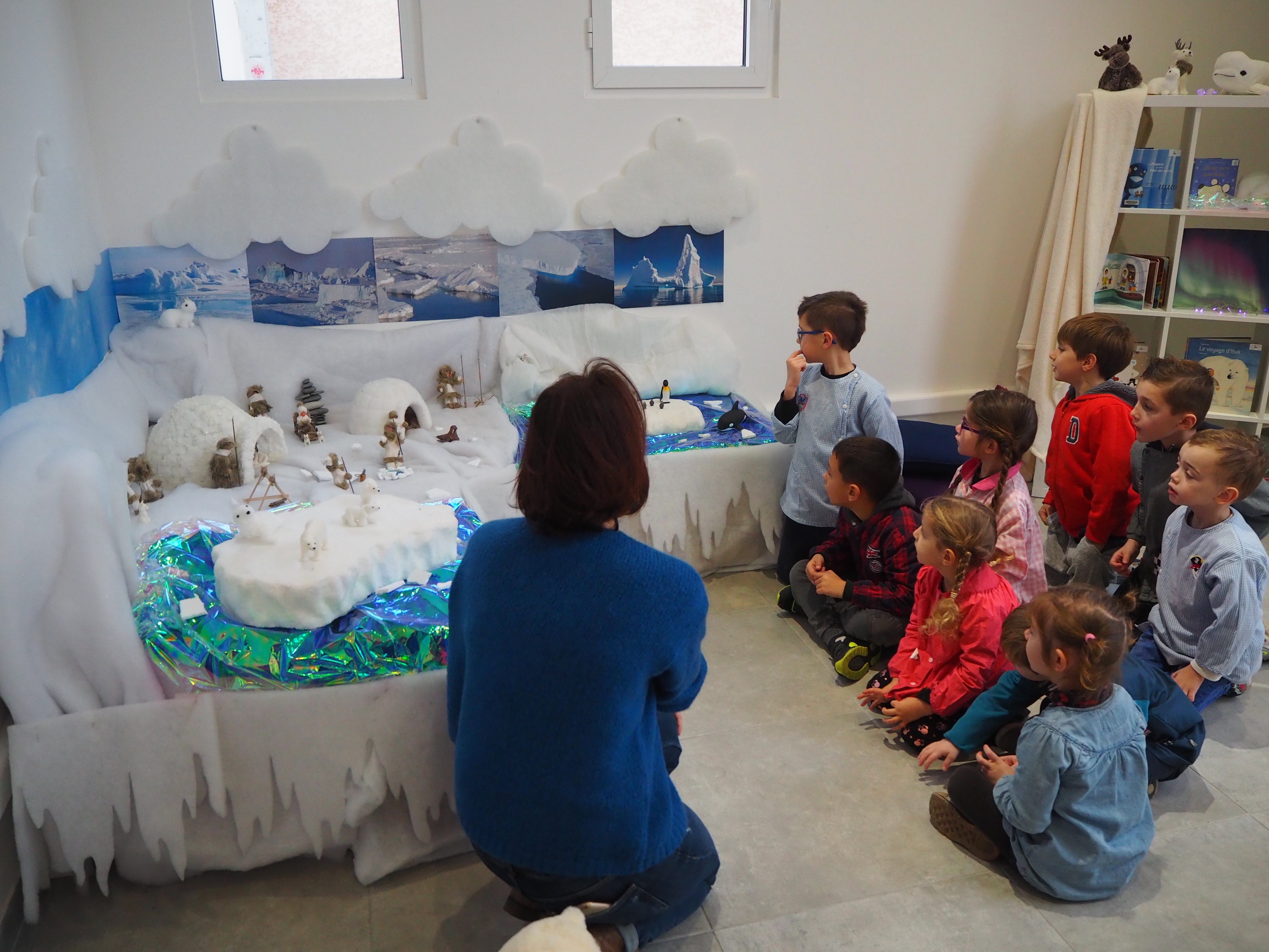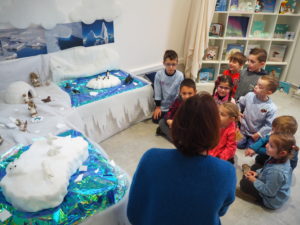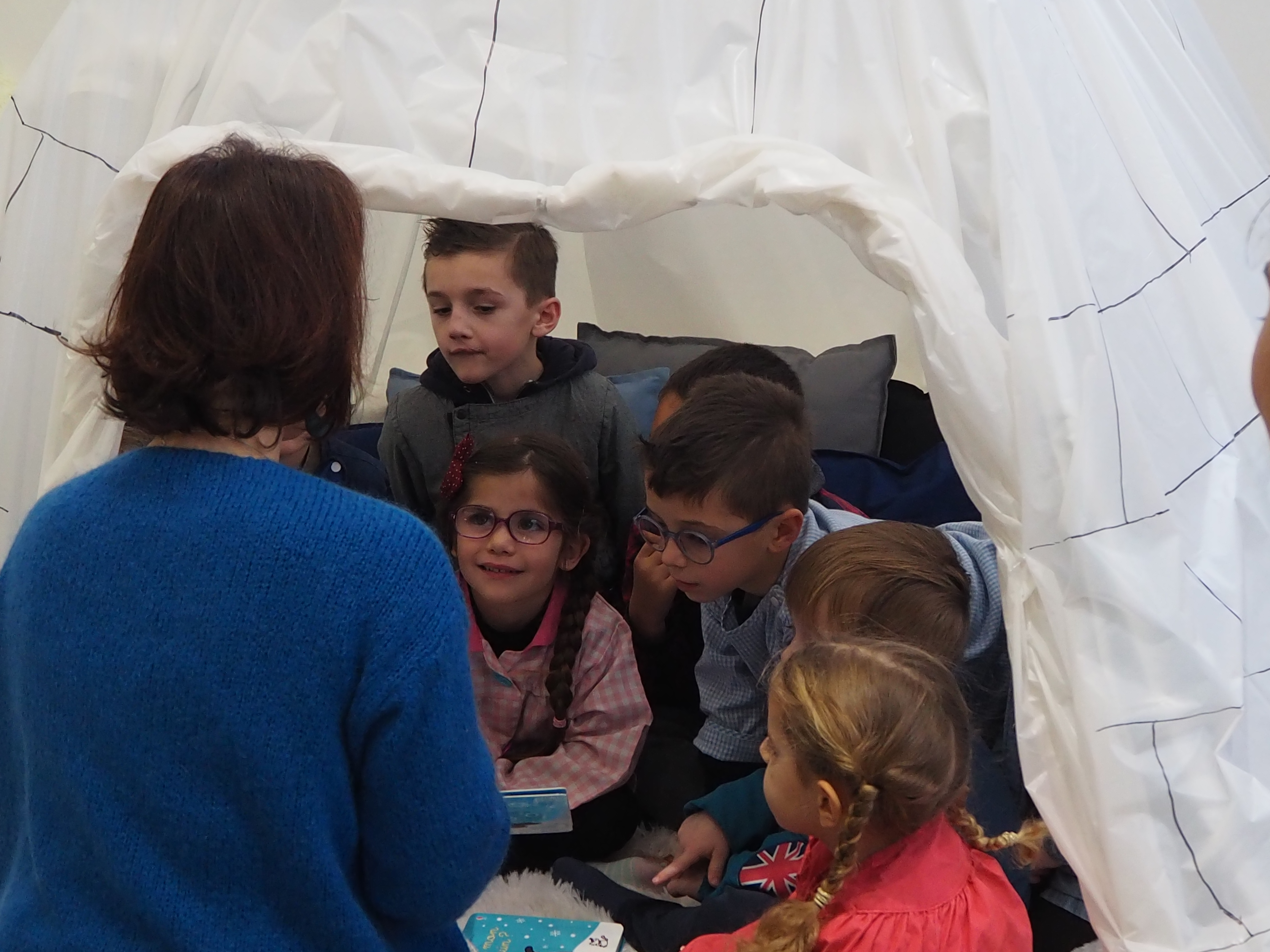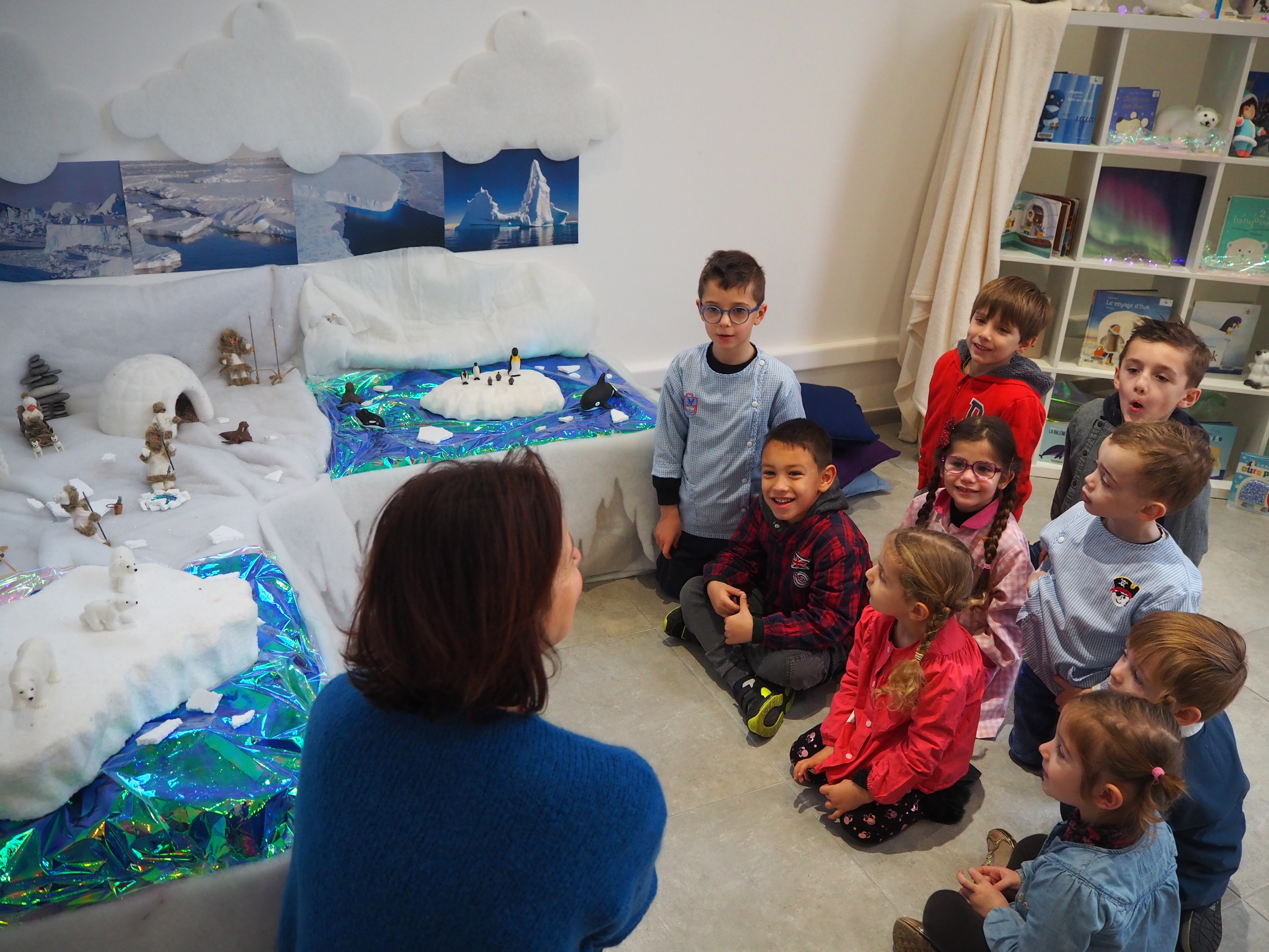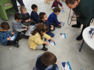 Dans un premier temps, l’enseignant a fait découvrir aux élèves la mise en scène sur la banquise aménagée spécialement à la médiathèque. Découverte du paysage et des animaux du pôle Nord.  Puis, une séance de lecture en lien avec la thématique animée par Gaëlle s’est tenue dans l’igloo, pour le plus grand plaisir des enfants.