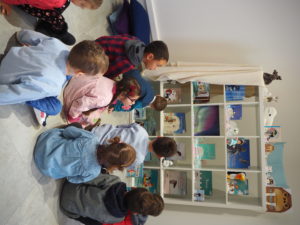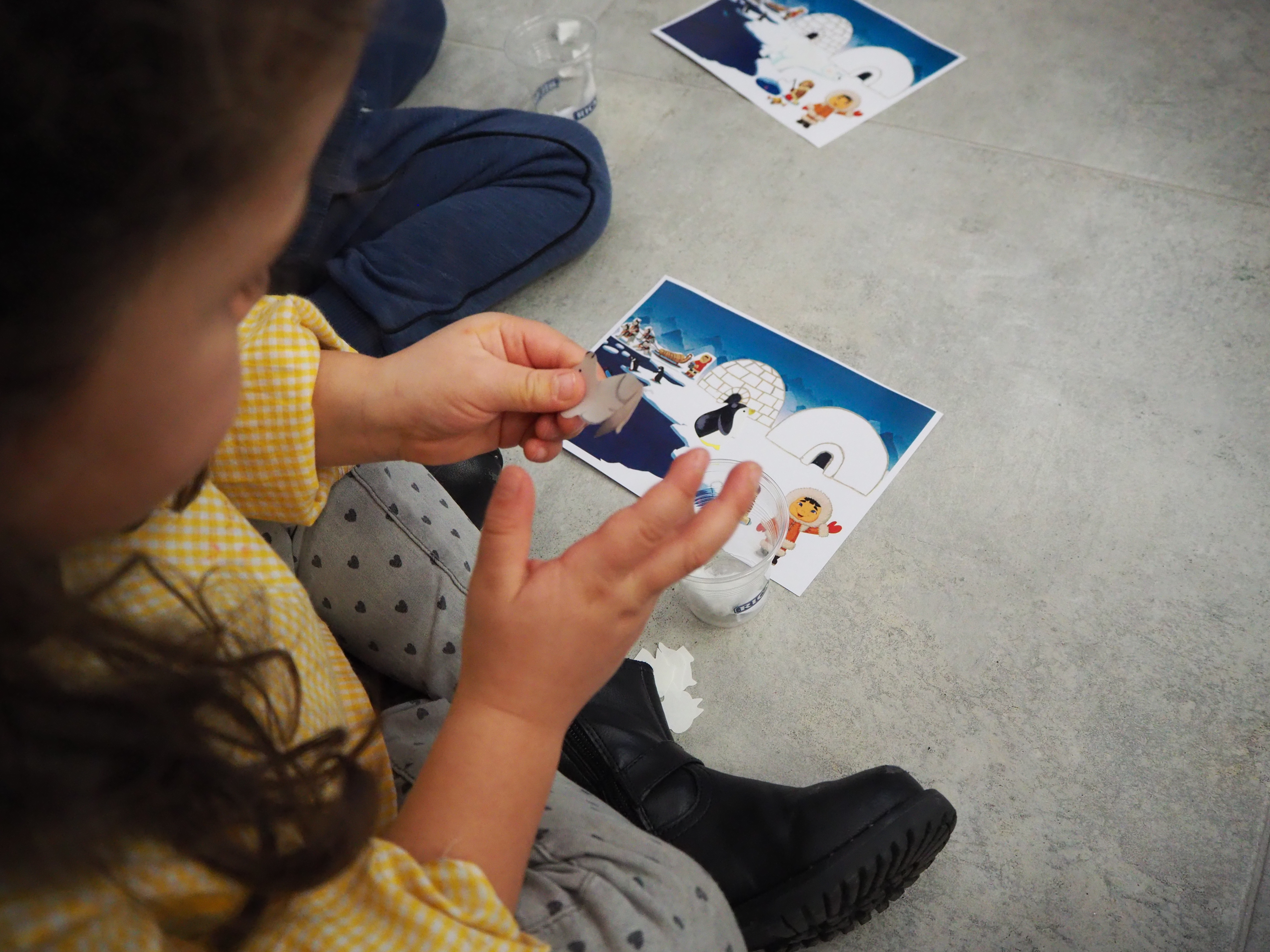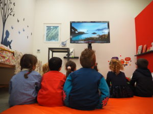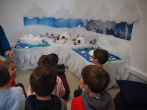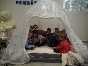 Les élèves ont été répartis en trois groupes pour participer en alternance à chacun des ateliers  proposés : L’igloo à histoires, un atelier pour réaliser une carte postale banquise et une séance d’un film d’animation.