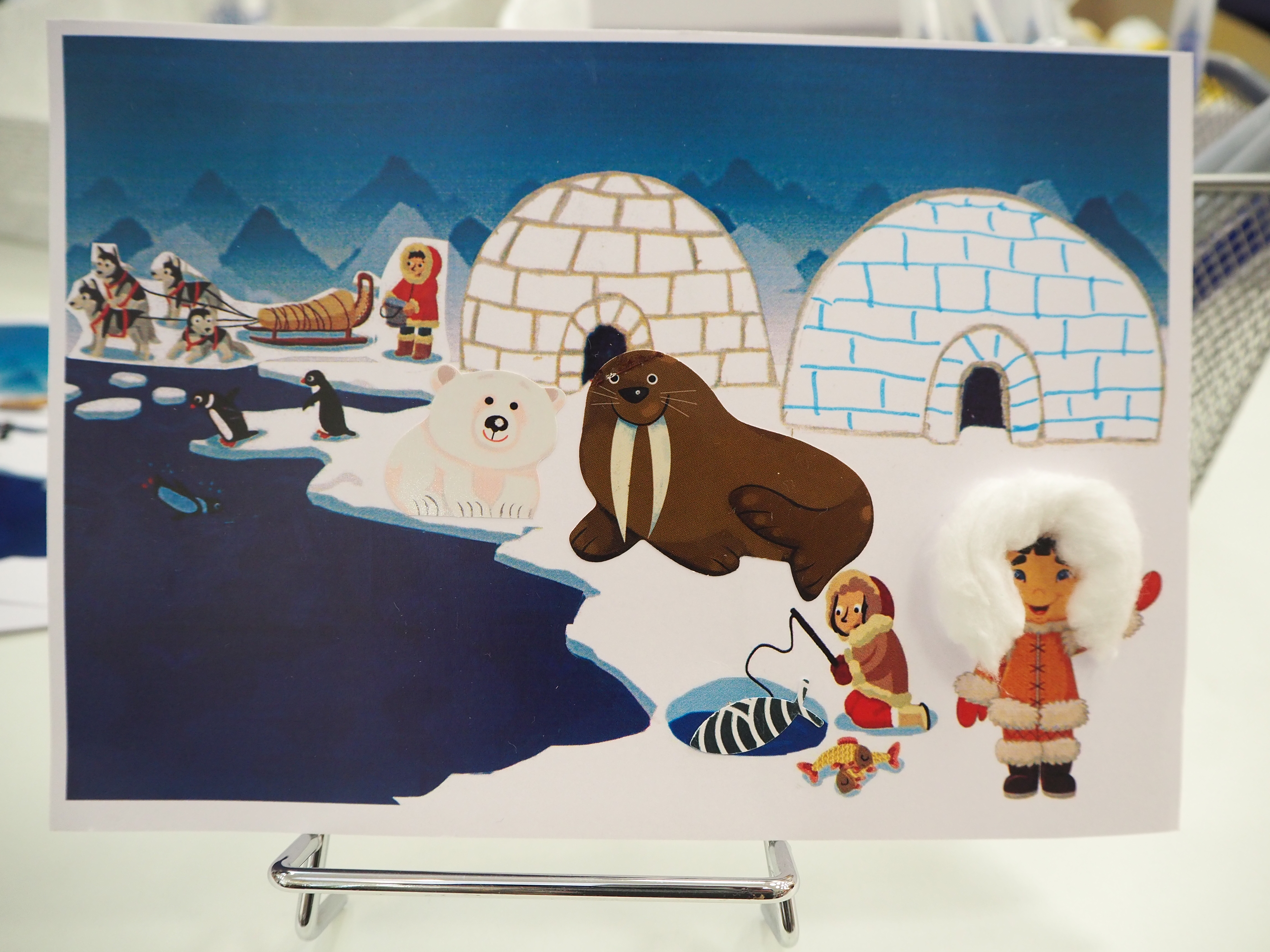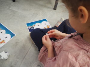 Nathalie a animé un atelier pour permettre aux élèves de finaliser la carte postale du pôle Nord (plusieurs étapes en fonction des niveaux). Le travail pourra se terminer en classe et se poursuivre avec un travail d’écriture de la carte.