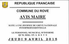 En raison du préavis de grève nationale interprofessionnelle pour le jeudi 9 avril, le restaurant scolaire, la garderie du matin et du soir, le périscolaire ne fonctionneront pas. Les services : restaurant administratif et des retraités, administratif, techniques et police municipale, seront fermés. Le complexe sportif "Blaise Gouiran" sera fermé. Les activités sportives sont annulées. En cas d’urgence Etat-civil, composer le ...