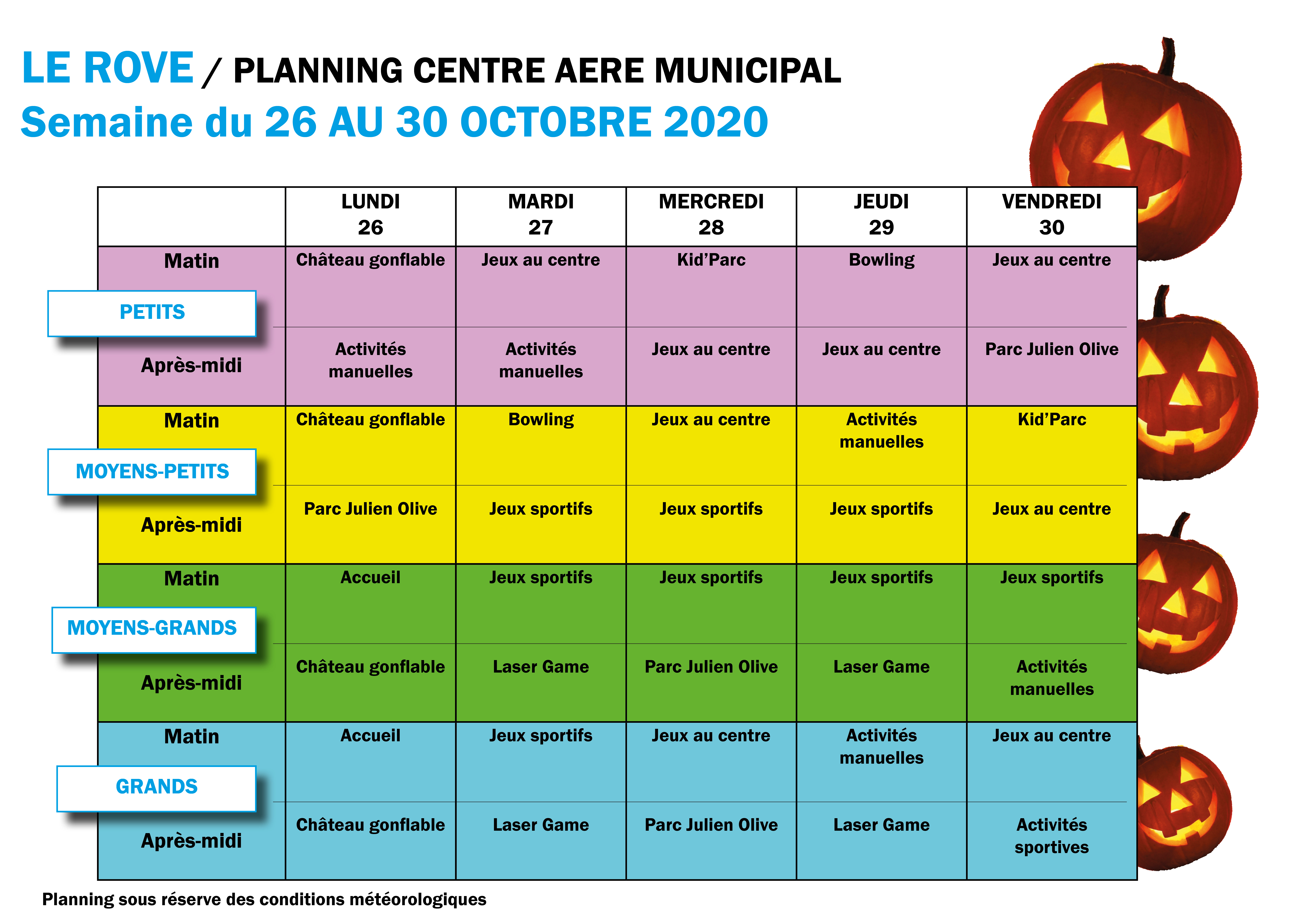 Ci dessous : Plannings des activités du centre aéré municipal du 19 au 30 octobre 2020