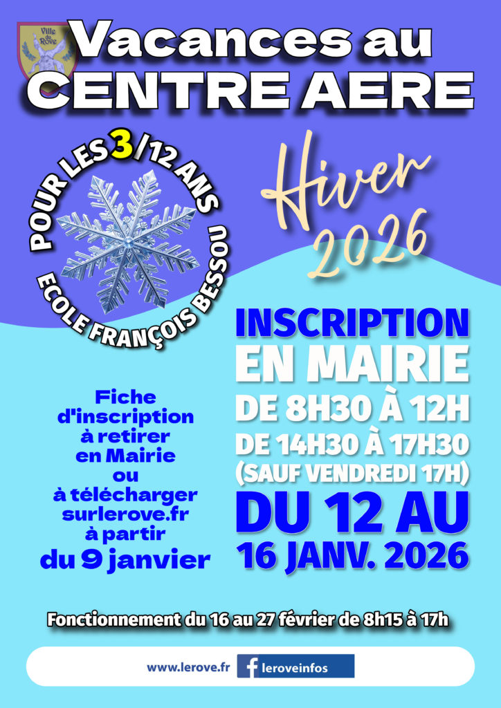 Les inscriptions pour le centre aéré d'Hiver 2026 s’effectueront en mairie du 12 au 16 janvier de 8h30 à 12h et 14h30 à 17h30 (sauf vendredi 17h).