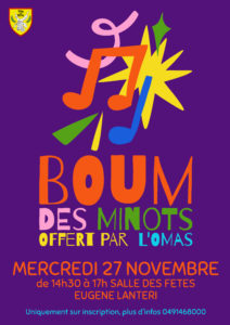La Boum des minots se tiendra le mercredi 26 novembre de 14h30 à 17h à la salle des fêtes Eugène Lanteri. Au programme, boum animée par DJ'KRIS et goûter. Les inscriptions se font à l'école élémentaire.