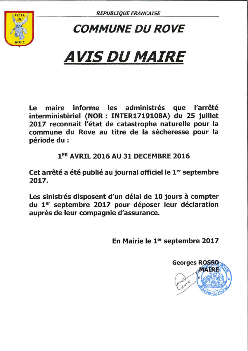 Le Maire informe informe les administrés que l'arrêté interministériel (Arrêté du 25 juillet 2017 portant reconnaissance de l’état de catastrophe naturelle NOR : INTE1719708A) du 25 juillet 2017 reconnait l'état de catastrophe naturelle pour la commune du Rove au titre de la sécheresse pour la période du : 1er AVRIL 2016 au 31 DÉCEMBRE 2016.