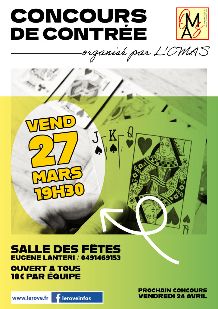 L'office municipal des affaires sociales organise son traditionnel concours de contrée mensuel le 27 mars à la salle des fêtes Lanteri à partir de 19h. Tirage des équipes à 19h30. Inscription sur place. Buvette et petite restauration. Participation 10€ par équipe. Consolante gratuite. Nombreuses dotations à partir des 1/2 finales. Ouvert à tous, ambiance amicale. Plus d'informations au 0491469153