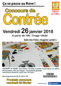 Le 26 janvier, c’est le traditionnel concours de contrée mensuel ouvert à tous à partir de 19h (tirage 19h30). On y passe toujours un bon moment dans une ambiance chaleureuse. On y vient en famille, entre amis ou seul pour le plaisir de jouer mais surtout dans l’espoir de remporter un des supers lots mis en jeu.