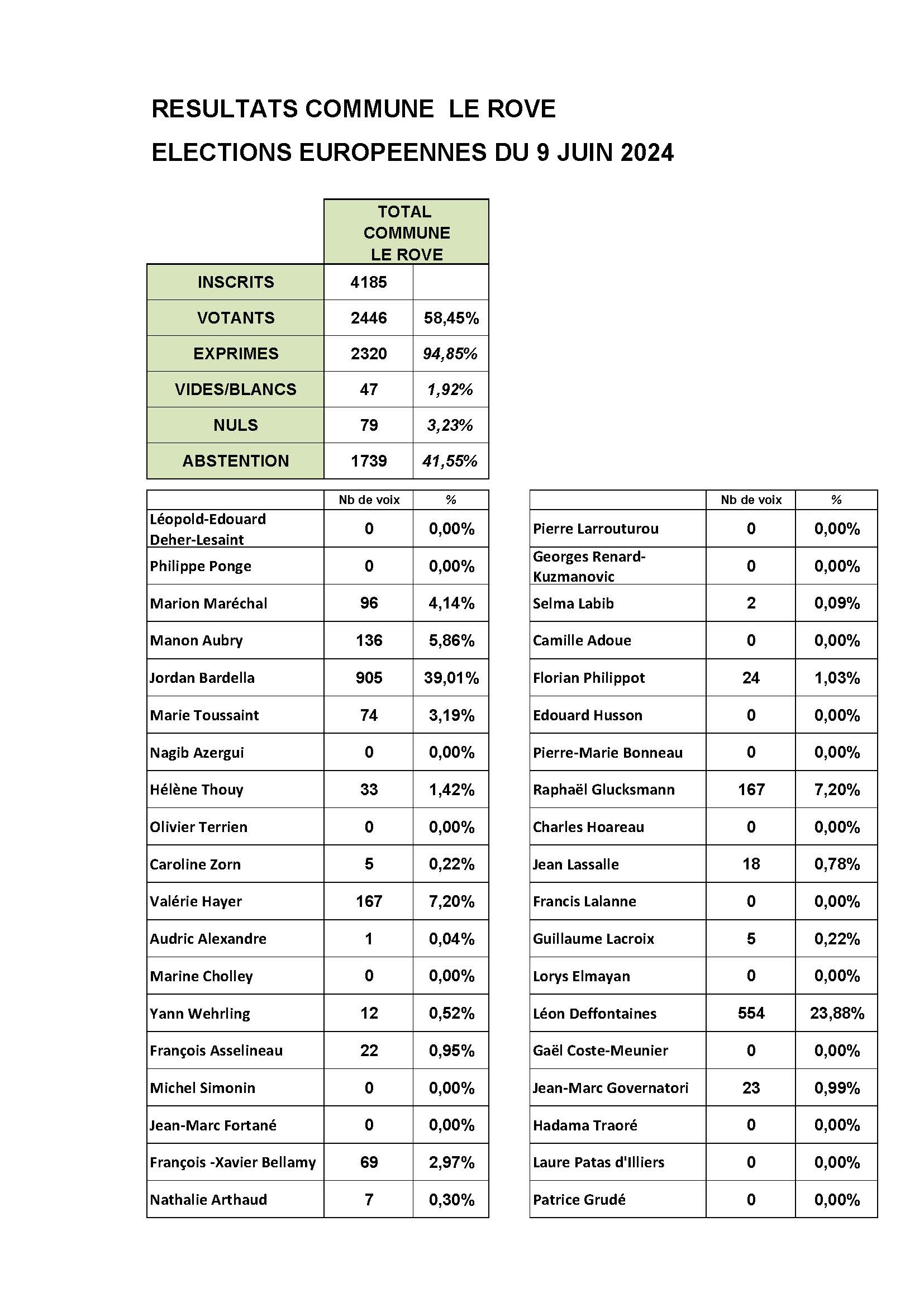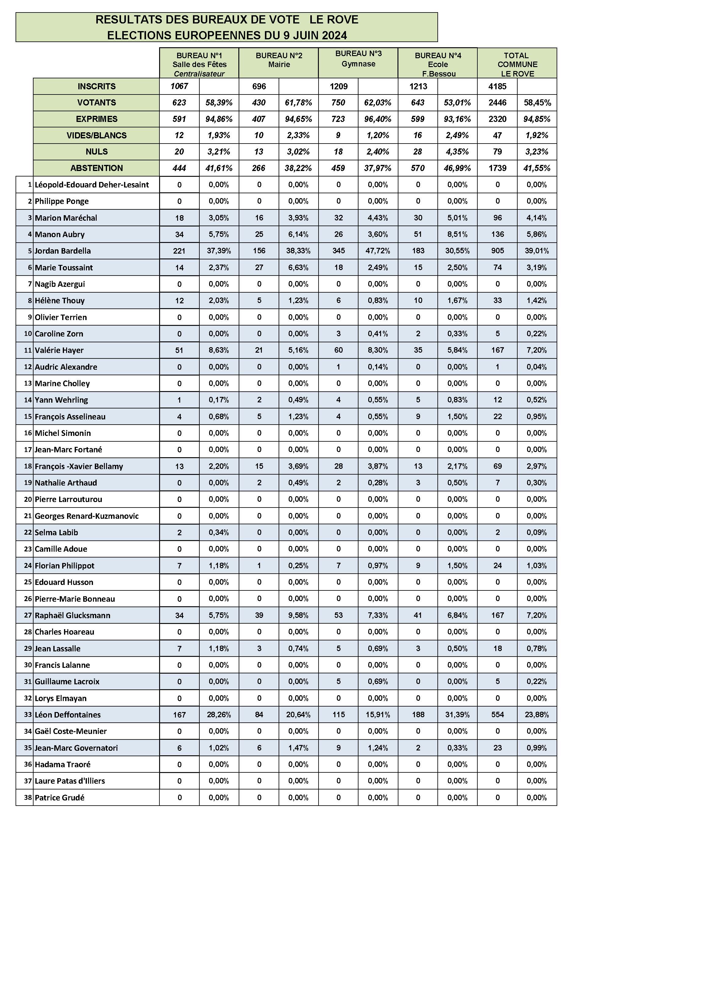 Elections Européennes – résultats du scrutin du 9 juin 2024 sur la commune du Rove Partager Email Print RESULTATS EUROPEENNES 2024 PAR BUREAU DE VOTE Tableau par bureaux de vote RESULTATS EUROPEENNES 2024 Tableau général 2024-06-10 admin tweet