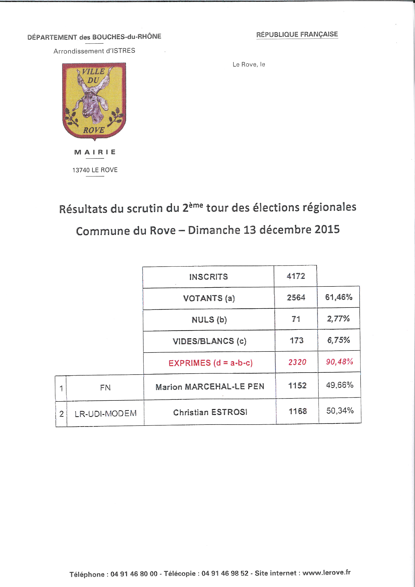 Les résultats du scrutin du 2ème tour des élections régionales enregistrés sur la commune du Rove - dimanche 13 décembre 2015 - en cliquant ici