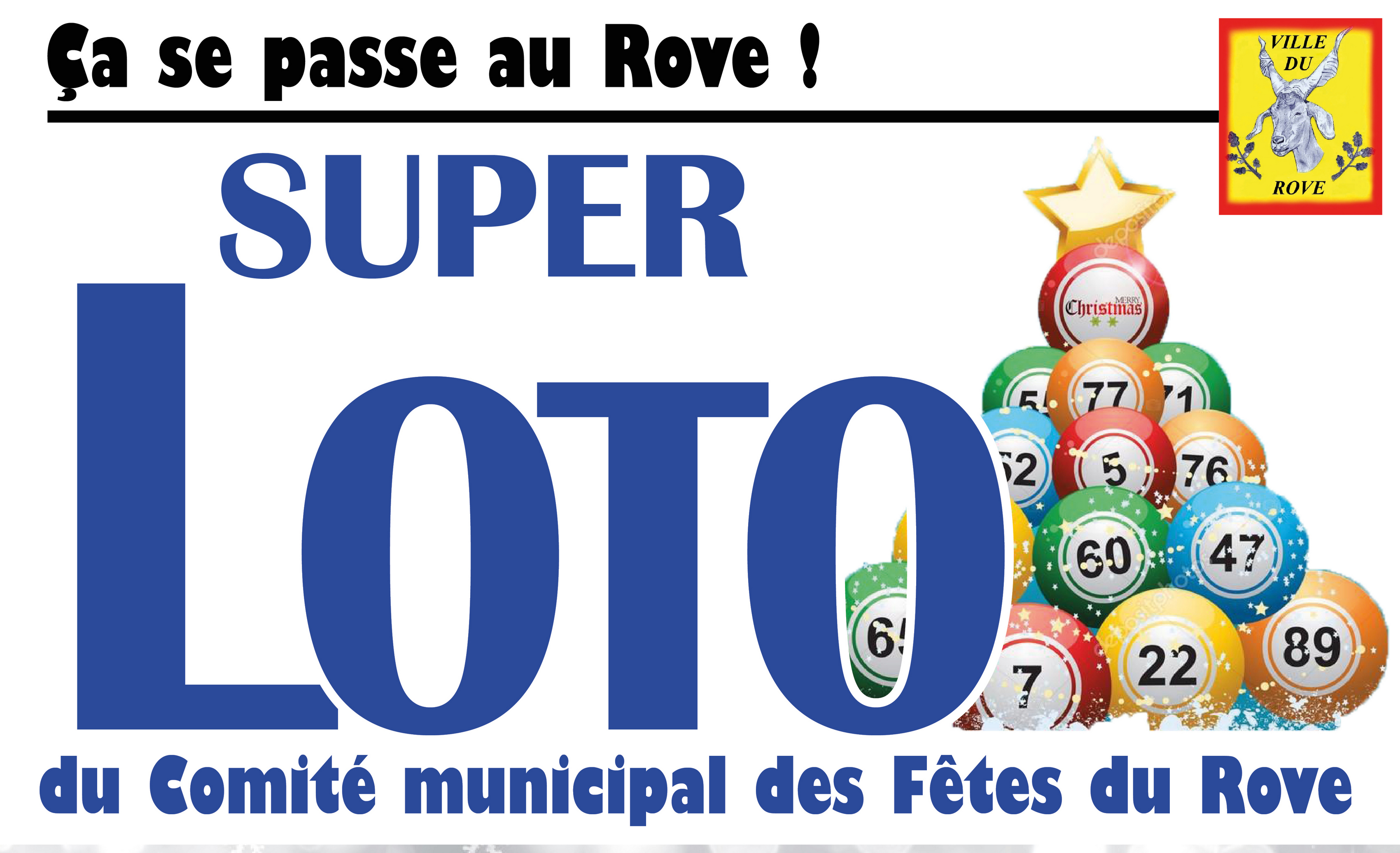 C'EST NOËL AVANT L'HEURE AU ROVE !! Le SUPER LOTO du comité des fêtes du Rove se tiendra le DIMANCHE 2 DÉCEMBRE à 17h au gymnase du Rove (rue du stade - 13740 Le Rove). De magnifiques lots sont à gagner avec notamment 7 cartons pleins à 300 euros et 21 quines (lot champagne, vins fins, panier gourmand, jambon cru, ...