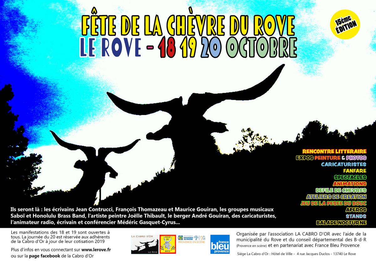 La Cabro d’Or avec l’aide de la municipalité du Rove, le département des B-d-R (dispositif Provence en scène) et en partenariat avec Radio France Bleu Provence, organise la 15ème édition de la fête de la chèvre du Rove les 18, 19, 20 octobre 2019. Durant trois jours, de nombreuses animations seront proposées au public. Page Facebook de la Cabro d'Or ...