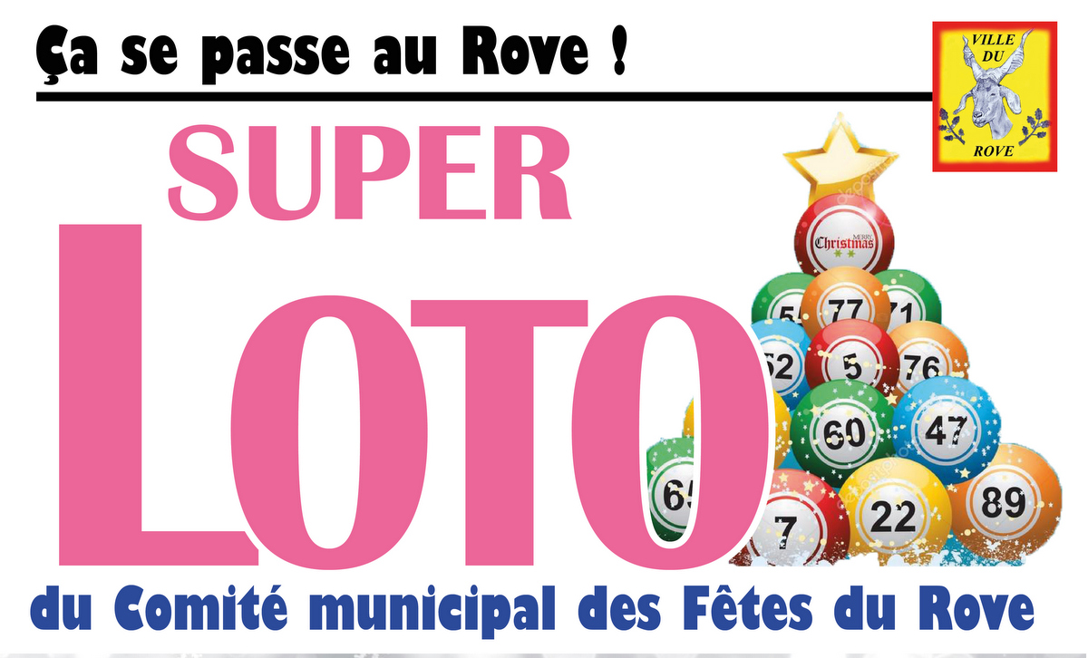La saison des SUPERS LOTOS AU ROVE va commencer par celui du comité municipal des fêtes, le DIMANCHE 1 DECEMBRE à 17H au gymnase municipal "Blaise Gouiran". De nombreux lots sont à gagner parmi les 7 cartons pleins (7 bons d'achats de 300 euros) et les 21 quines (lot Champagne, vins fins, panier gourmand, jambon cru...) Ouvert à tous.