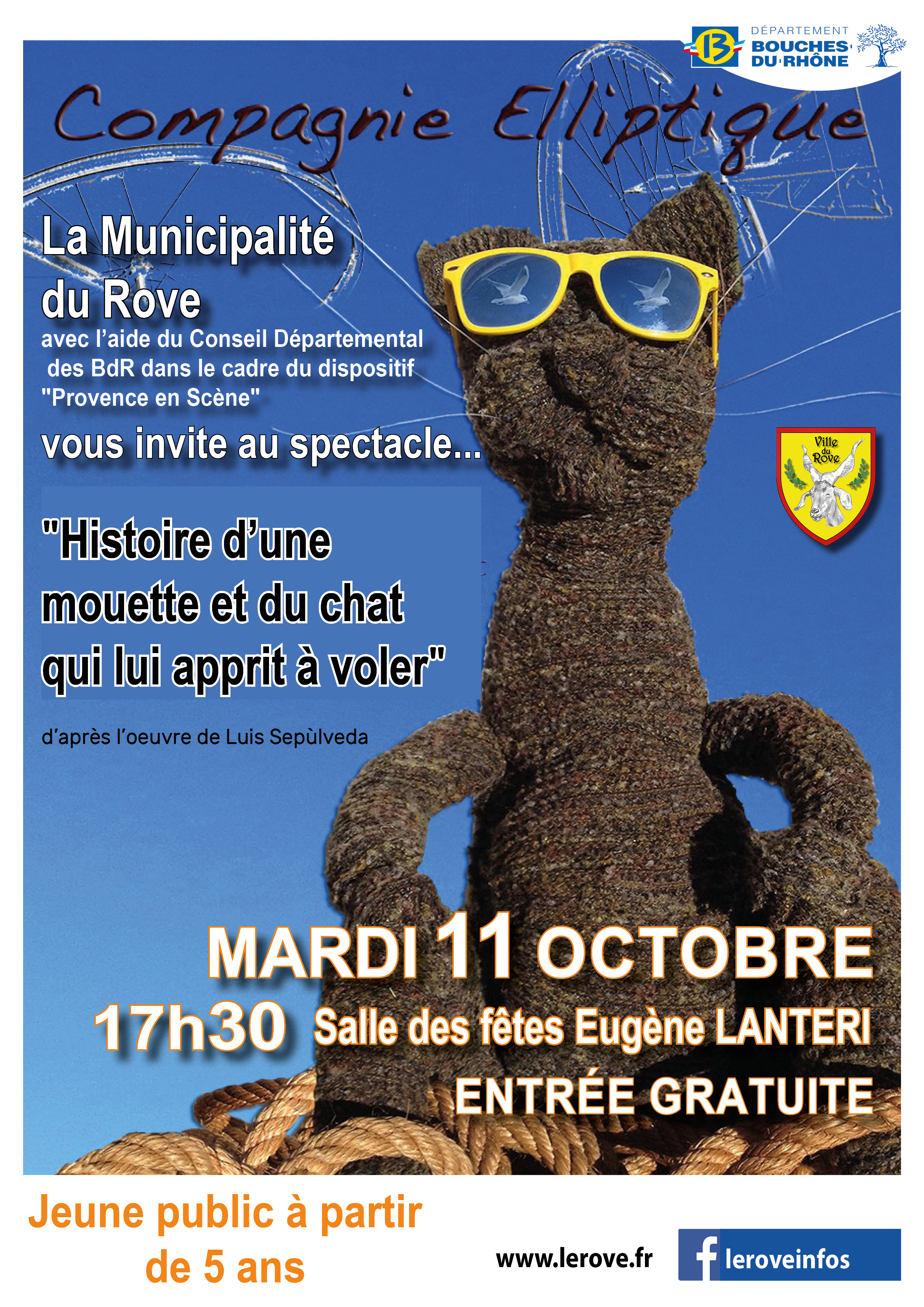 Le mardi 11 octobre à 17h30 à la salle municipale des fêtes Eugène Lanteri, la municipalité du Rove en partenariat avec le département des B-d-R dans le cadre du dispositif Provence en scène invite les enfants de la commune à un spectacle gratuit de marionnettes : Histoire d'une mouette et du chat qui lui apprit à voler d’après l’oeuvre de ...