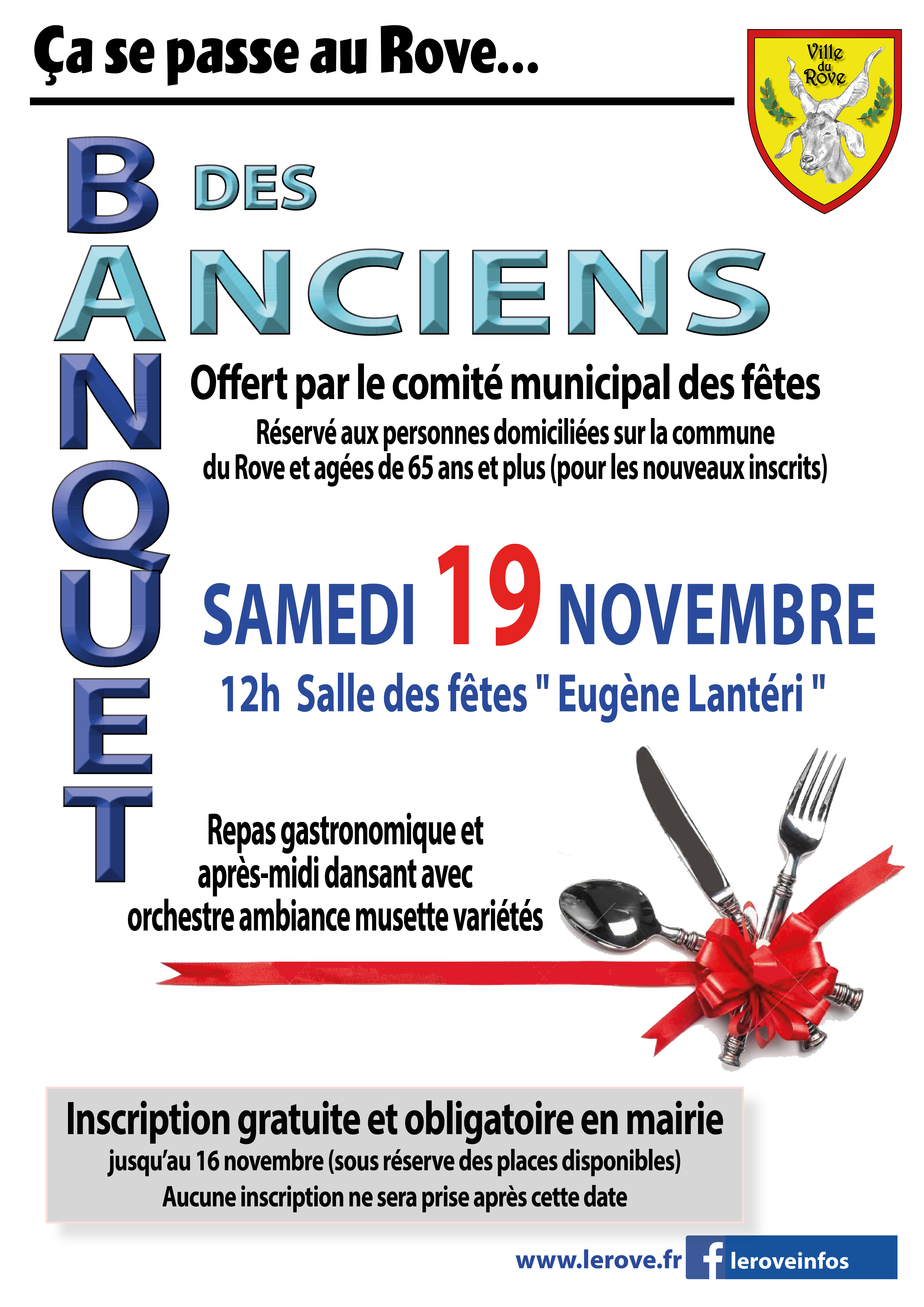 Le comité municipal des fêtes invite les personnes domiciliées sur la commune et âgées de 65 ans et plus, à participer au traditionnel "banquet des anciens" Le Banquet se déroulera le samedi 19 novembre à midi à la salle municipale des fêtes "Eugène Lanteri". Pour rappel, cette manifestation est offerte par le comité des fêtes et réservé aux ...