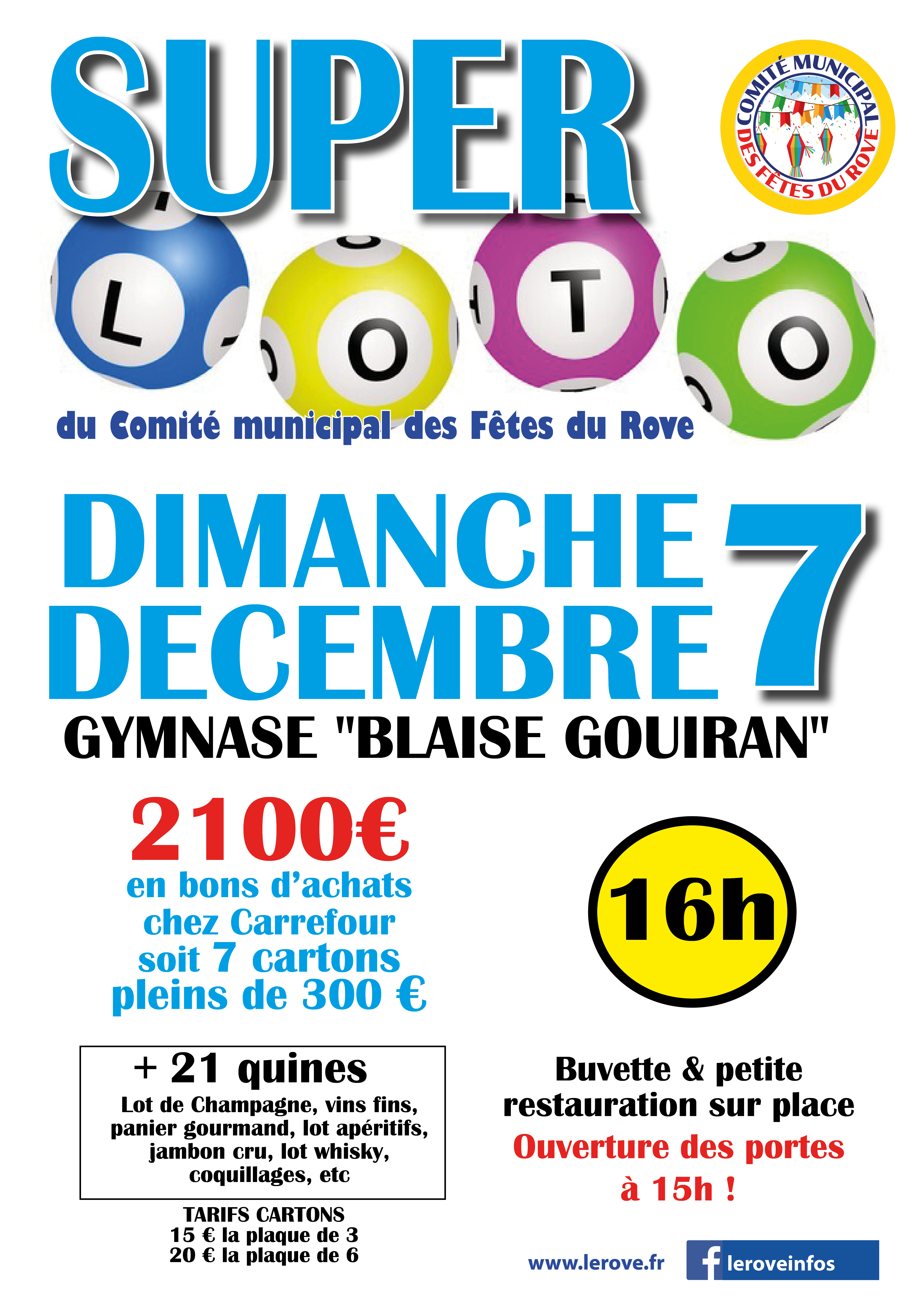 Le comité municipal des fêtes organise son SUPER LOTO annuel le dimanche 7 décembre à 16 heures au gymnase municipal. De supers lots sont à gagner : 7 cartons pleins à 300€ et 21 quines (lot de champagne, vins fins, panier gourmand, lot apéritifs, jambon cru, lot whisky, coquillages...). > Buvette et petiote restauration sur place > Ouverture des portes ...
