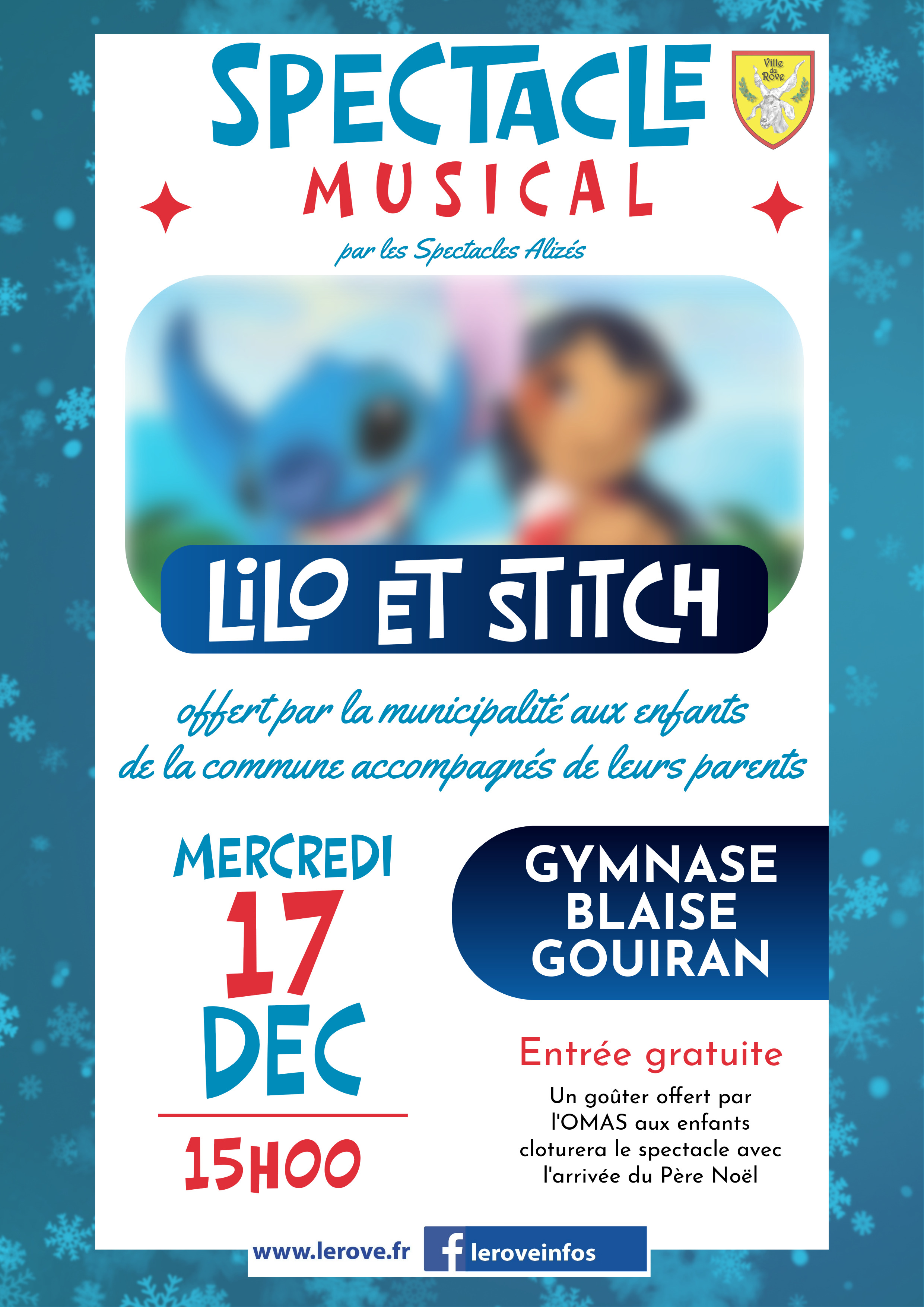"LILO et STITCH" par les "Spectacles Alizés ". Spectacle musical offert par la Municipalité du Rove aux enfants de la commune accompagnés de leurs parents. Mercredi 17 décembre à 15 heures / Gymnase Municipal Blaise Gouiran Un goûter offert par l’OMAS aux enfants clôturera le spectacle avec l'arrivée du Père Noël Entrée libre et gratuite