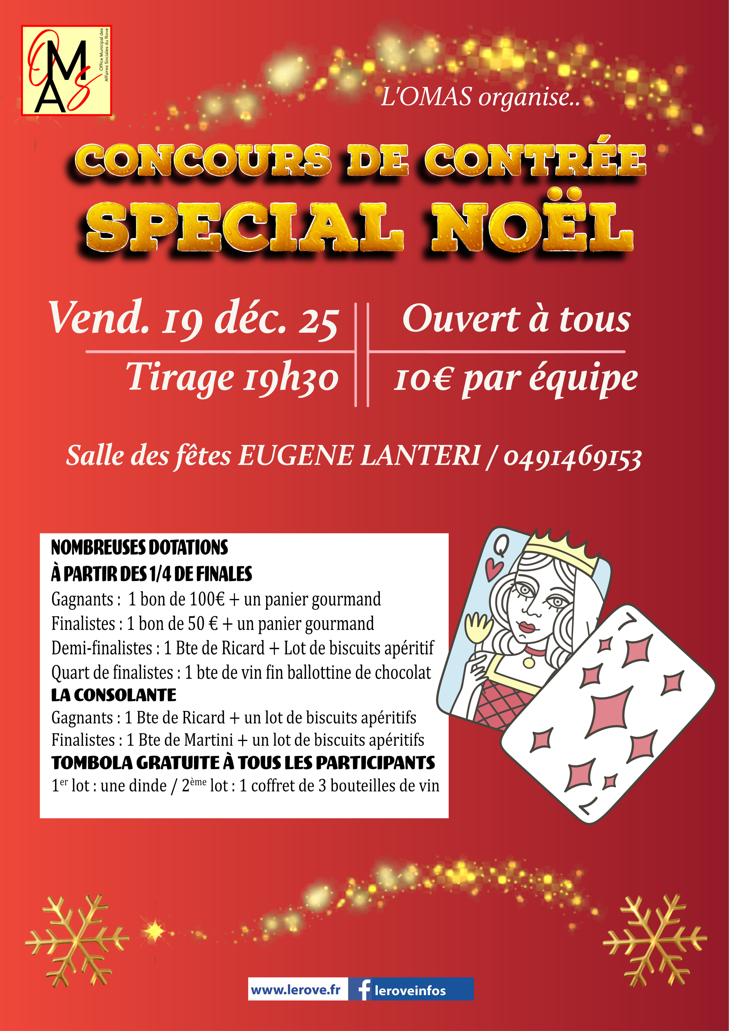 Salle des fêtes Lanteri / vendredi 19 décembre L'office municipal des affaires sociales du Rove organise un super concours de contrée "Spécial Noël". Pour marquer cet évènement, l'Omas met en jeu des lots dès les 1/4 de finales avec aussi une tombola gratuite à tous les participants. Ambiance conviviale garantie. Ouvert à tous. > TOMBOLA GRATUITE à tous les participants Tirage ...
