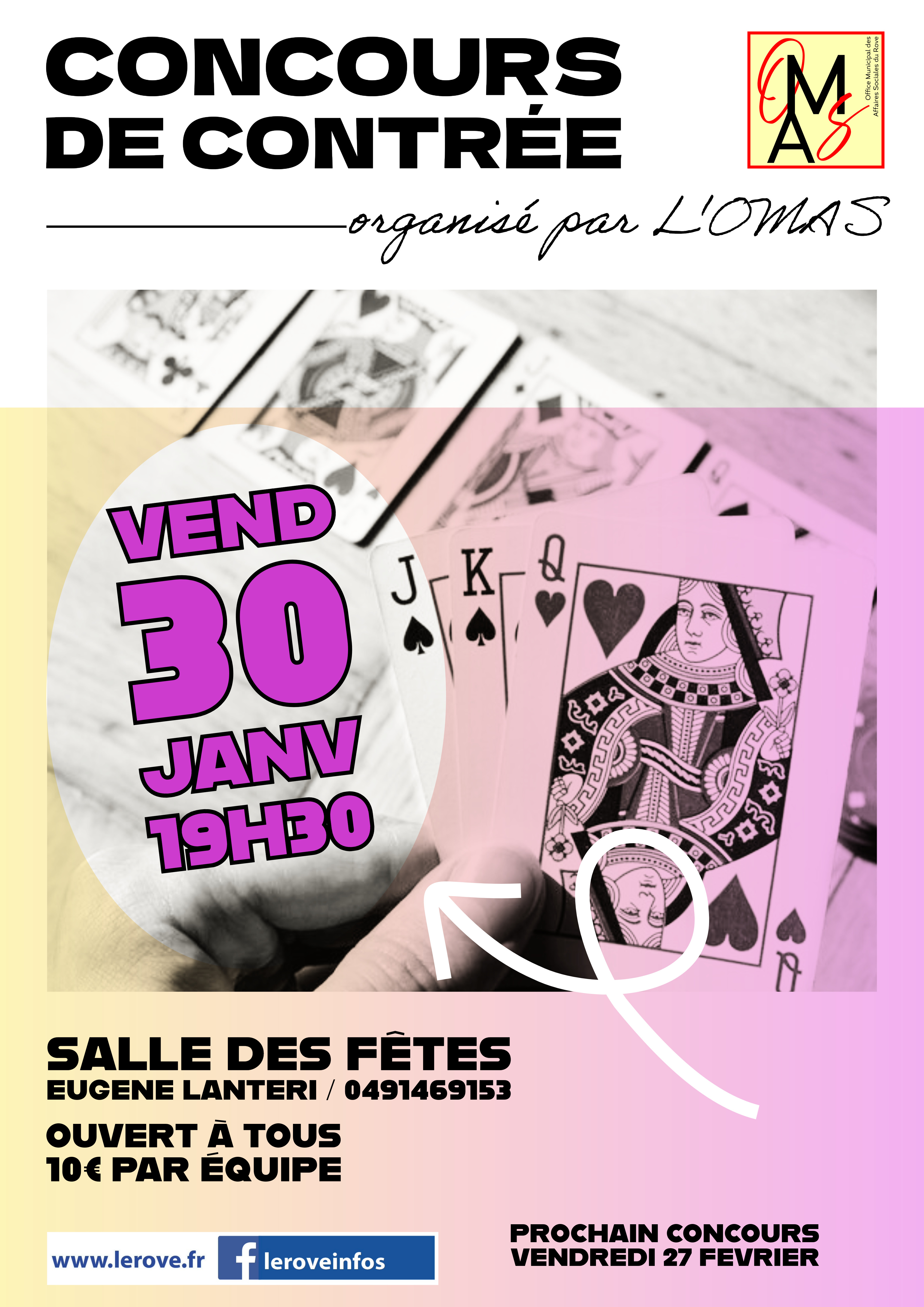 L'office municipal des affaires sociales organise son traditionnel concours de contrée mensuel le 30 janvier à la salle des fêtes Lanteri à partir de 19h. Tirage des équipes à 19h30. Inscription sur place. Buvette et petite restauration. Participation 10€ par équipe. Consolante gratuite. Nombreuses dotations à partir des 1/2 finales. Ouvert à tous, ambiance amicale. Plus d'informations au 0491469153