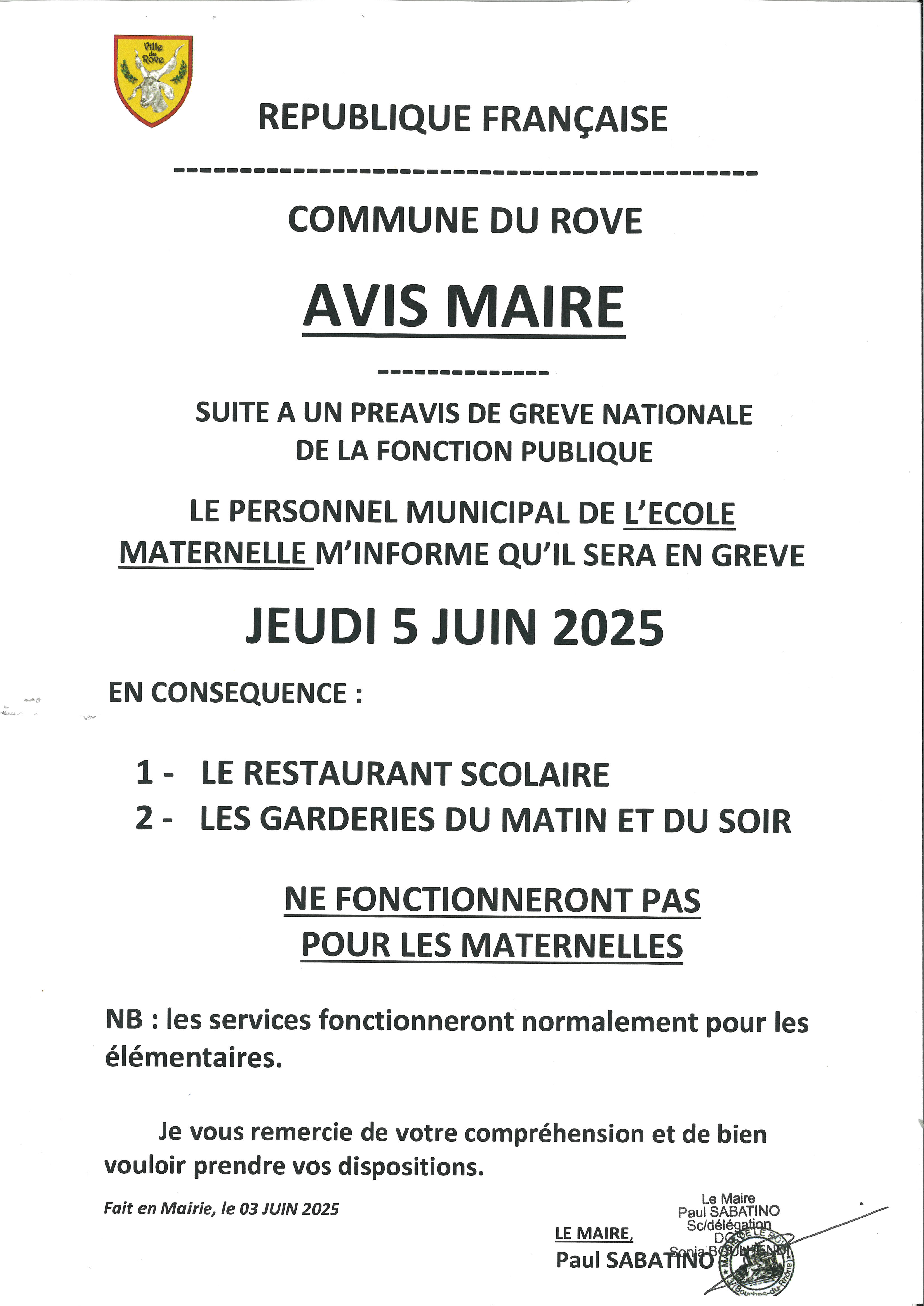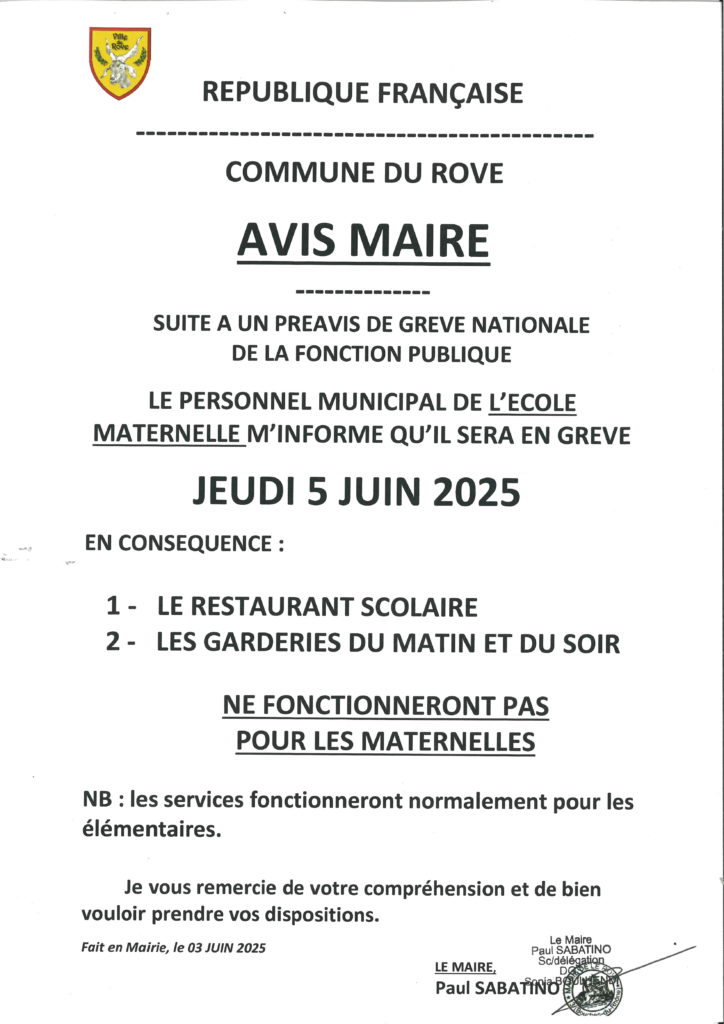 Suite à une journée de grève nationale des agents de la fonction publique, le personnel municipal de l'école maternelle sera en grève le jeudi 5 juin.