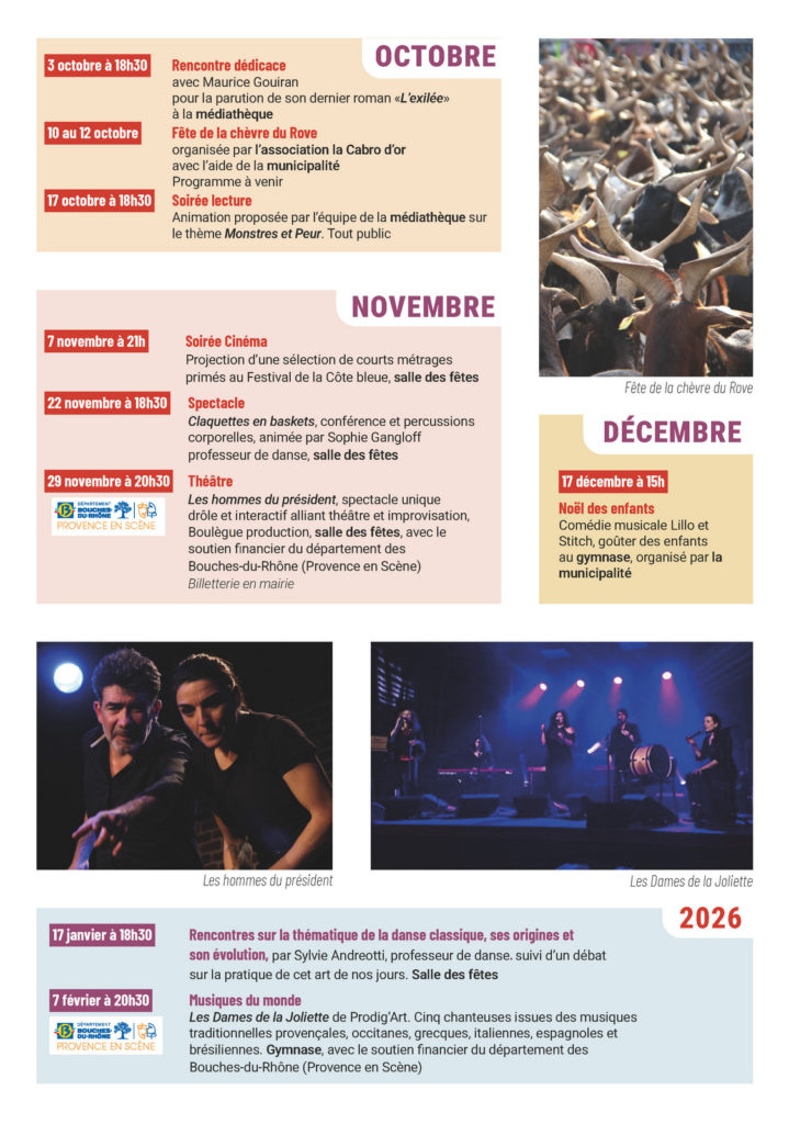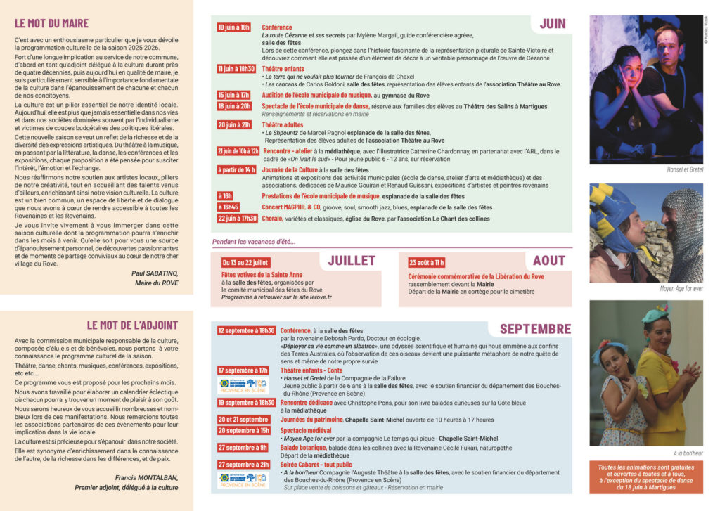 Je vous invite vivement à vous immerger dans cette saison culturelle dont la programmation pourra s’enrichir dans les mois à venir. Qu’elle soit pour vous une source d’épanouissement personnel, de découvertes passionnantes et de moments de partage conviviaux au coeur de notre cher village du Rove."