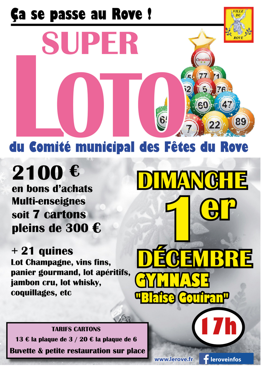 La saison des SUPERS LOTOS AU ROVE va commencer par celui du comité municipal des fêtes, le DIMANCHE 1 DECEMBRE à 17H au gymnase municipal "Blaise Gouiran".