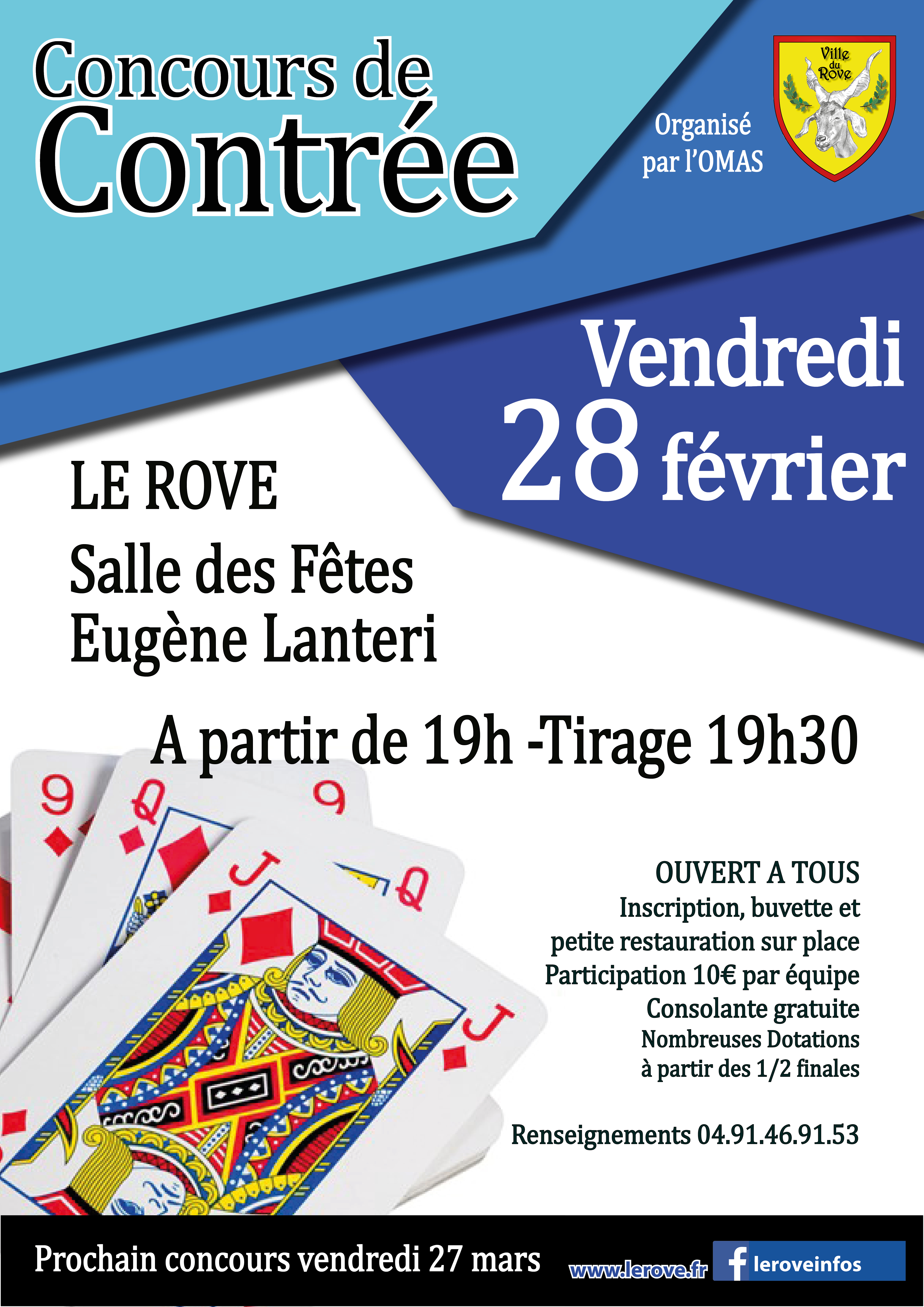 L'office municipal des affaires sociales organise son traditionnel concours de contrée, le vendredi 27 octobre. Rendez-vous à la salle des fêtes Lanteri à partir de 19h. tirage au sort à 19h30.