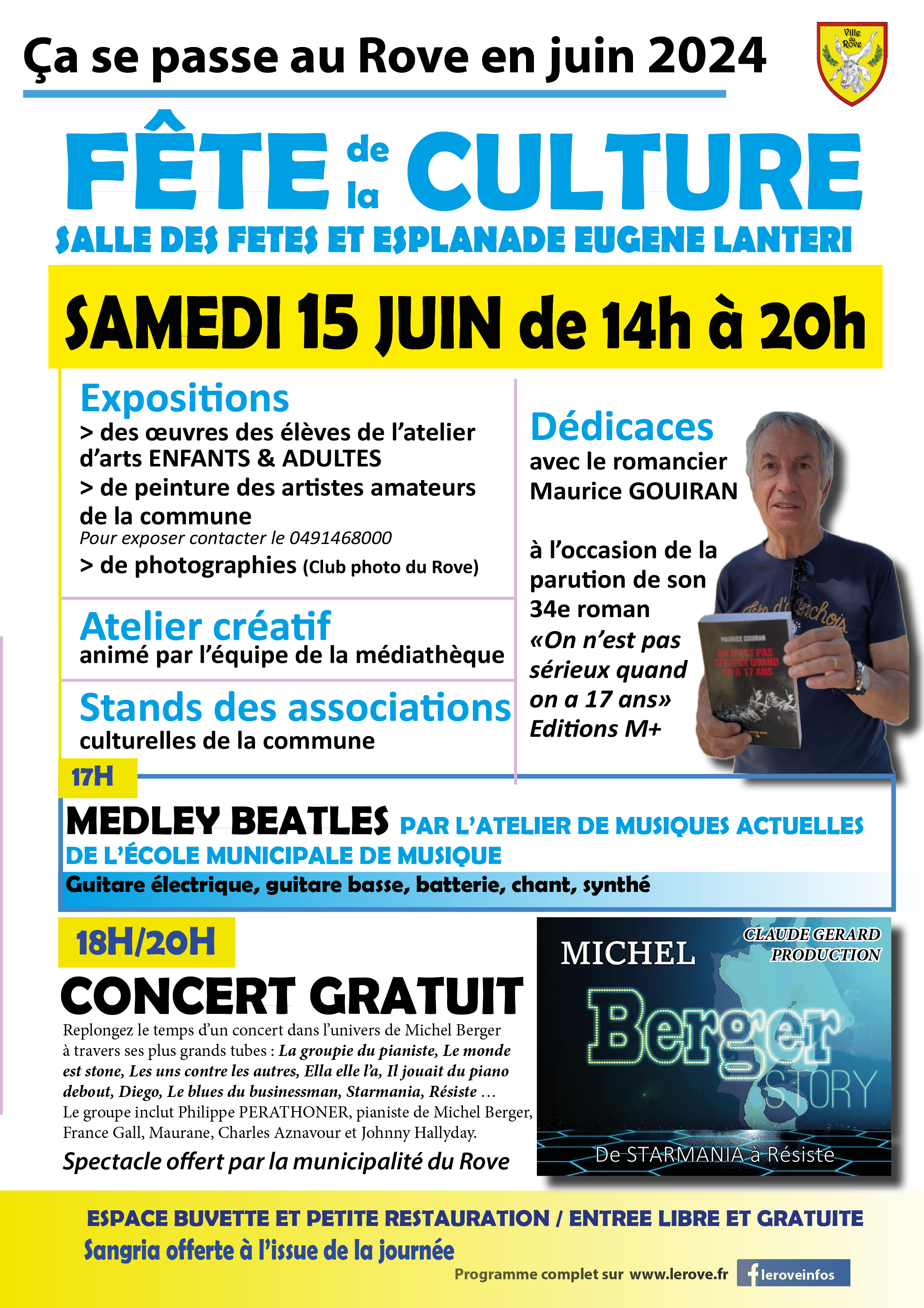 La municipalité a le plaisir de vous inviter à la traditionnelle fête de la culture le 15 juin prochain qui se déroulera à la salle des fêtes Lanteri et sur son esplanade de 14h à 20h.