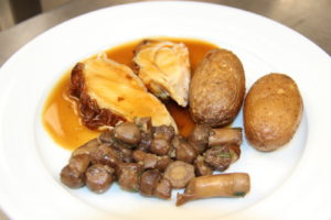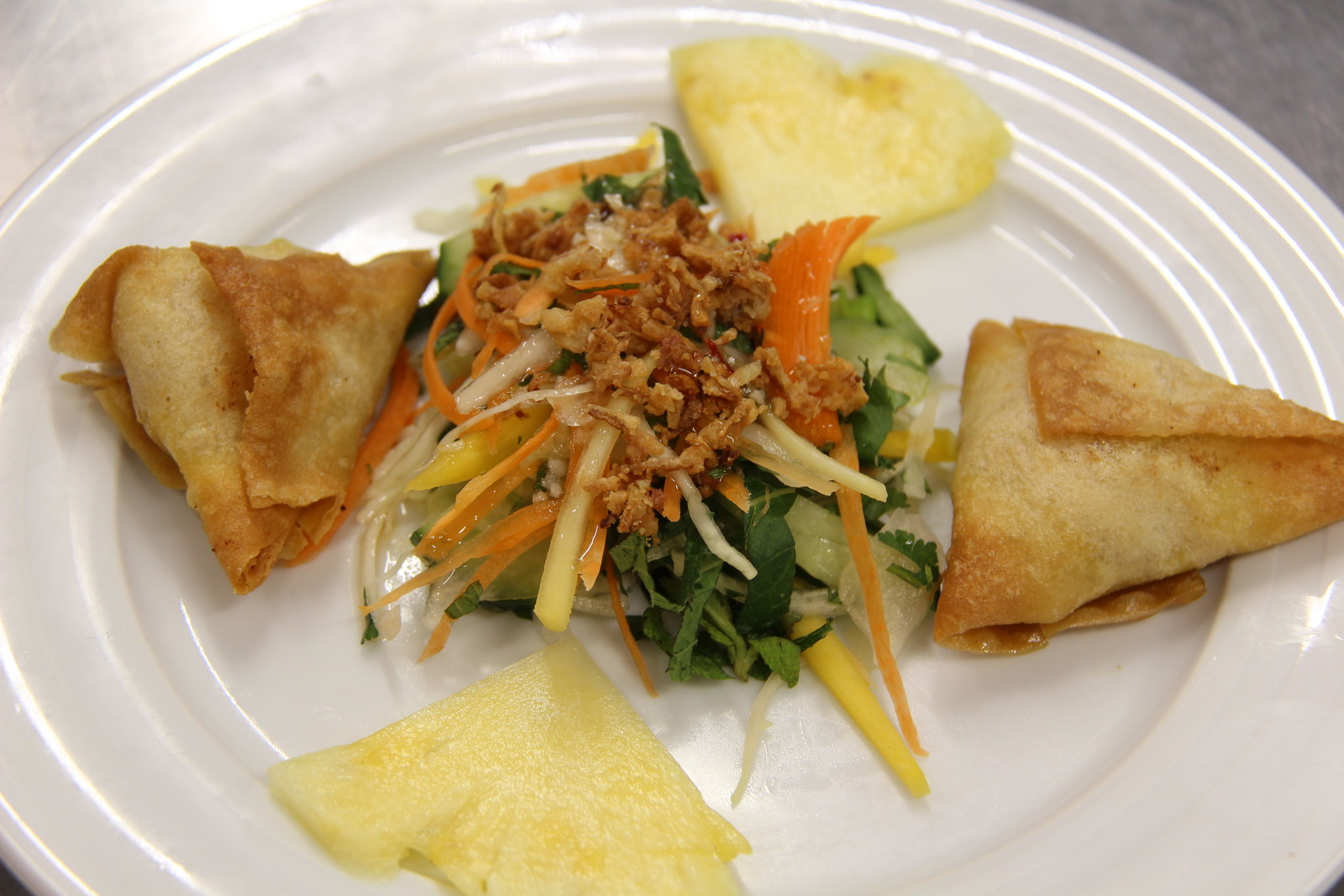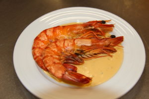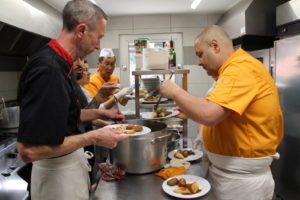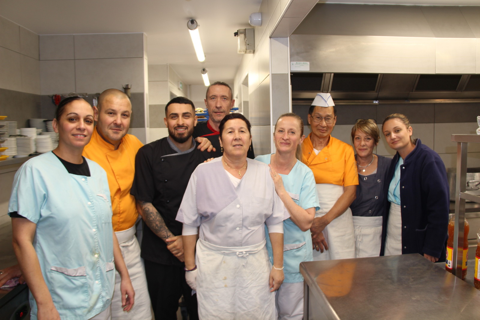 Le repas a été préparé sur place par les quatre cuisiniers de la restauration municipale (Olivier, Brayan, Jean-Claude et Daniel). Au menu du jour : Apéritif, salade asiatique et samoussas aux légumes, gambas persillées sauce crustacés, roulé de chapon et son jus corsé, champignons sautés, pommes grenaille, salade, fromageons du Rove, pâtisserie, glace, café, vin, digestif, champagne.