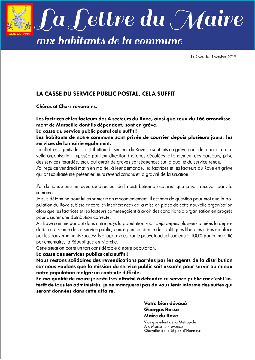 Au Rove comme partout dans notre pays la population subit déjà depuis plusieurs années la dégradation croissante de ce service public, conséquence directe des politiques libérales mises en place par les gouvernements successifs et aggravées par le pouvoir actuel soutenu à 100% par la majorité parlementaire, la République en Marche.