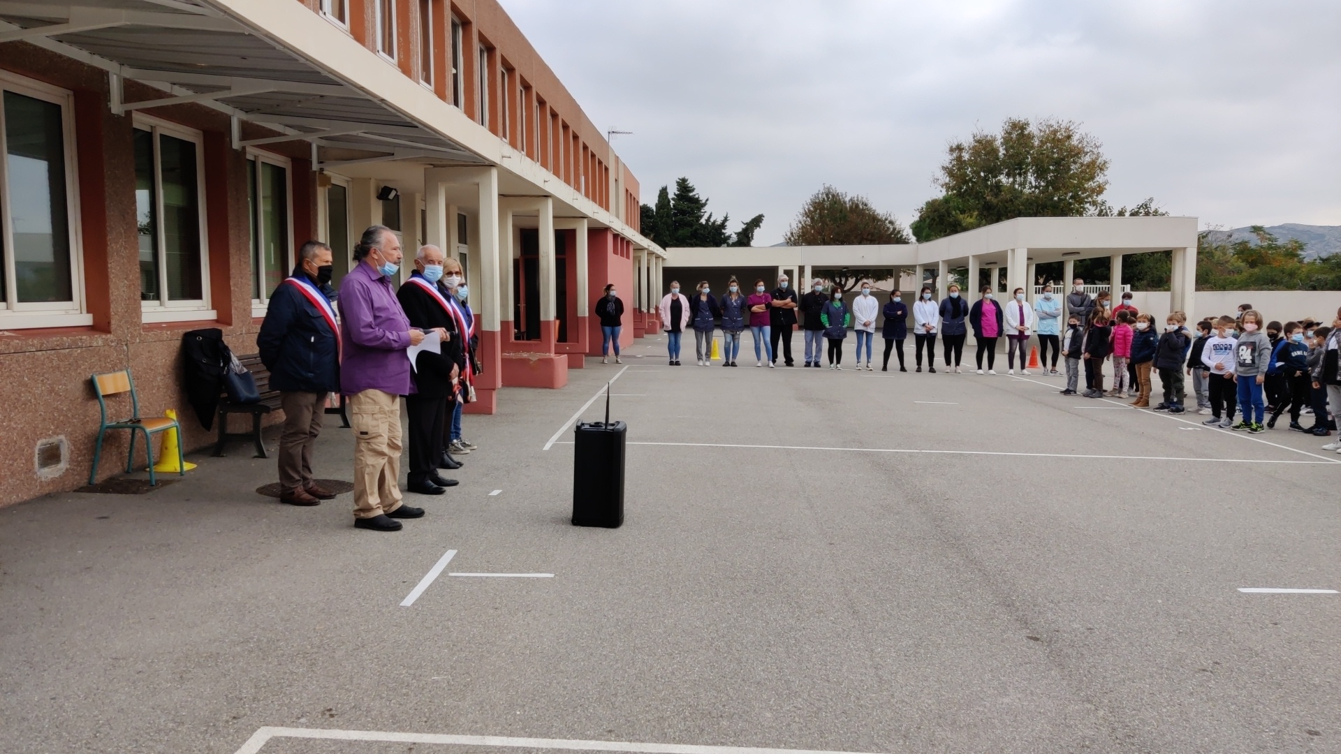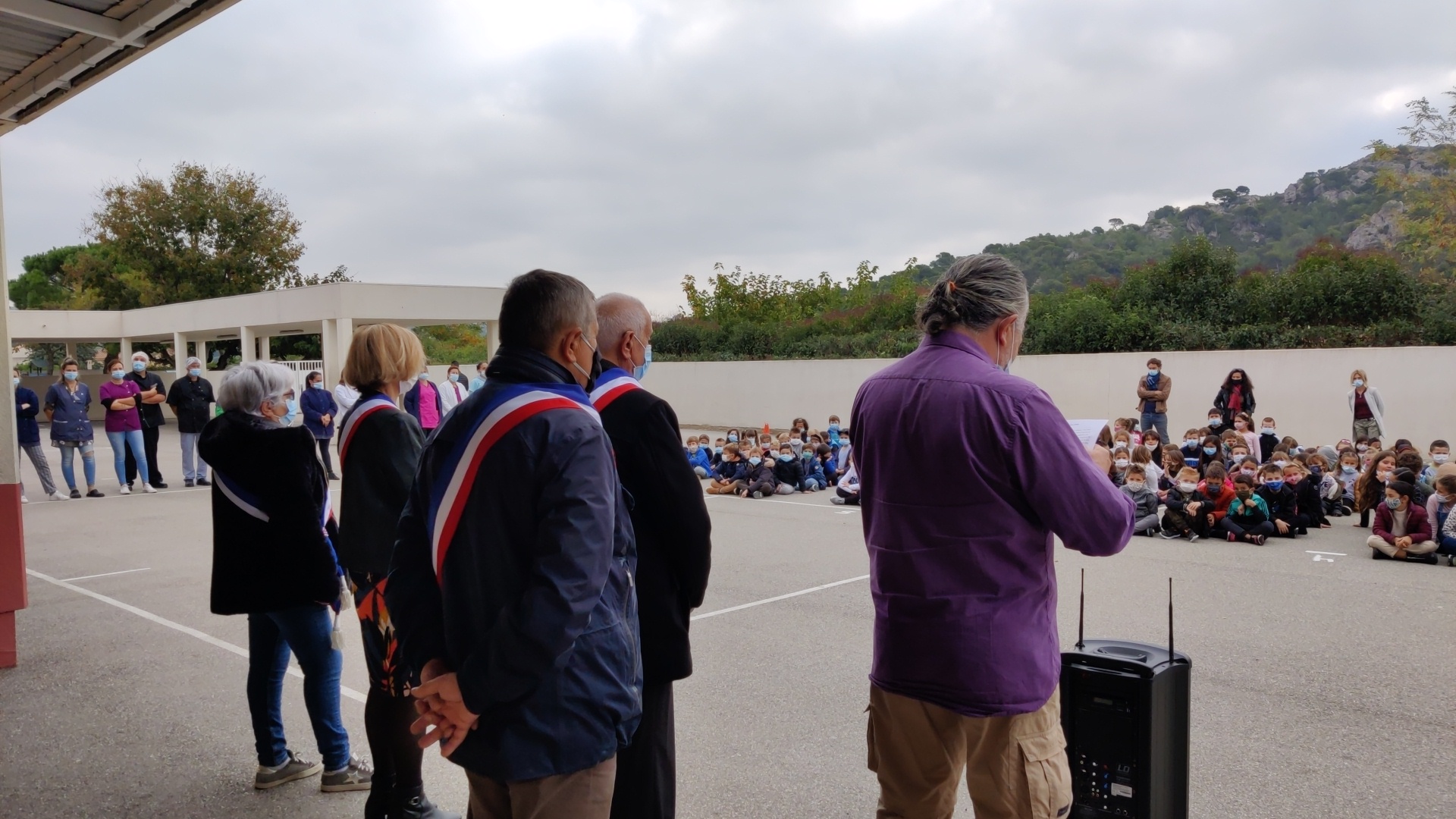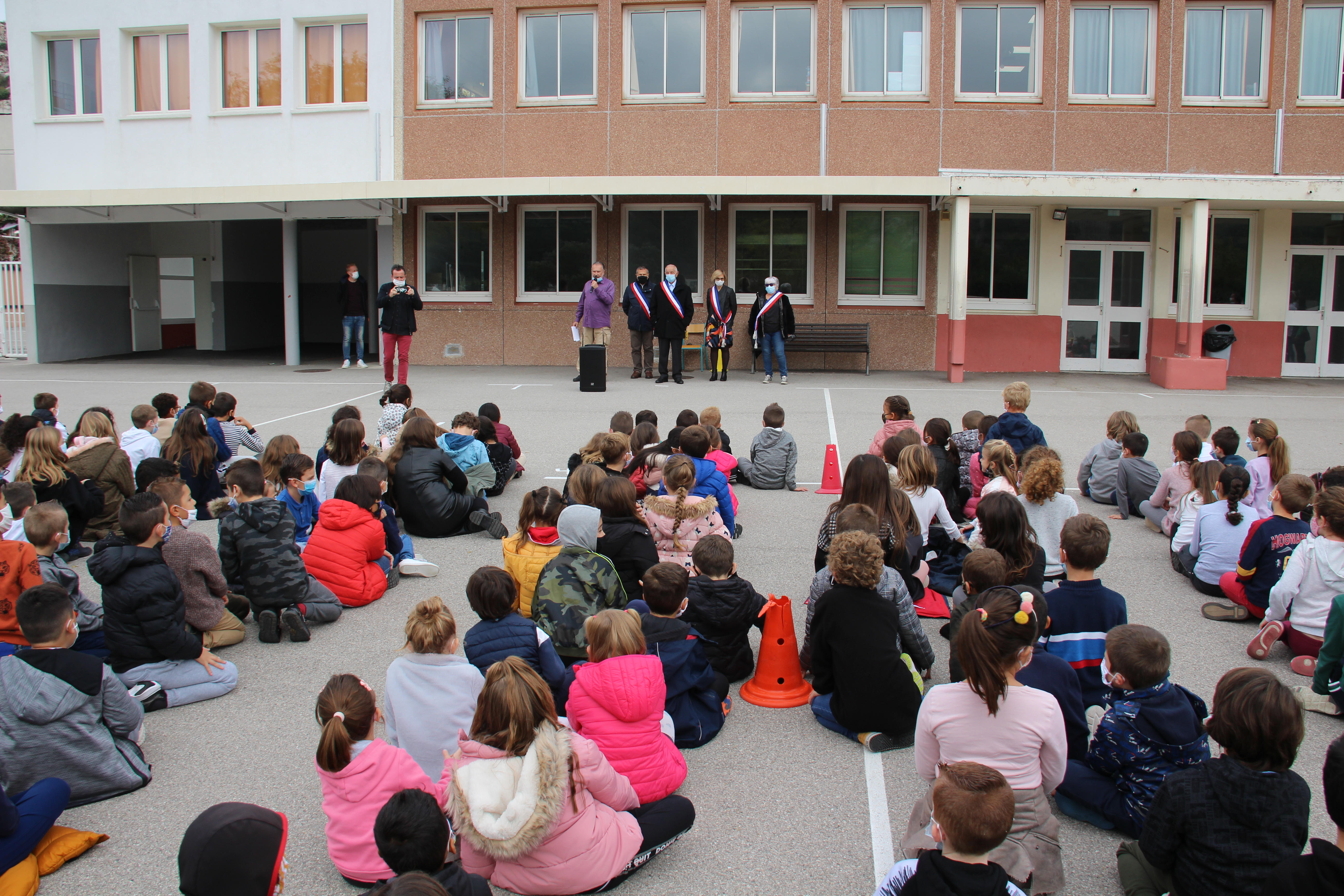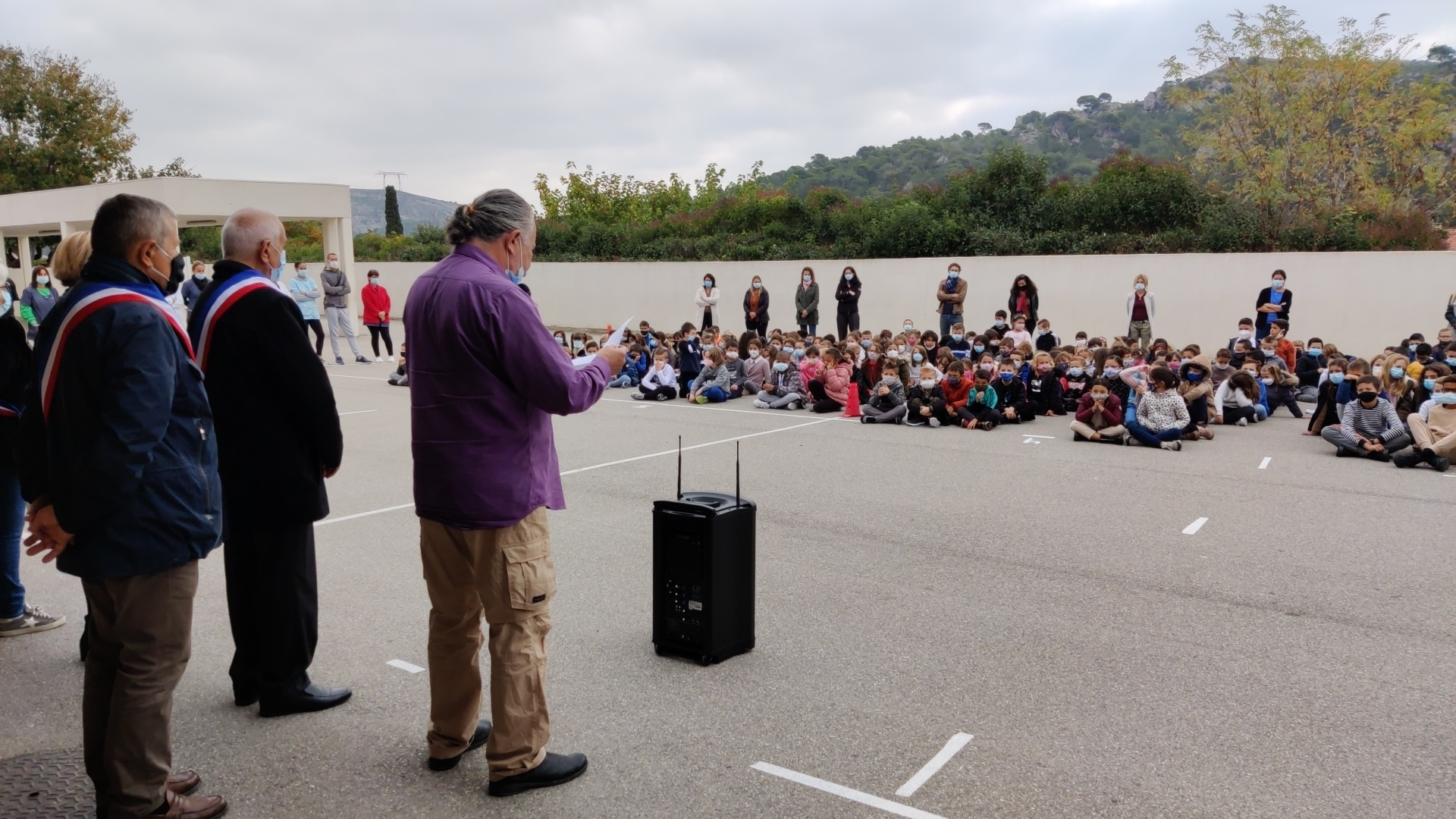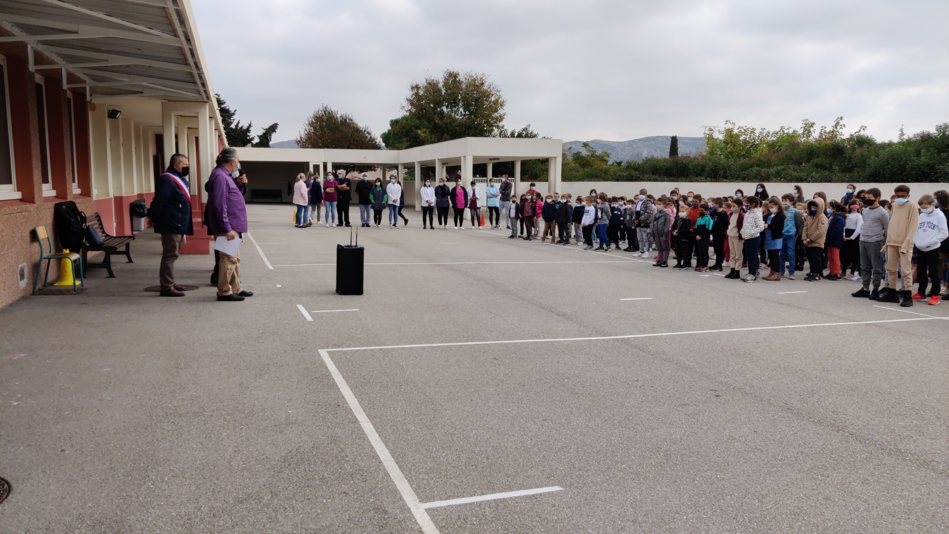 A 11 heures, tous les élèves ont été rassemblés par leur professeur dans leur cour de récréation en ma présence, celle de mon premier adjoint, Paul Sabatino, de l’adjointe aux écoles, Chantal Giraud, de l’adjointe au personnel, Viviane Rosso, ainsi que du personnel communal.