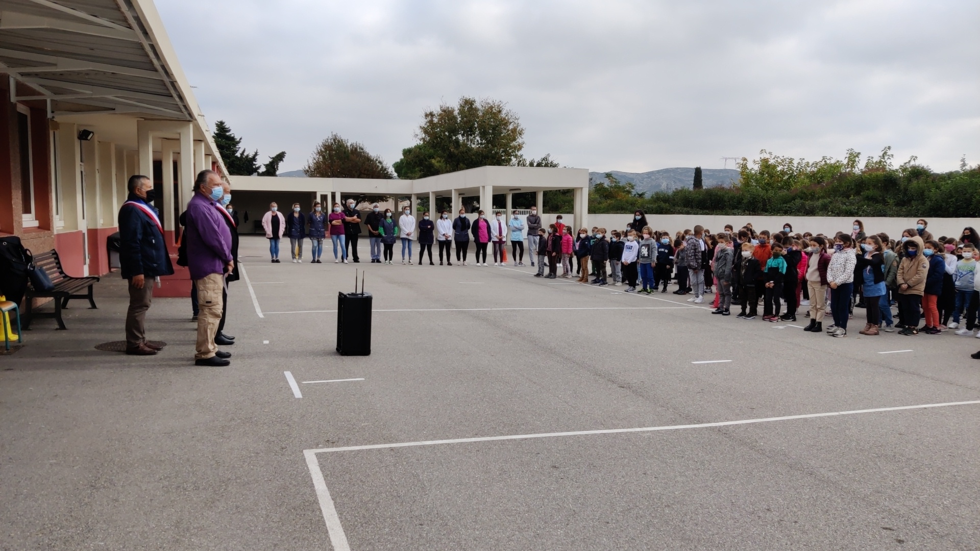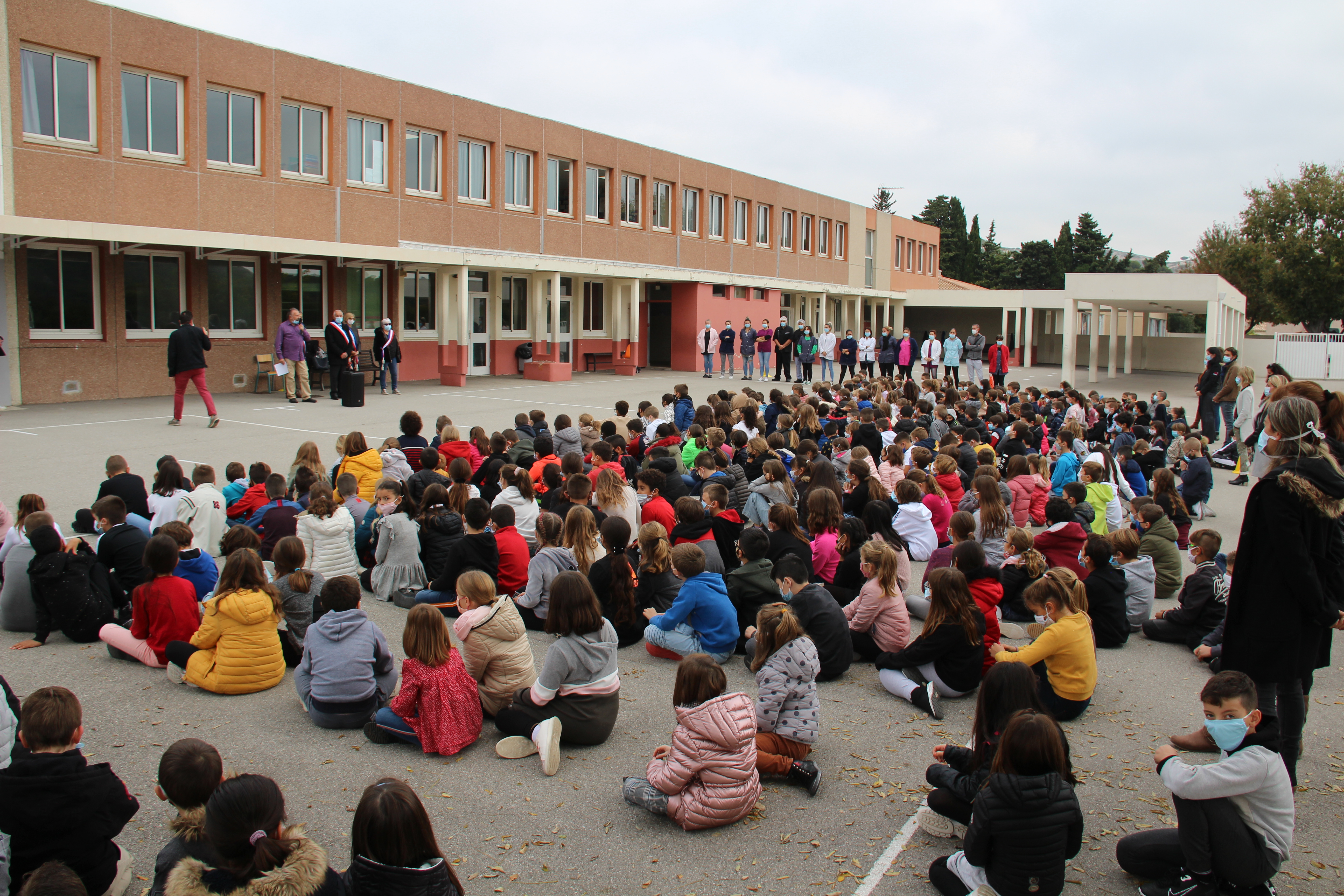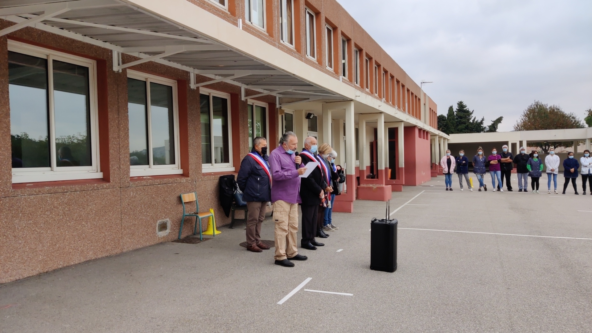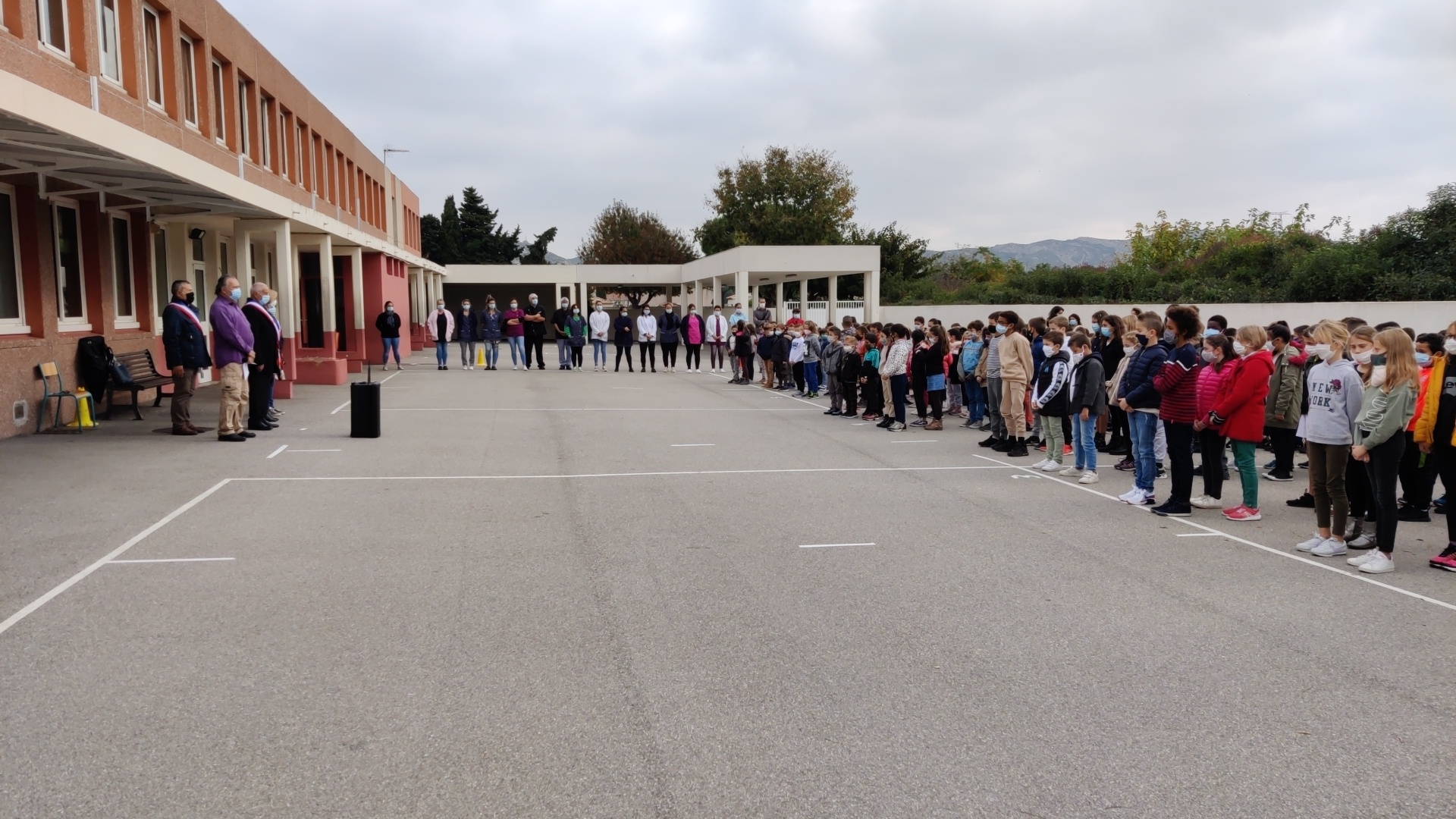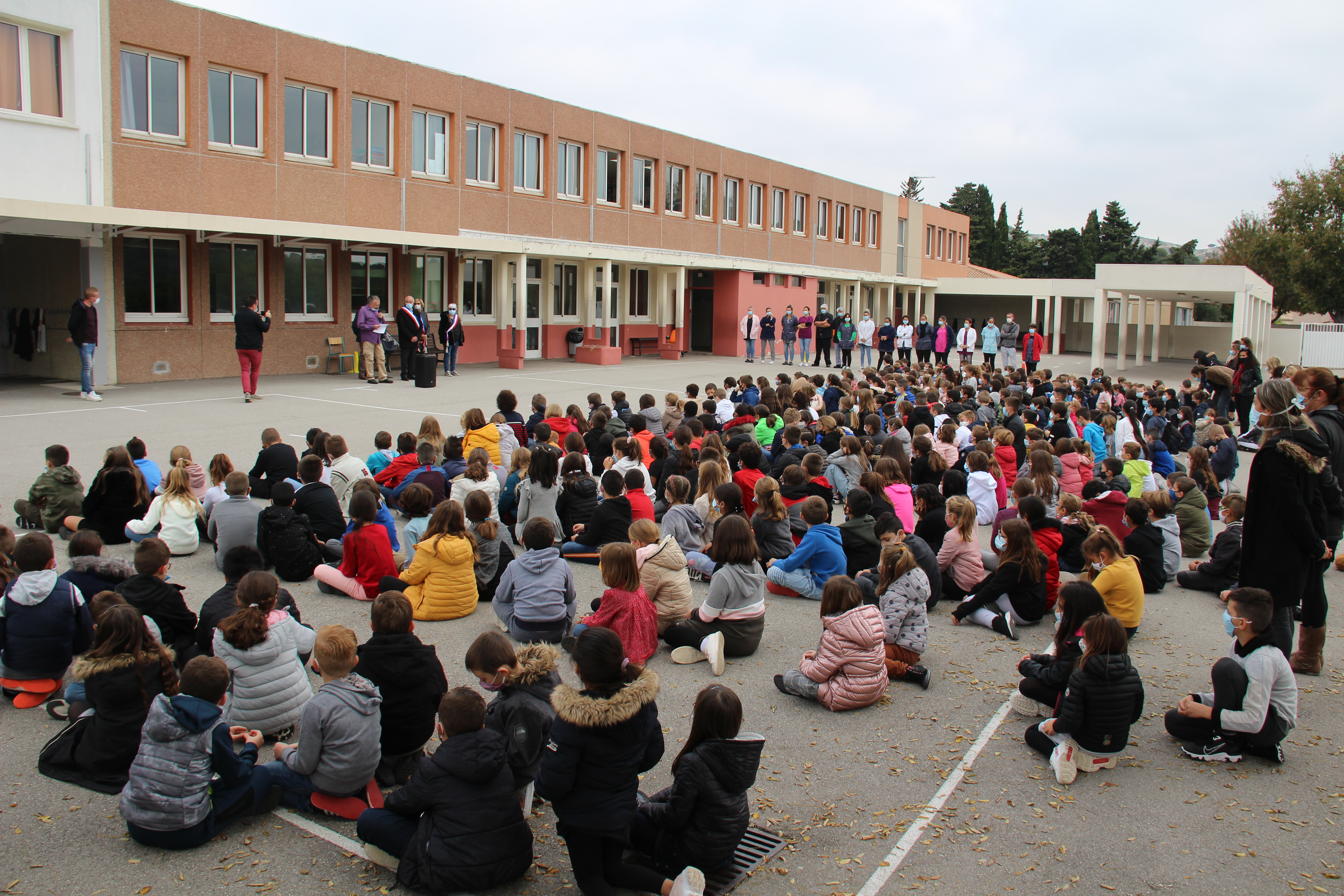 A 11 heures, tous les élèves ont été rassemblés par leur professeur dans leur cour de récréation en ma présence, celle de mon premier adjoint, Paul Sabatino, de l’adjointe aux écoles, Chantal Giraud, de l’adjointe au personnel, Viviane Rosso, ainsi que du personnel communal.