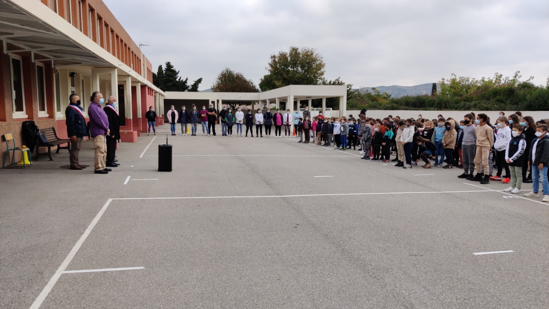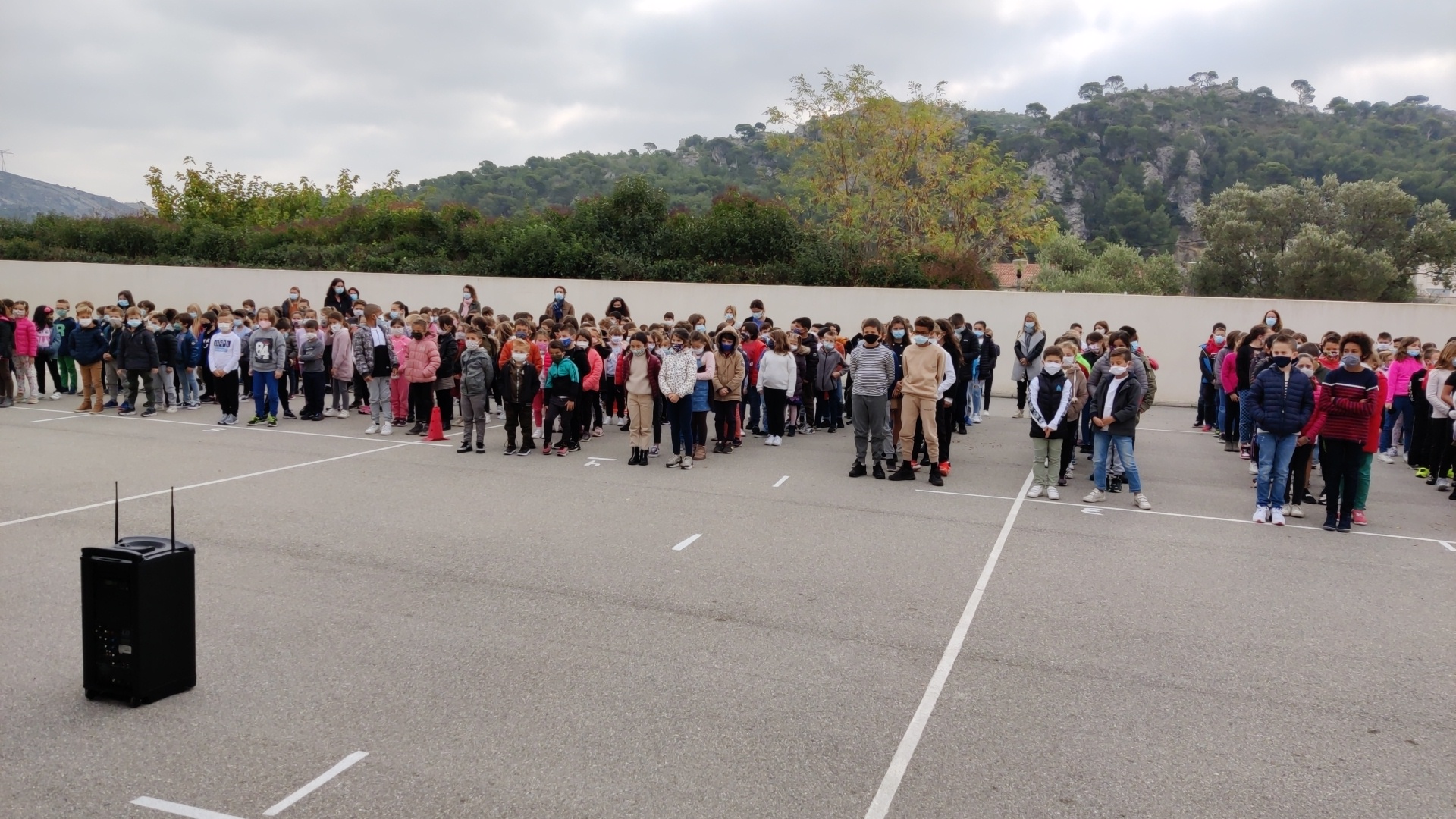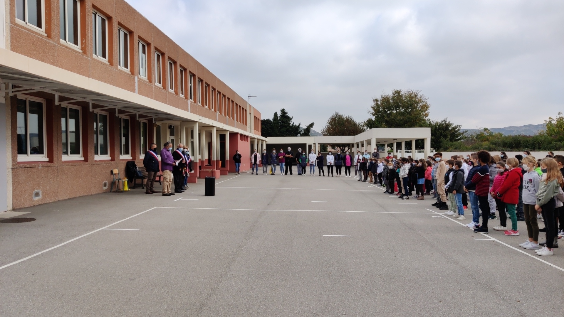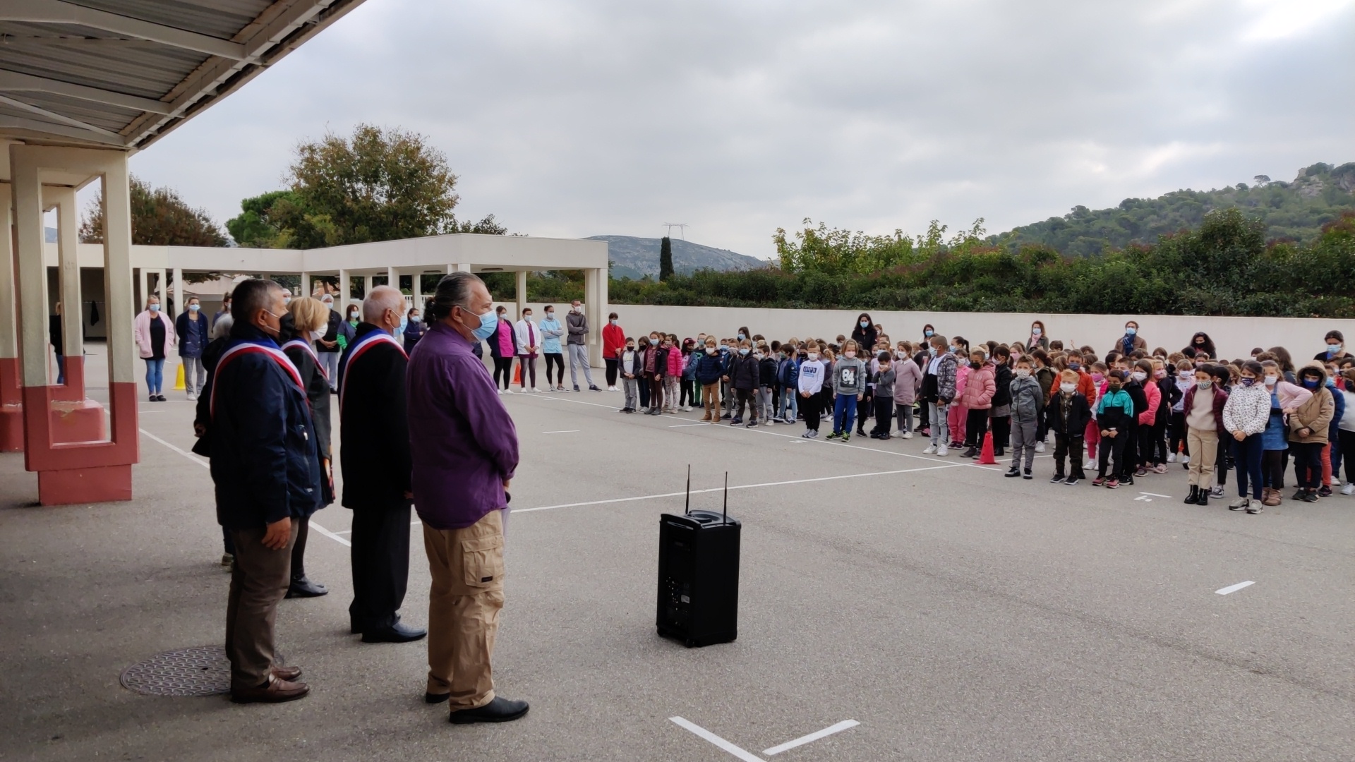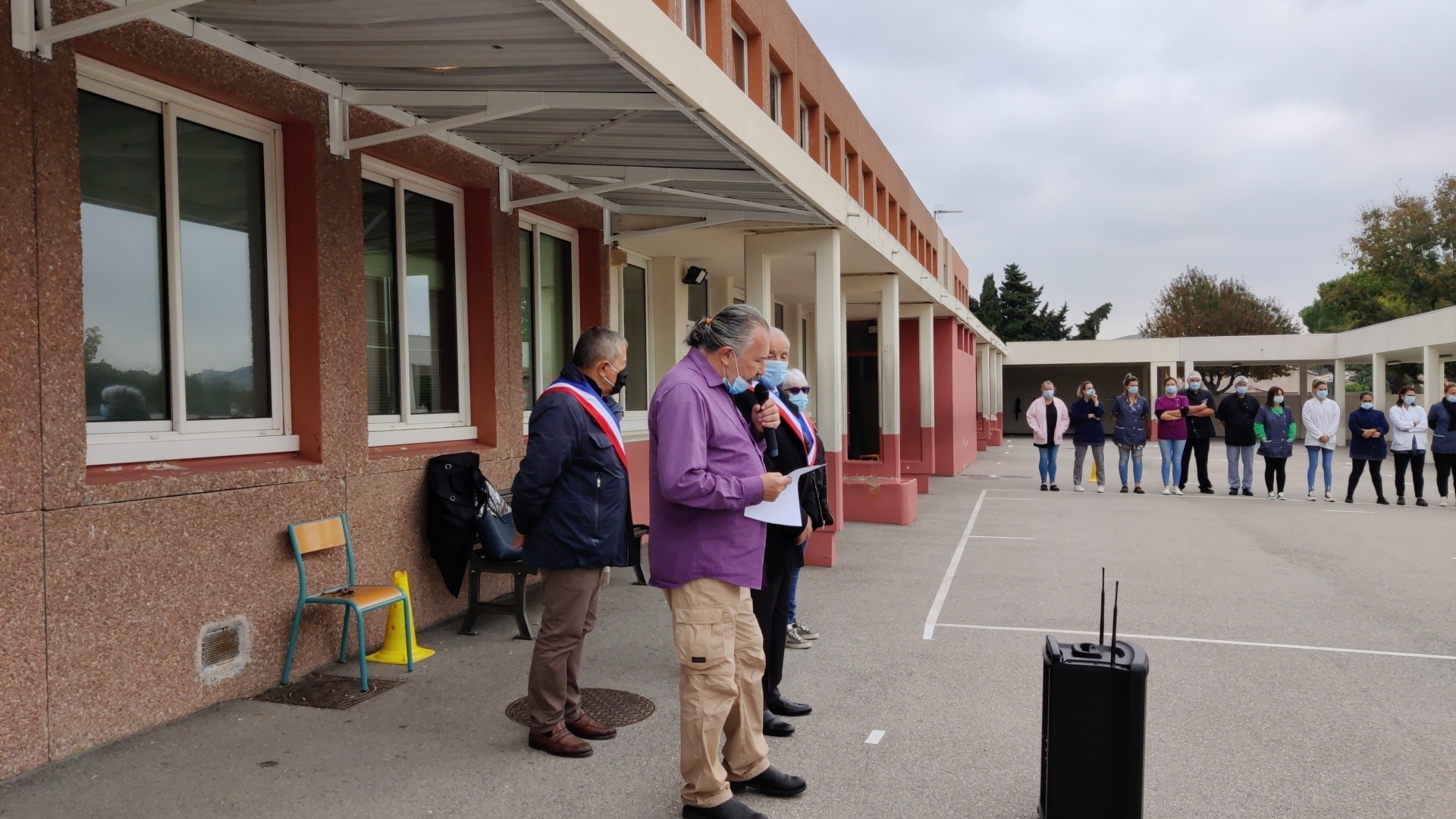 A 11 heures, tous les élèves ont été rassemblés par leur professeur dans leur cour de récréation en ma présence, celle de mon premier adjoint, Paul Sabatino, de l’adjointe aux écoles, Chantal Giraud, de l’adjointe au personnel, Viviane Rosso, ainsi que du personnel communal.