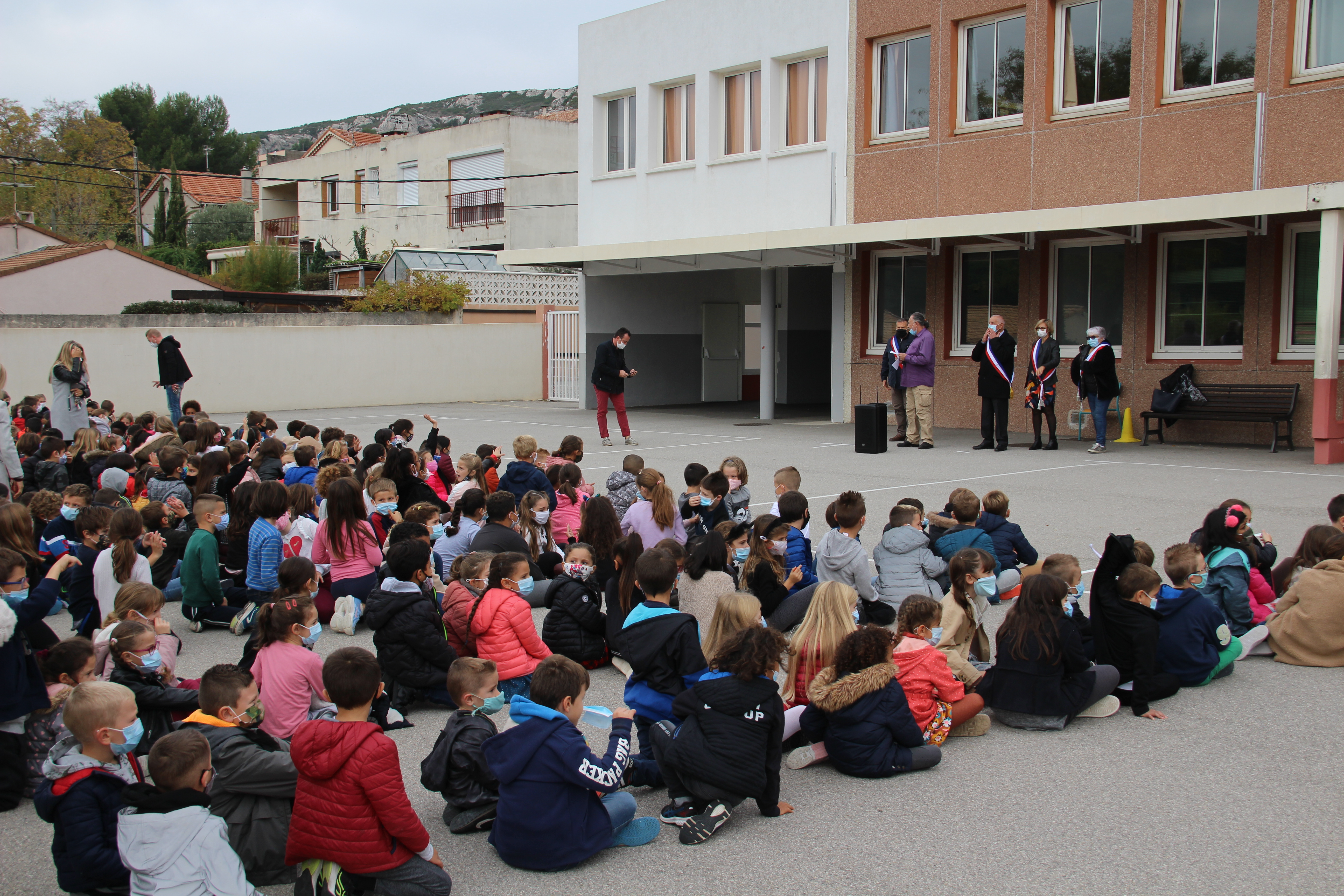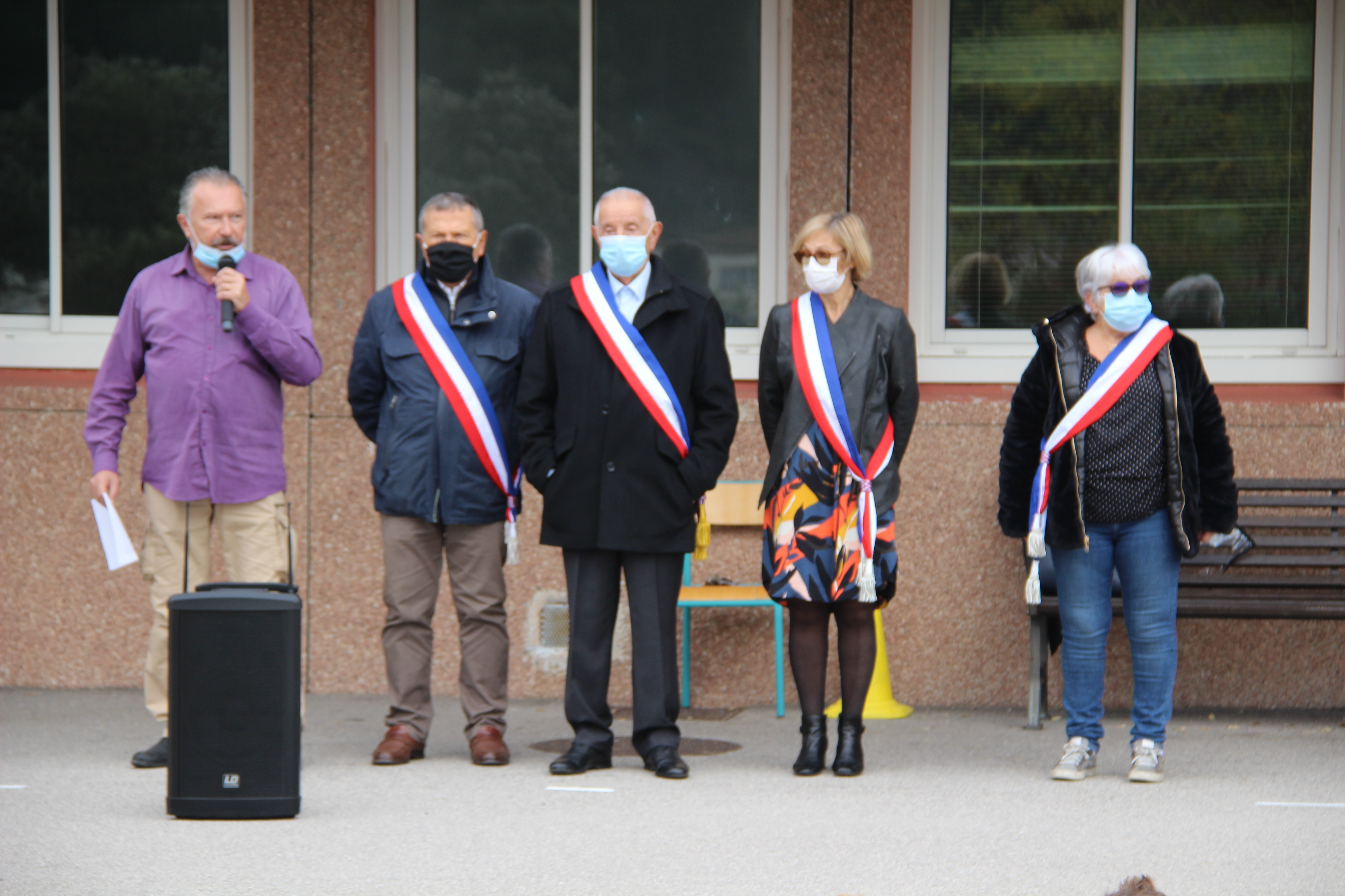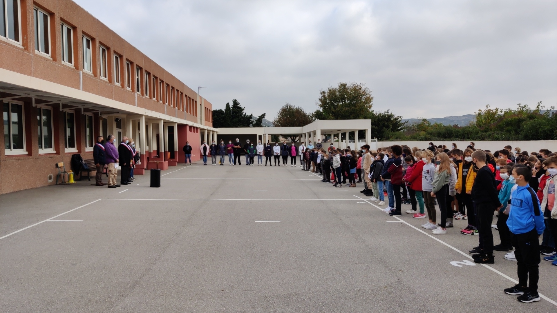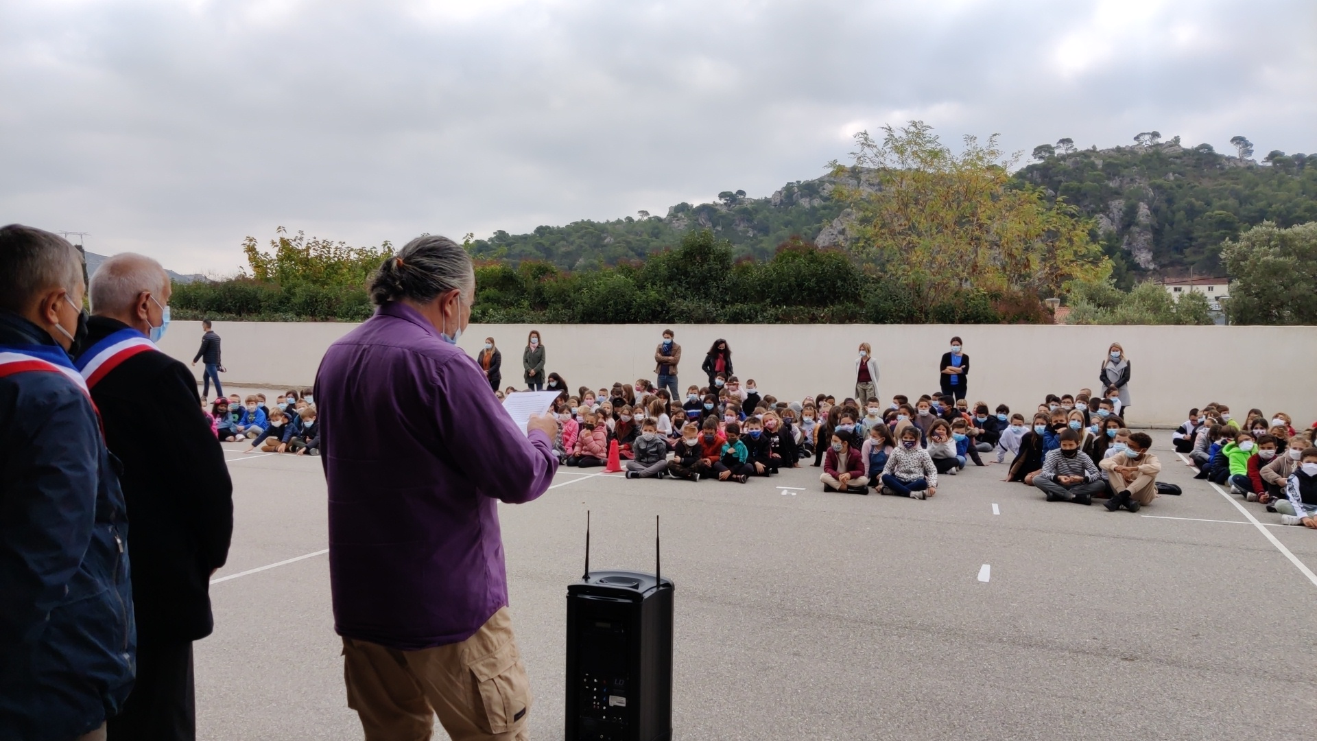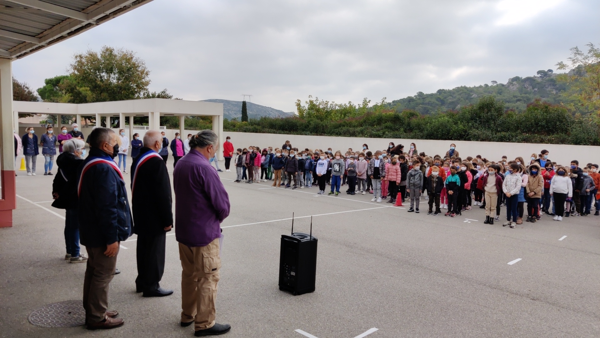 A 11 heures, tous les élèves ont été rassemblés par leur professeur dans leur cour de récréation en ma présence, celle de mon premier adjoint, Paul Sabatino, de l’adjointe aux écoles, Chantal Giraud, de l’adjointe au personnel, Viviane Rosso, ainsi que du personnel communal.