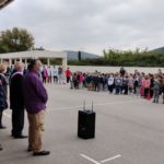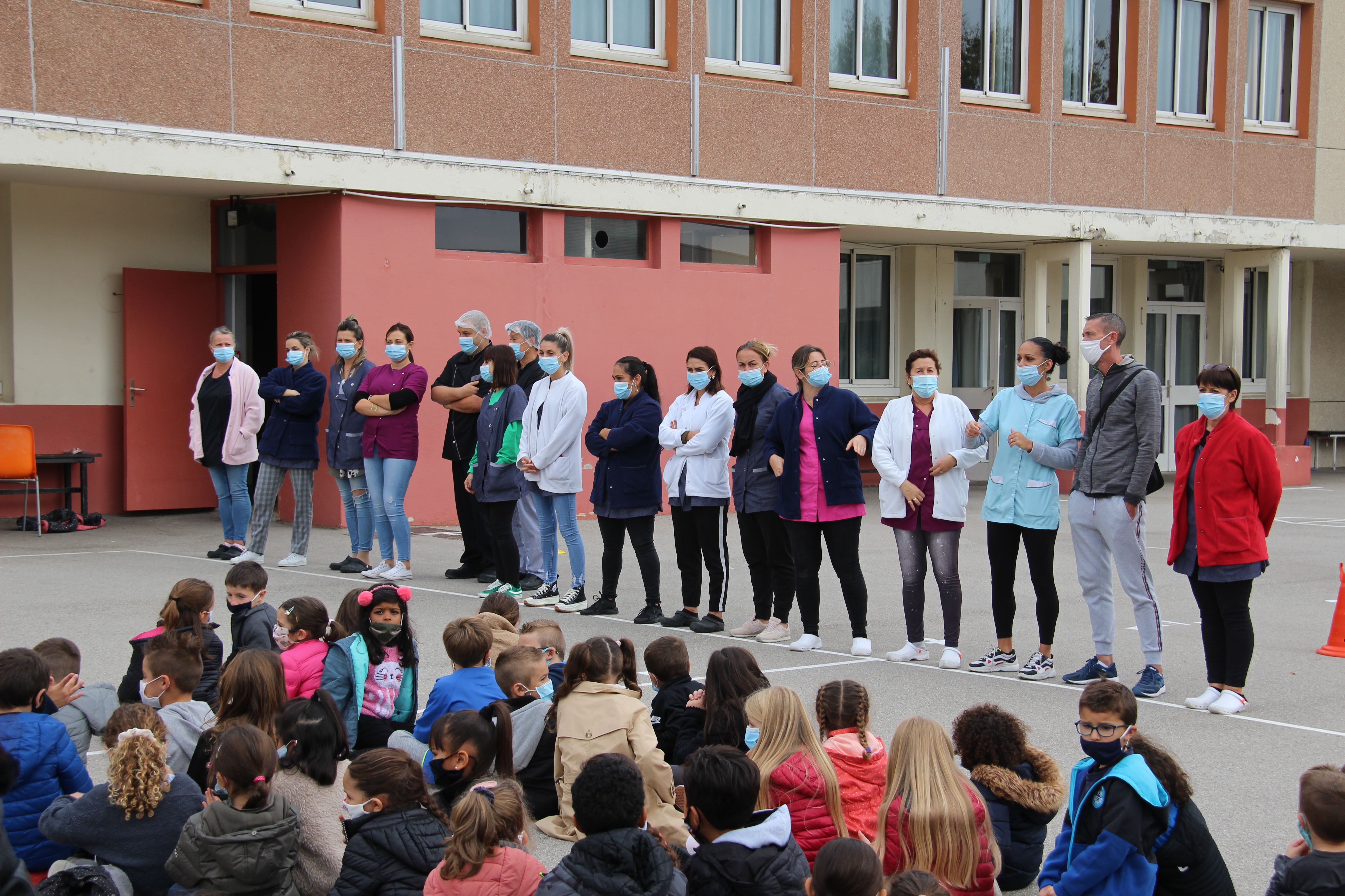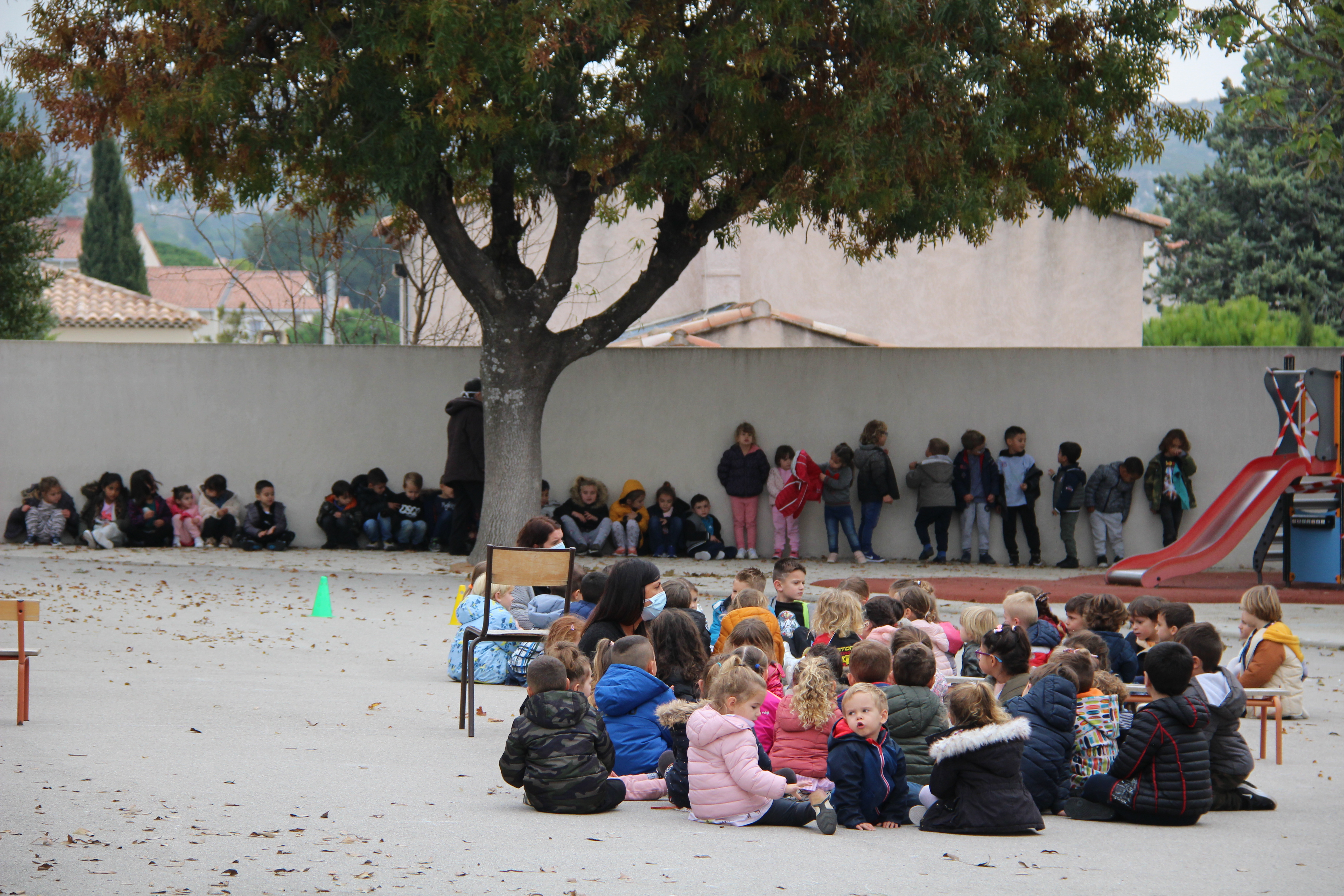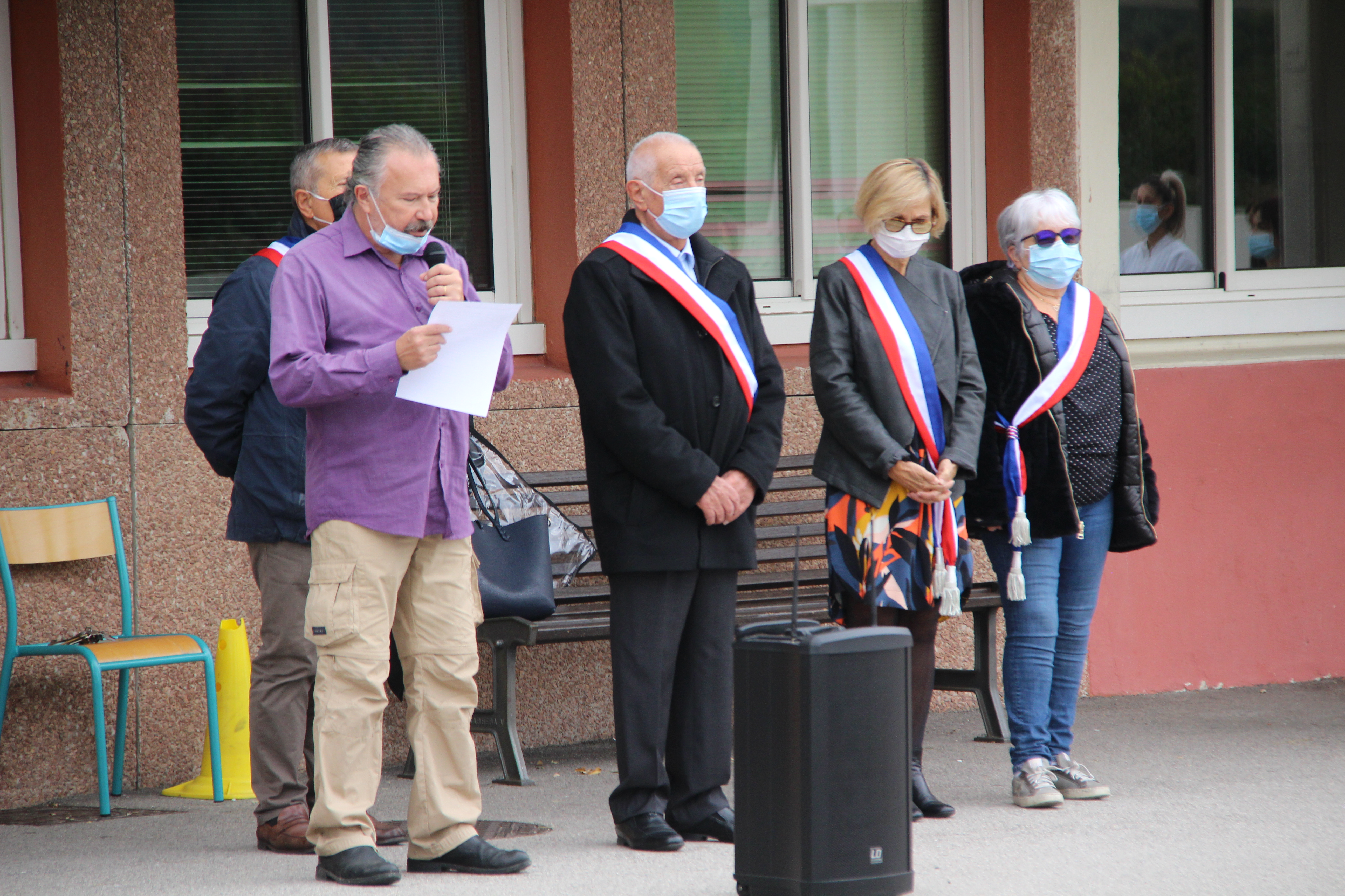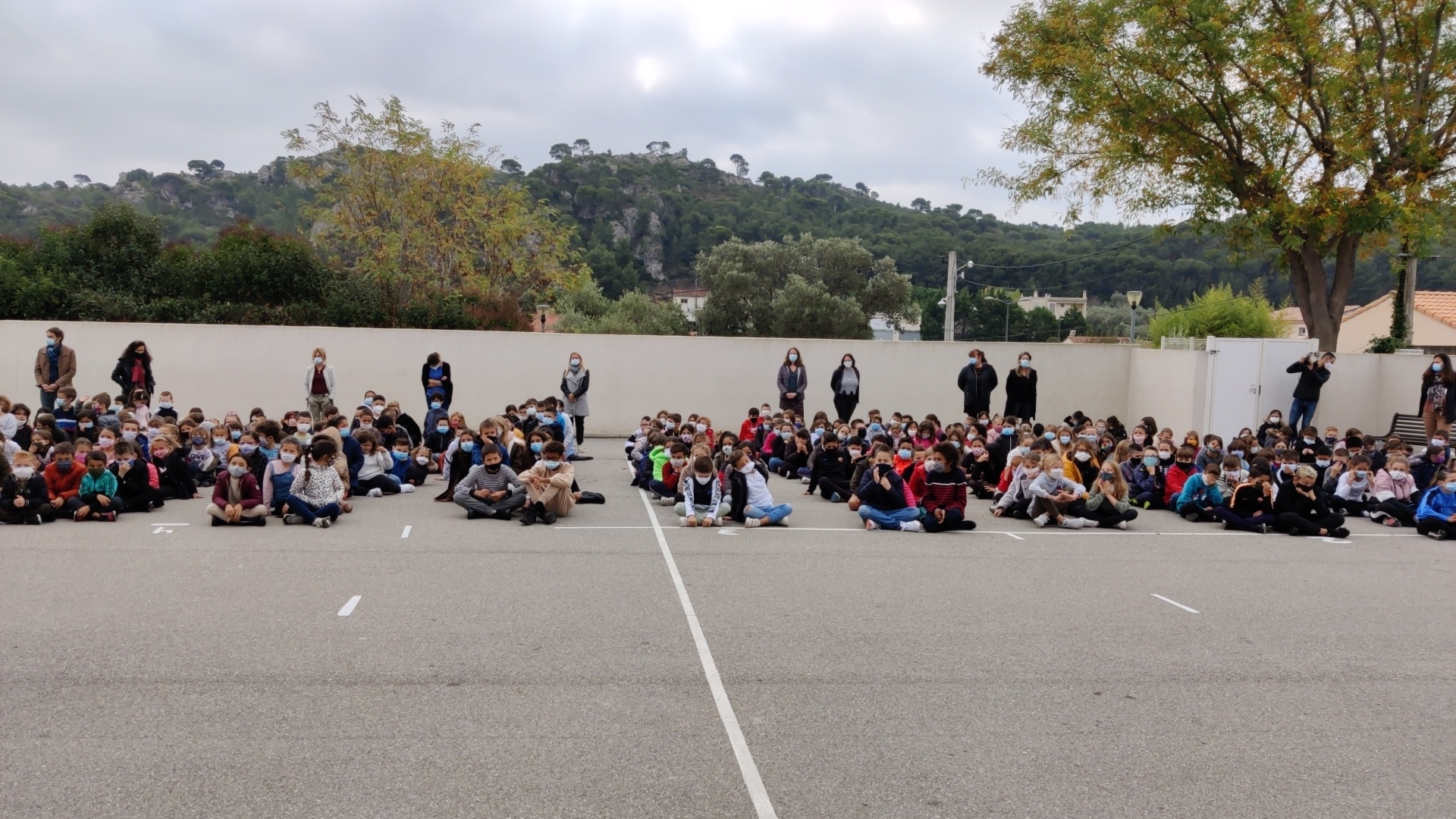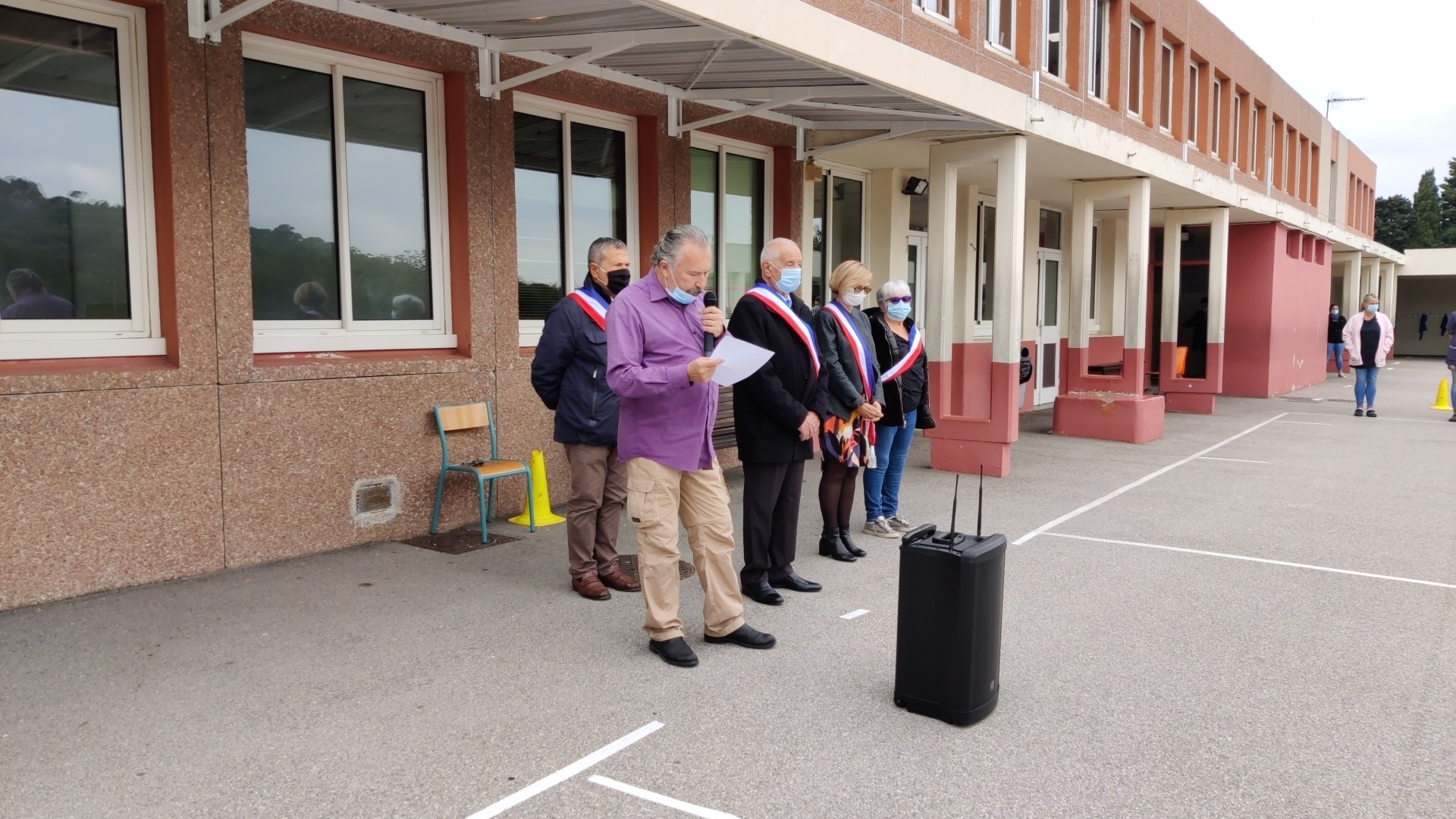 A 11 heures, tous les élèves ont été rassemblés par leur professeur dans leur cour de récréation en ma présence, celle de mon premier adjoint, Paul Sabatino, de l’adjointe aux écoles, Chantal Giraud, de l’adjointe au personnel, Viviane Rosso, ainsi que du personnel communal.