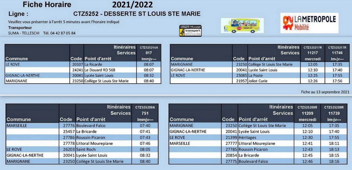 Suite à l'intervention de M. le Maire, les horaires des lignes de transports de Saint Louis et de Sainte Marie ont été avancés de 10 minutes (voir photo ci-jointe). Ces nouveaux horaires seront effectifs à partir de demain, jeudi 16 septembre. La régie des transports, qui vient de nous le confirmer, est chargée d'en informer les élèves.