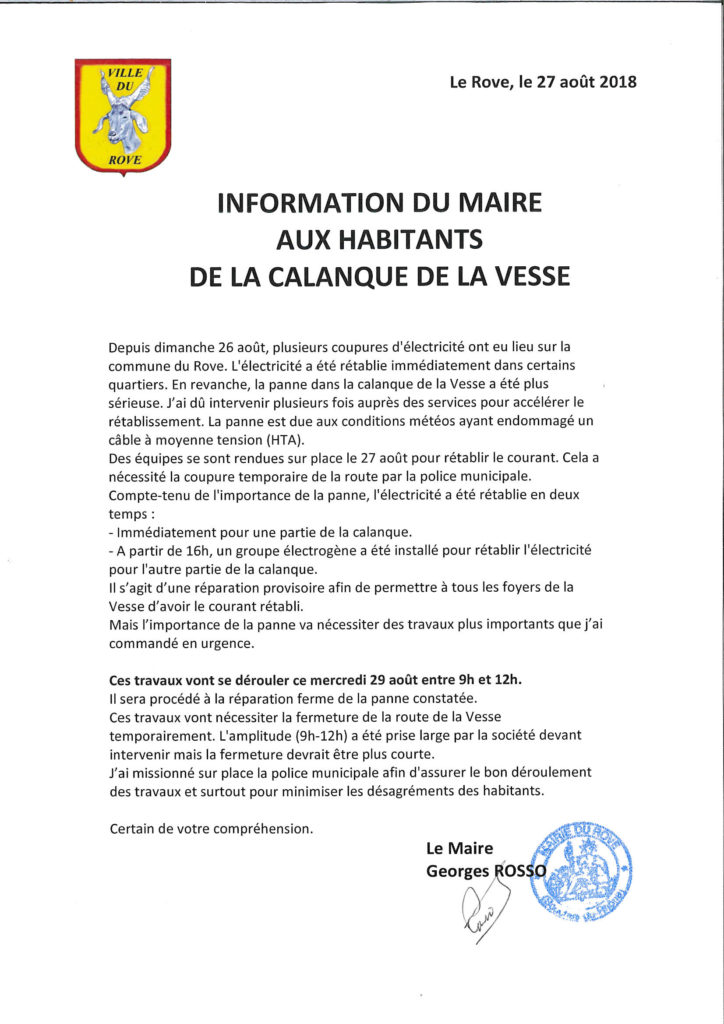 Depuis dimanche 26 août, plusieurs coupures d'électricité ont eu lieu sur la commune du Rove. L'électricité a été rétablie immédiatement dans certains quartiers. En revanche, la panne dans la calanque de la Vesse a été plus sérieuse. J’ai dû intervenir plusieurs fois auprès des services pour accélérer le rétablissement. La panne est due aux conditions météos ayant endommagé un câble à moyenne tension (HTA).