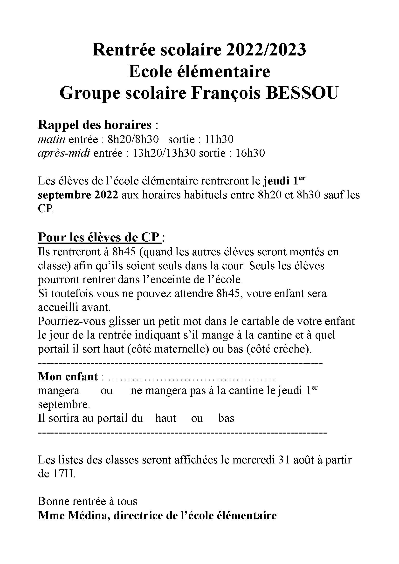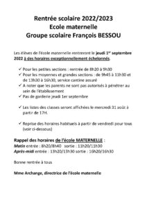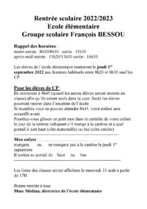 Infos rentrée au groupe scolaire FRANÇOIS BESSOU