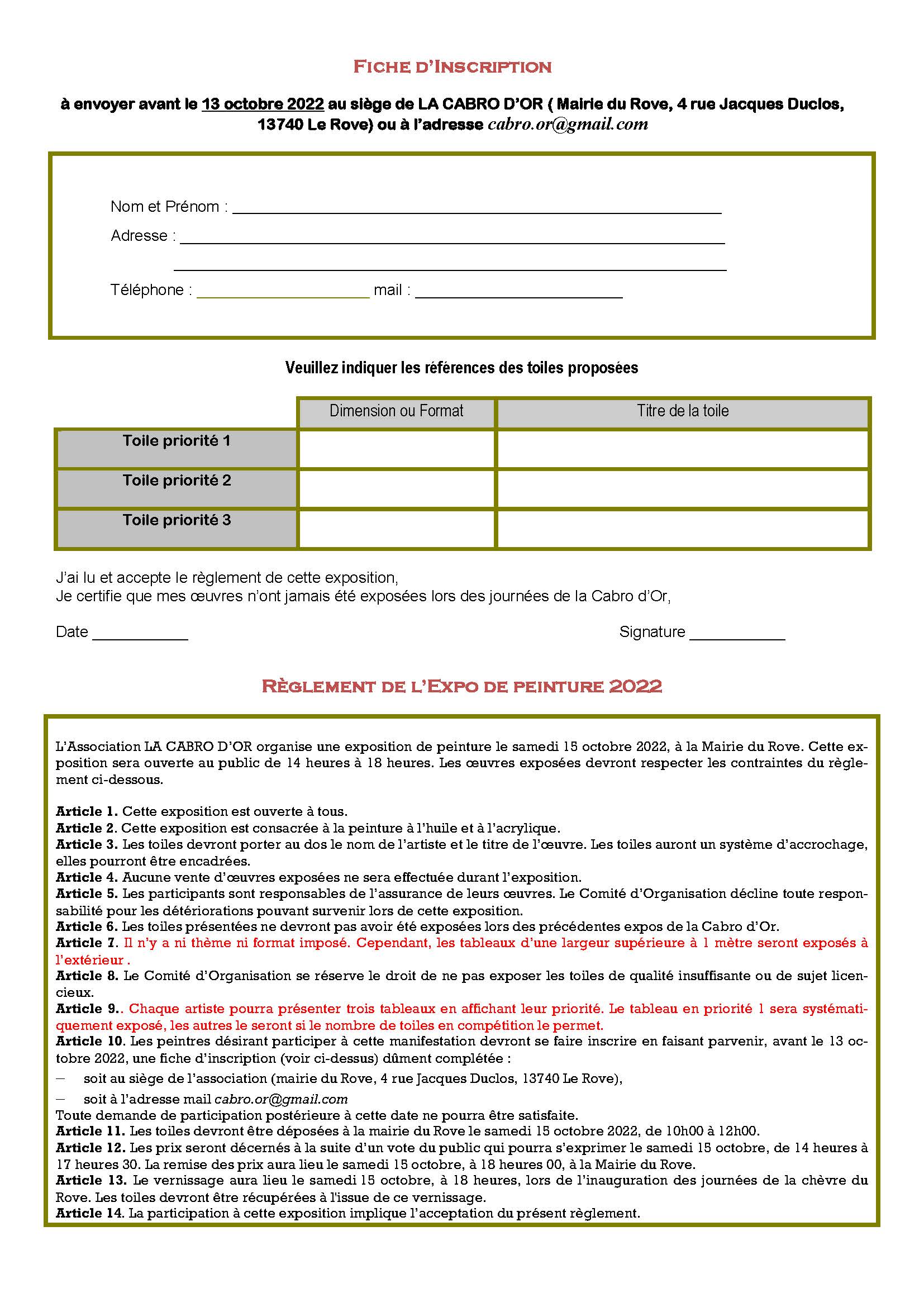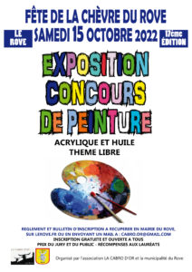 Dans le cadre de la 17ème édition, de notre fête annuelle de la chèvre du Rove (14, 15, 16 octobre 2022), l’Association LA CABRO D’OR en partenariat avec la municipalité du Rove organise un CONCOURS-EXPOSITION DE PEINTURES (huile et acrylique) le samedi 15 octobre 2022, à la Mairie du Rove. Cette exposition sera ouverte au public de 14 heures à 18 heures.