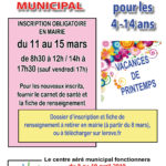 Les inscriptions pour le centre aéré municipal se feront du 11 au 15 mars, de 8h30 à 12h et de 14h à 17h30 (sauf vendredi 17h).