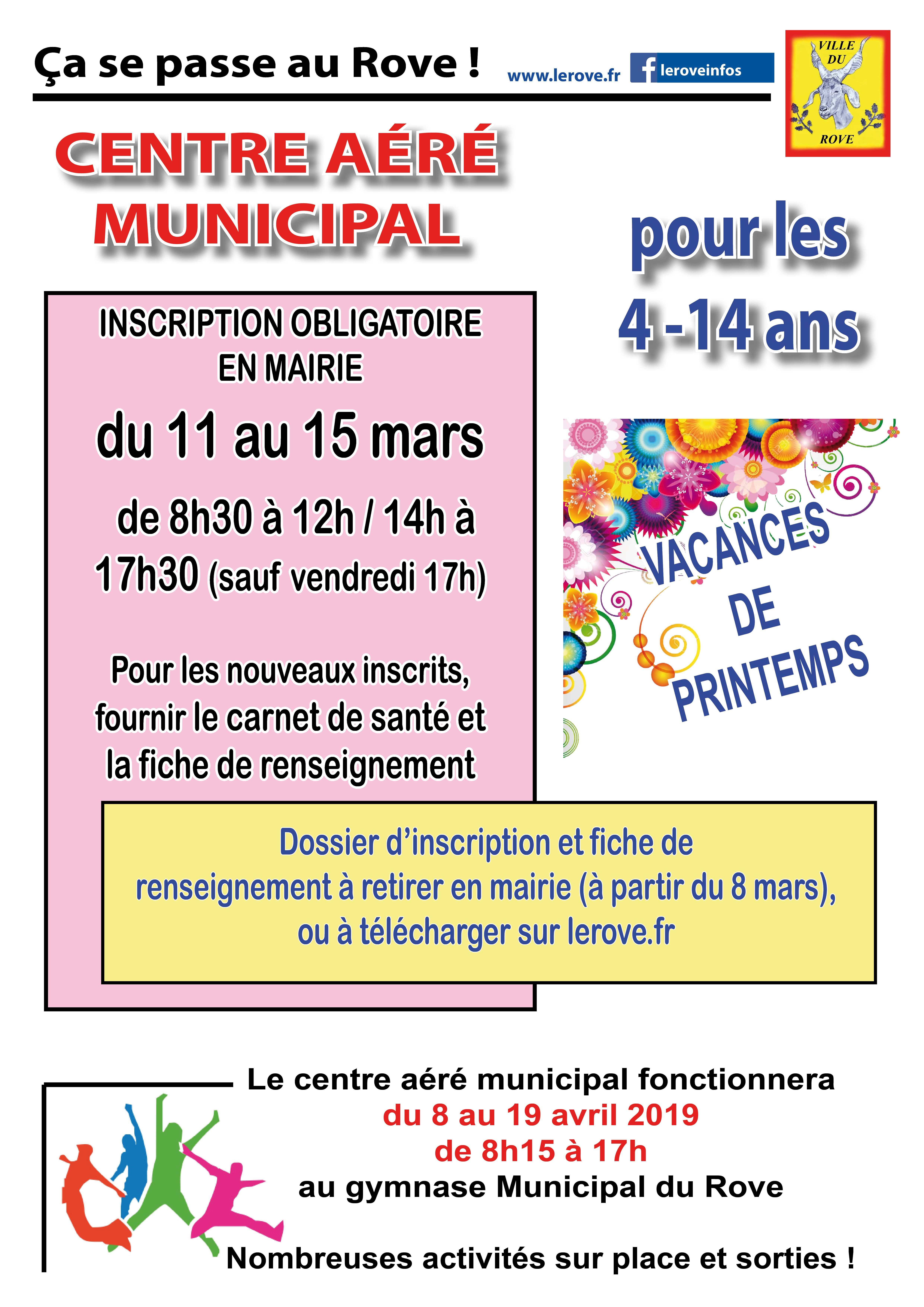 Les dossiers d'inscription et fiche de renseignement sont à retirer en mairie à partir du 8 mars, ou à télécharger sur www.lerove.fr.