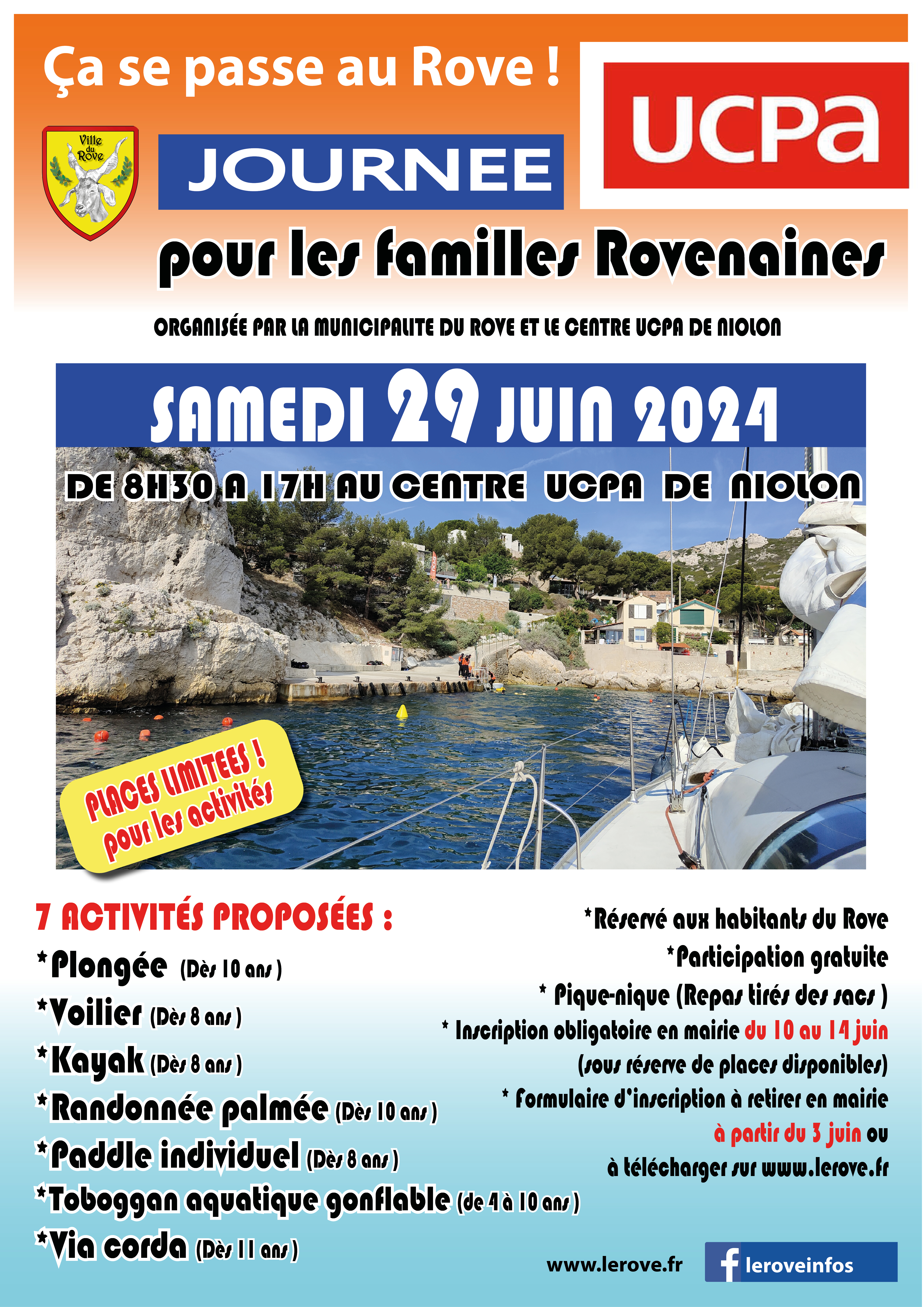 Cette journée, réservée aux habitants domiciliés sur la commune du Rove et entièrement gratuite pour les participants, se déroulera le dimanche 29 juin. L’UCPA met à disposition ses locaux et son personnel tout au long de la journée. Les participants sont répartis en groupe. Chacun peut profiter du large panel d’activités proposées et encadrées par des professionnels. Les participants se retrouvent le midi sous les pins autour d’un apéritif et d’un pique-nique (repas tirés des sacs).