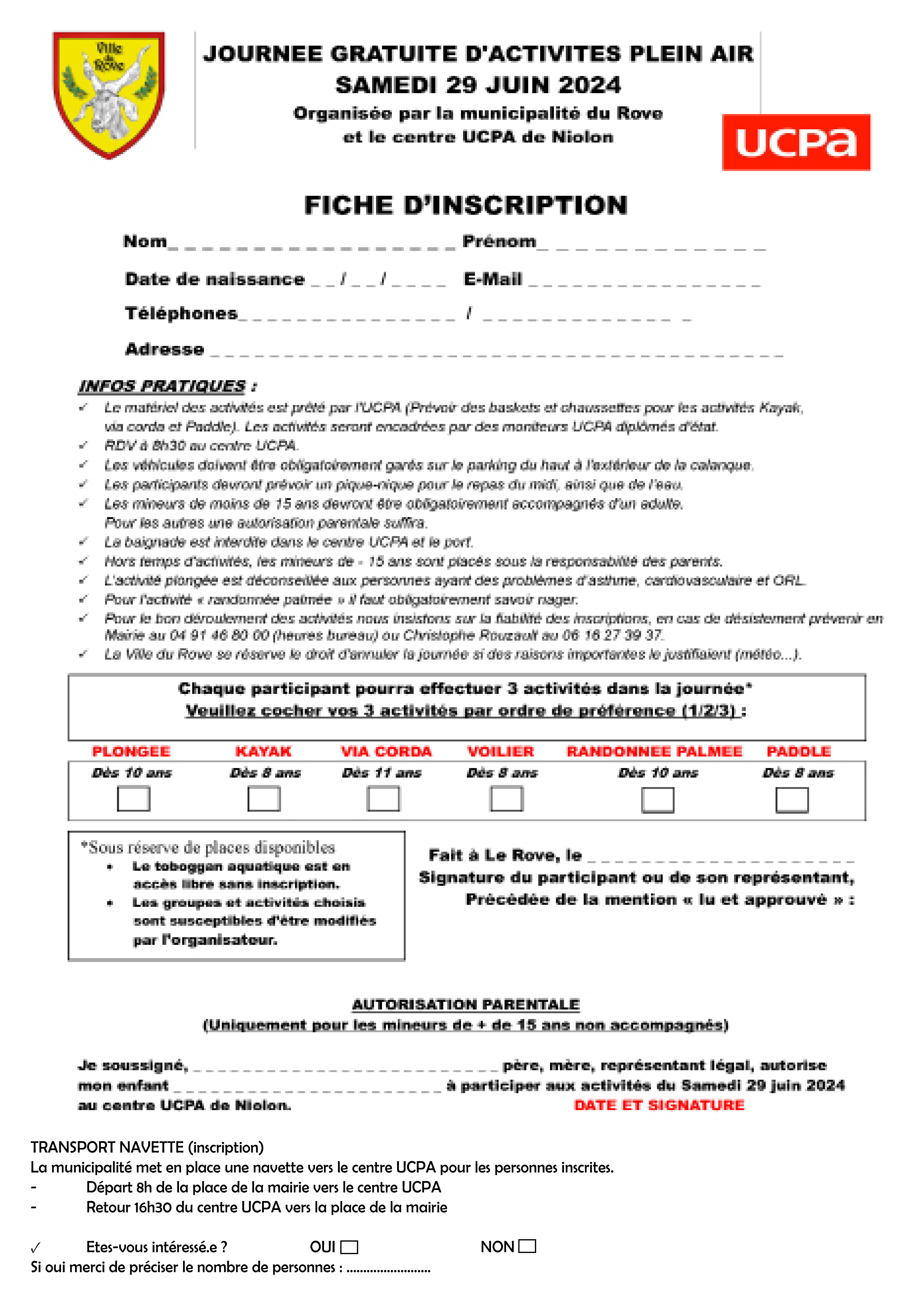 L’inscription obligatoire, gratuite et limitée se fera en mairie du 10 au 14 juin. Les formulaires d’inscription sont à retirer en mairie à partir du 3 juin ou ci-dessous.