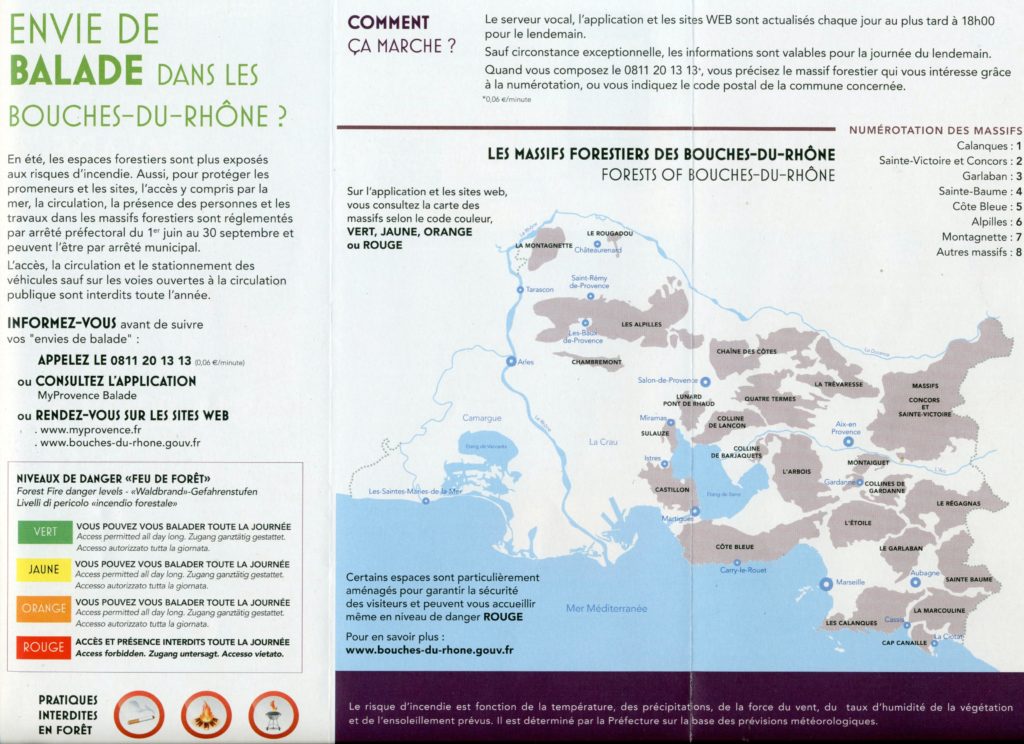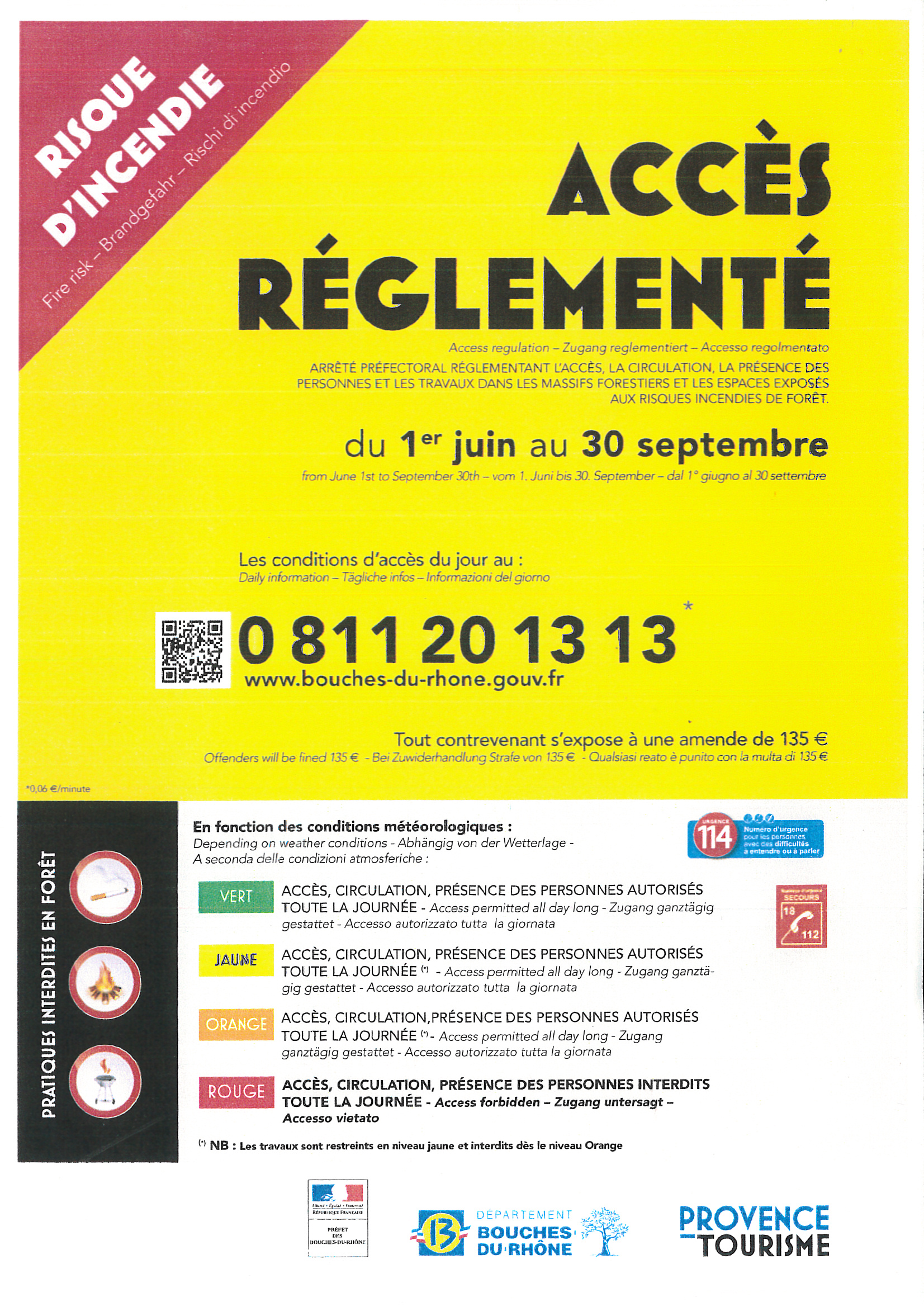 Dans les Bouches-du-Rhône, du 1er juin au 30 septembre inclus, l’accès y compris par la mer, la circulation, la présence des personnes et les travaux dans les massifs forestiers et dans les espaces exposés sont règlementés par arrêté préfectoral.