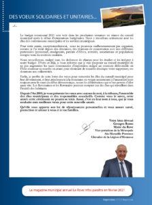 Enfin, je profite de cette lettre des vœux pour remercier les élus du conseil municipal pour leur dévouement, et leur attachement à la commune en votant notamment à l’unanimité mais toujours avec le souci du débat démocratique, toutes les délibérations qui m’ont permis d’aller aussi vite. Les Rovenaines et les Rovenains peuvent compter sur des élus qui travaillent dans l’intérêt des habitants.