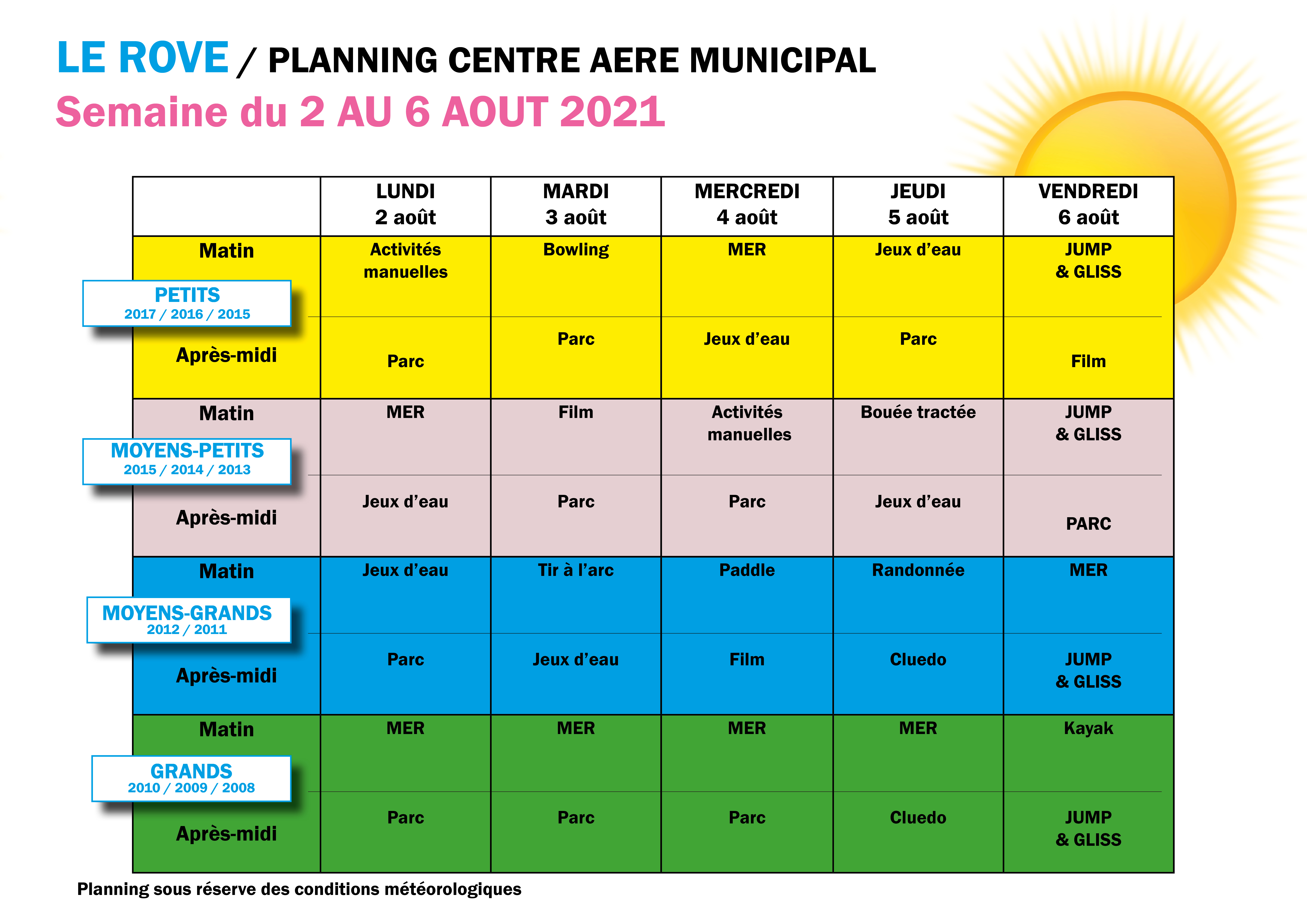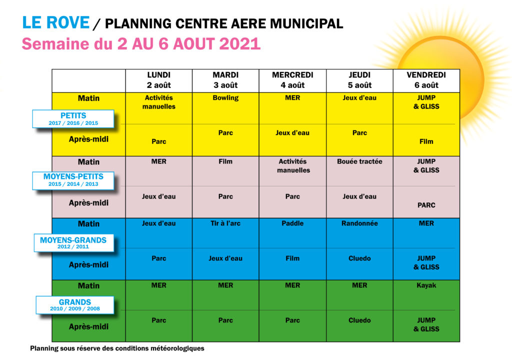 > Le planning des activités sera normalement publié chaque vendredi pour la semaine suivante (sur internet et par affichage au centre). Les plannings peuvent être modifiés en raison des conditions météorologiques. Planning centre aéré DU 8 AU 16 JUILLET 2021