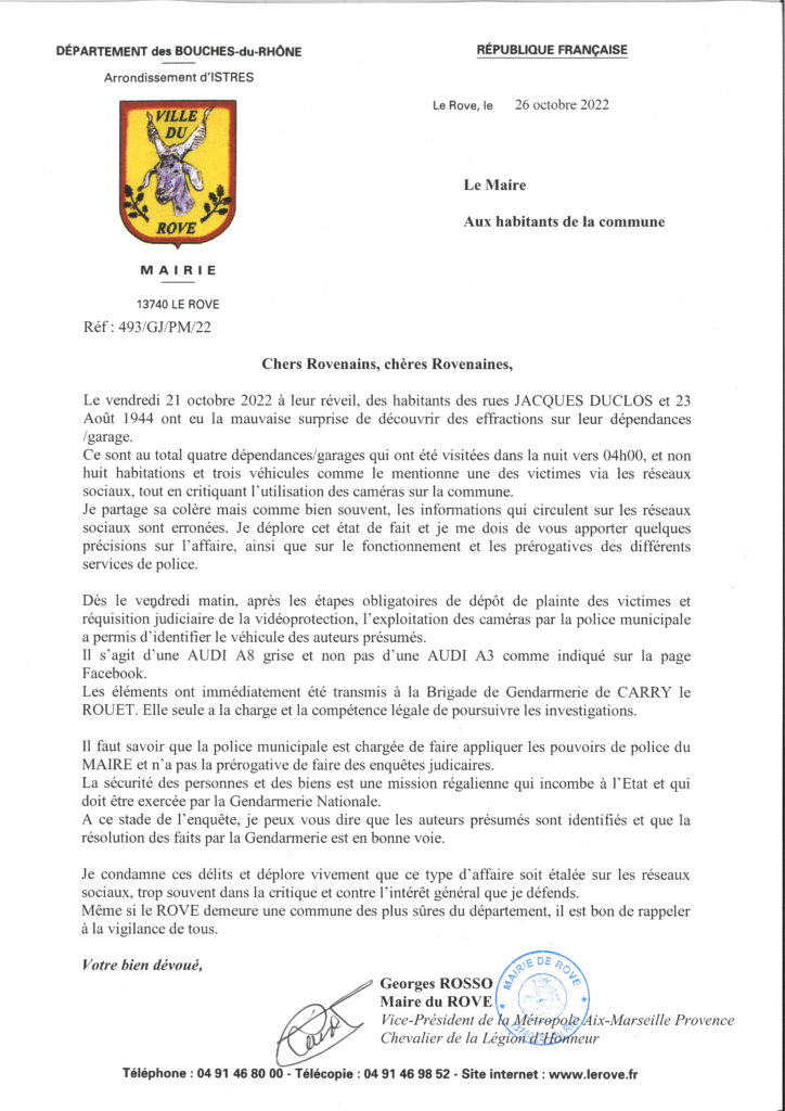 Même si le ROVE demeure une commune des plus sûres du département, il est bon de rappeler à la vigilance de tous.