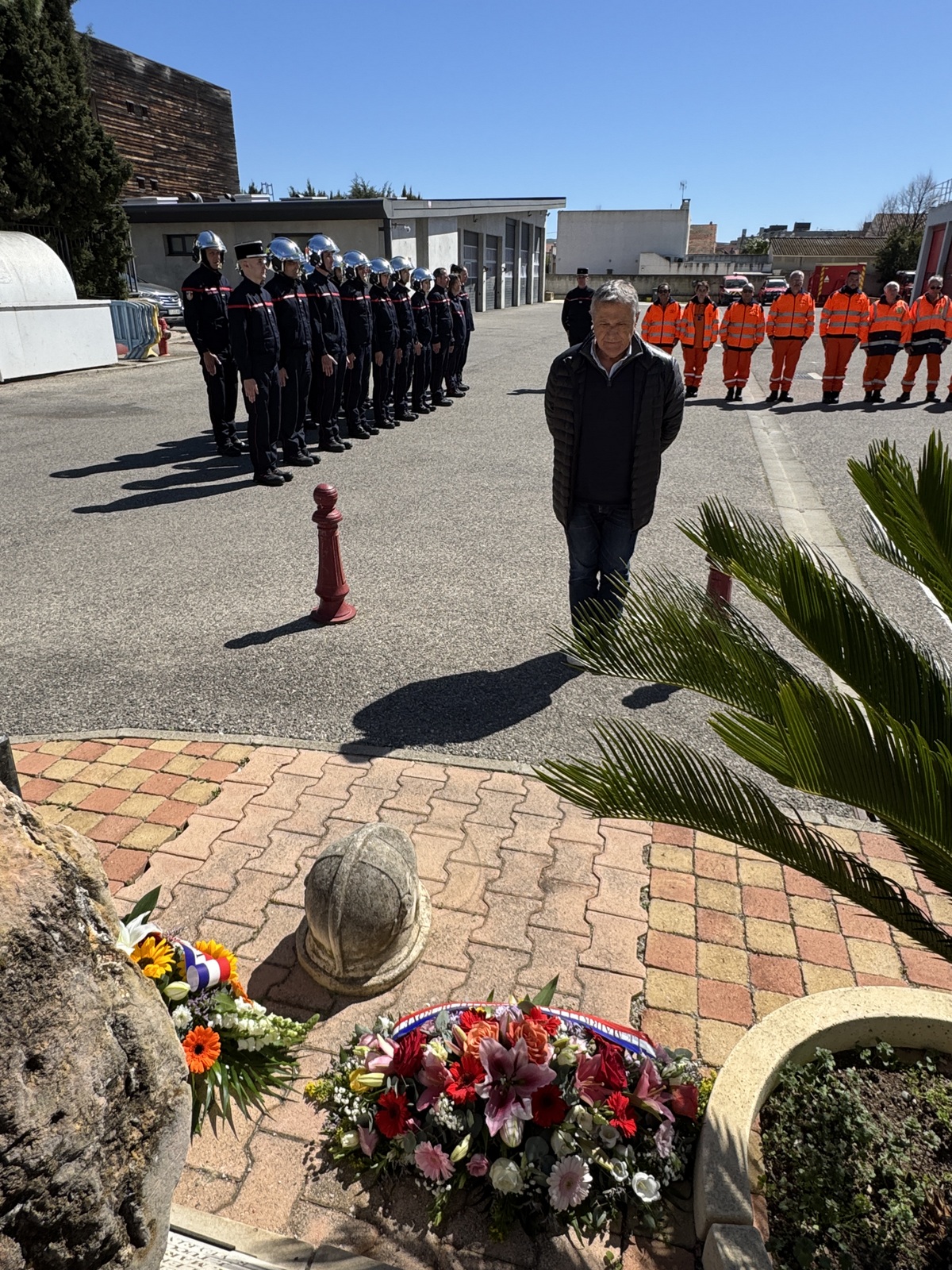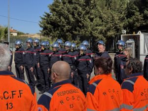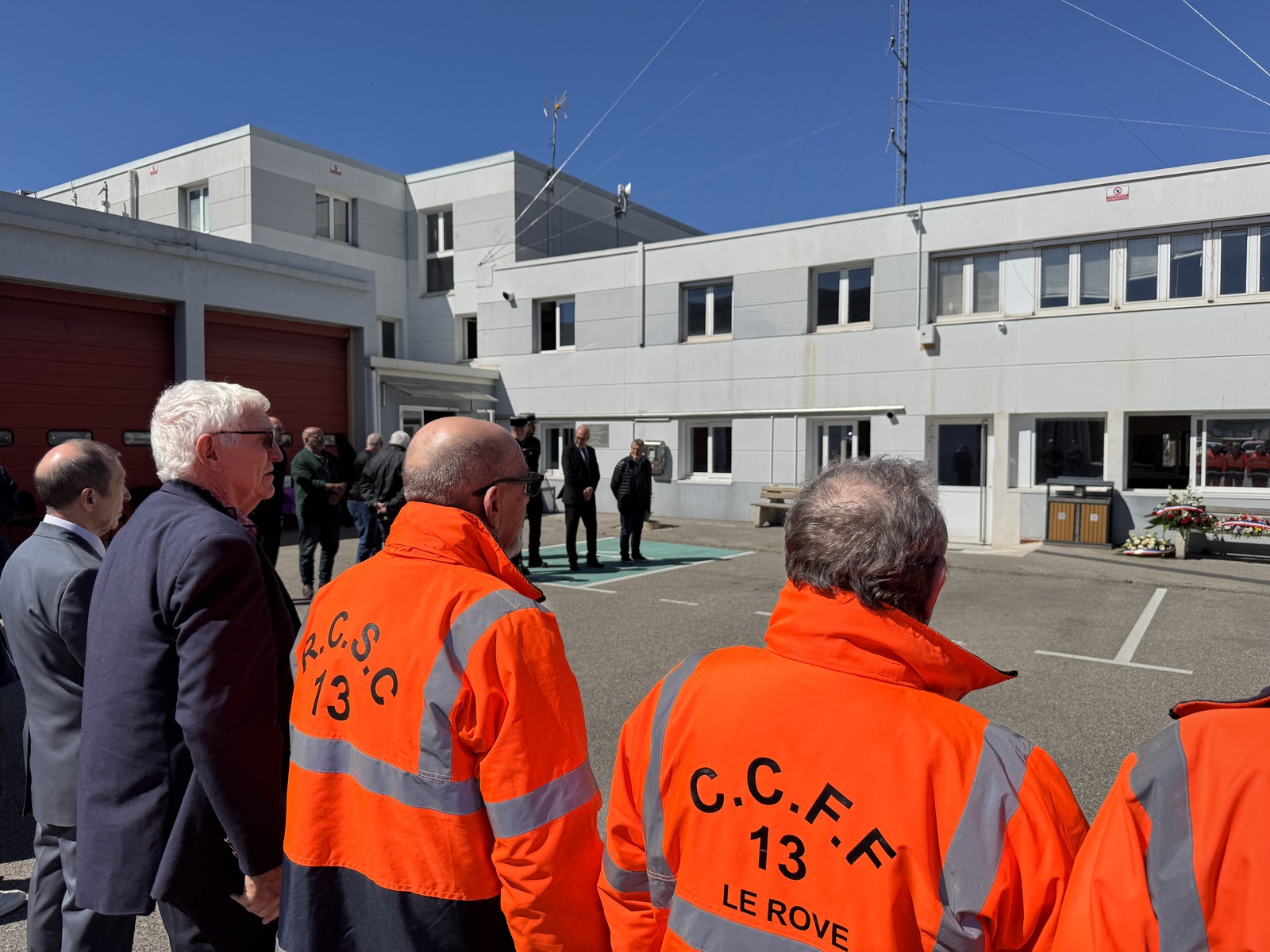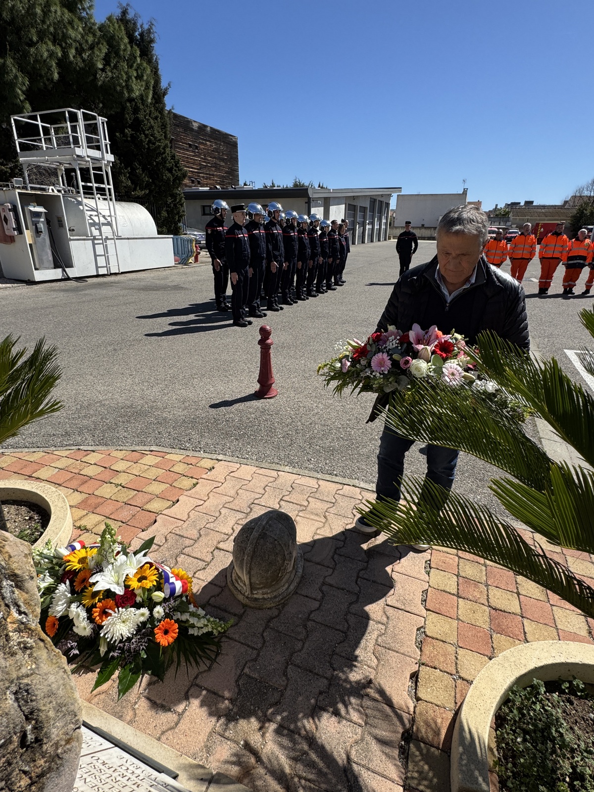Autour du maire Paul SABATINO et de son premier adjoint Francis MONTALBAN et de Michel JAUFFRET, adjoint à l’environnement, étaient rassemblés devant le monument aux morts de la caserne, les sapeurs-pompiers, les officiels, le chef de centre de la caserne de Marignane le capitaine LEMOINE, ainsi que les représentants des membres bénévoles du CCFF de la commune du Rove.